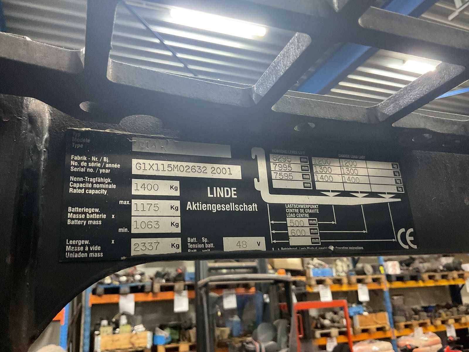 Voorzien van: triplex mast, acculader, geveerde stoel Nee Merk: Linde Type: R14 Bouwjaar: 2001 Brandstof: Elektrisch Aantal wielen: 3 Afgelezen urenstand: 219 Accu lader: true Triple mast: true Eigen gewicht: 3400kg Lepellengte: 1200mm Hefhoogte: 5150mm Minimale doorrijhoogte: 2500mm Totale afmeting L: 1700mm Totale afmeting Breedte: 1250mm Totale afmeting Hoogte: 2500mm Elektrisch: true Vol rubber banden: true