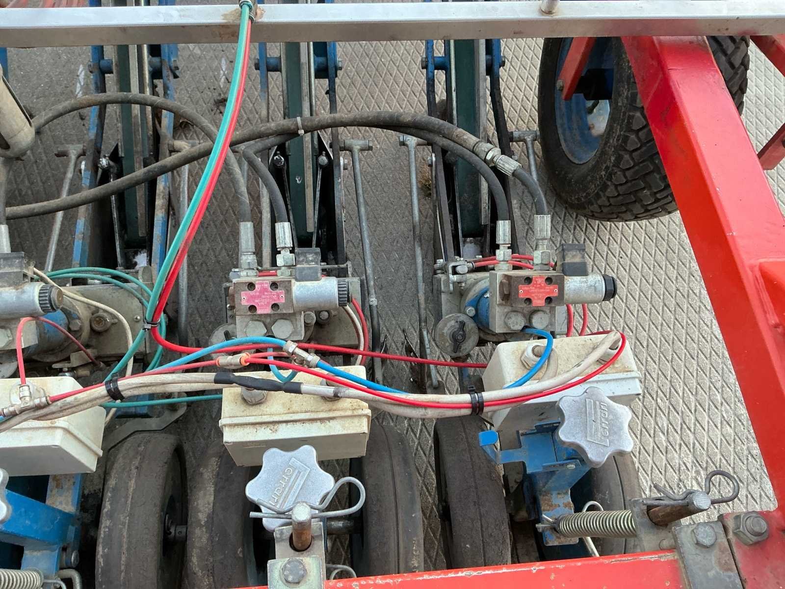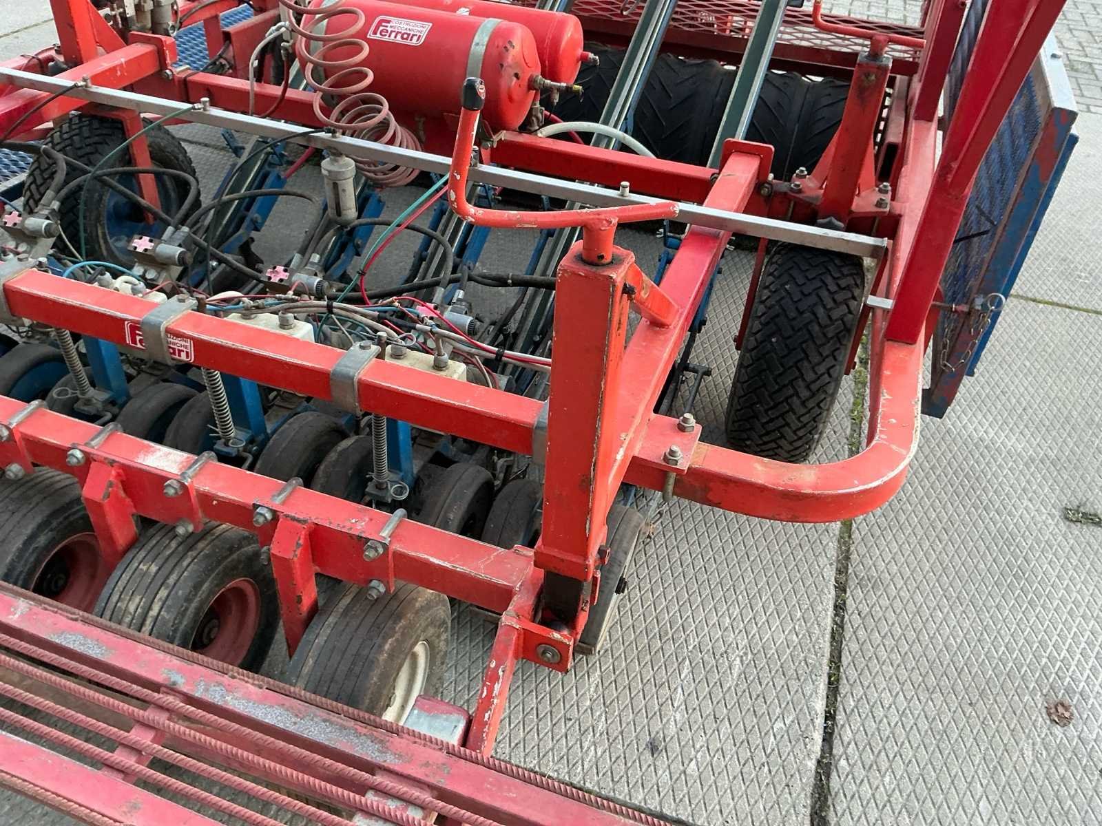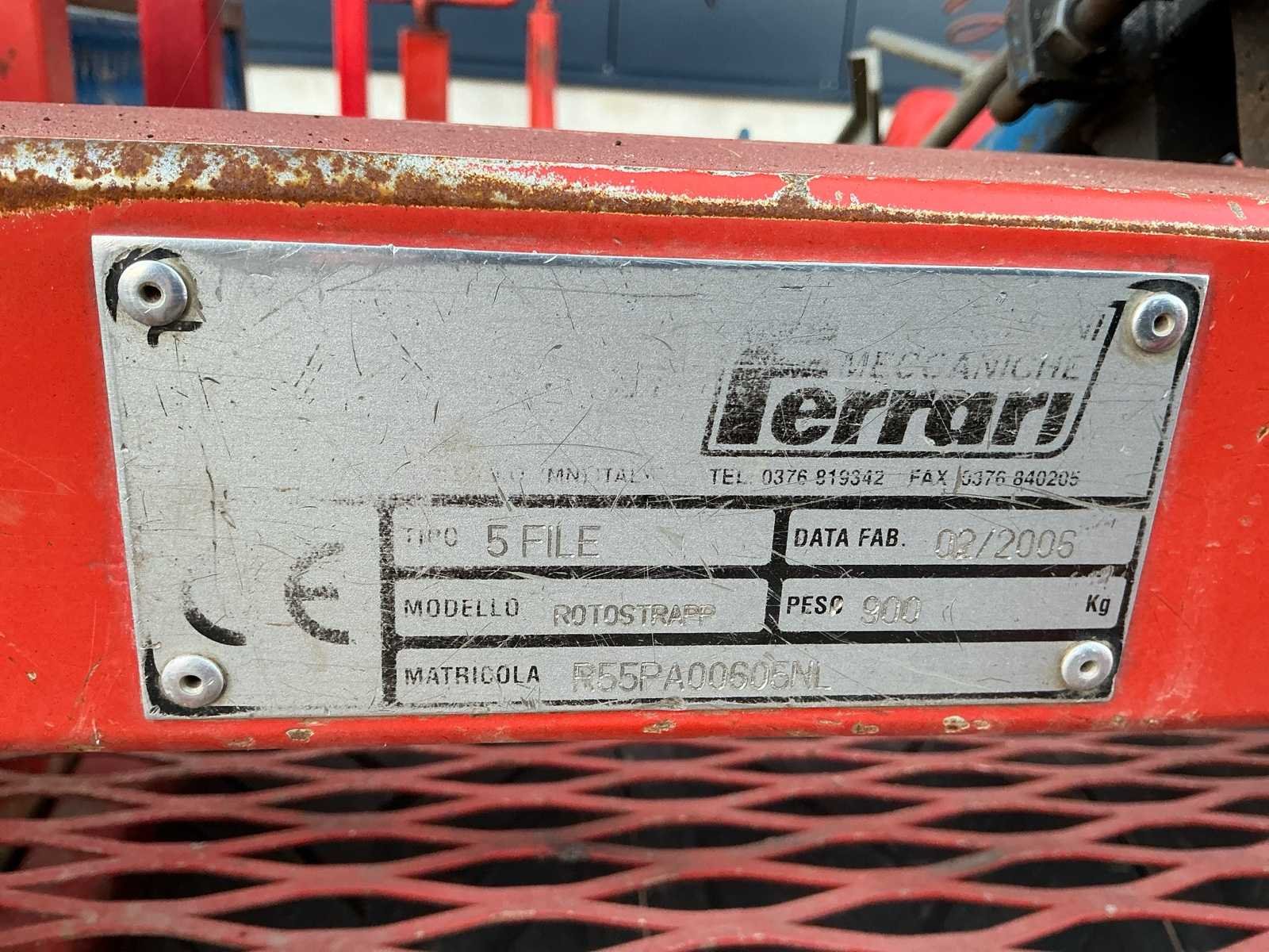 Aftakas aangedreven; voorzien van eigen hydrauliek en compressor; rol om bed te vlakken (195cm); 5 rijen “5 op 31cm”; spoorbreedte 185cm; afstand per plant afstelbaar; aandrukwielen tussen de regels Nee Merk: Ferrari Type: 5 FILE Bouwjaar: 2006 Serienummer: R55PA00605NL Werkbreedte: 1500mm Aantal rijen: 5 Eigen gewicht: 900kg Totale afmeting L: 3550mm Totale afmeting Breedte: 2450mm Totale afmeting Hoogte: 1450mm
