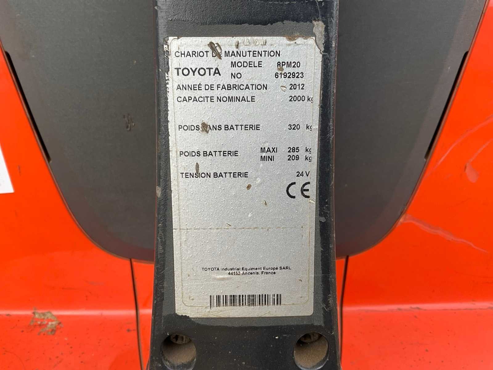 Goed werkend, voorzien van: Still TPX acculader, 24V accu, code beveiliging, veiligheidskeuring, Nee Merk: Toyota Type: 8PM20 Bouwjaar: 2012 Serienummer: 6192923 Hefvermogen: 2000kg Lepellengte: 1150mm Accu lader: true Totale afmeting Breedte: 720mm