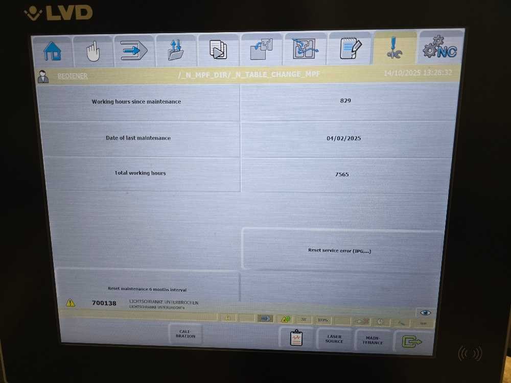 Complete fiber laser snijmachine inclusief Donaldson Torit DCE afzuiging en seperate koeler; voorzien van 8kw IPG fiber laser bron; snijuren 14-10-2025: 7562 uur; machine wordt professioneel gedemonteerd en verladen op uw transport (bijkomende kosten staan apart vermeld tijdens het bieden) Nee Merk: LVD Type: Phoenix FL 6020 Bouwjaar: 2020 Serienummer: 38661 Laservermogen: 8kW Werkbereik x: 6000mm Werkbereik y: 2000mm Aansluiting: 400V