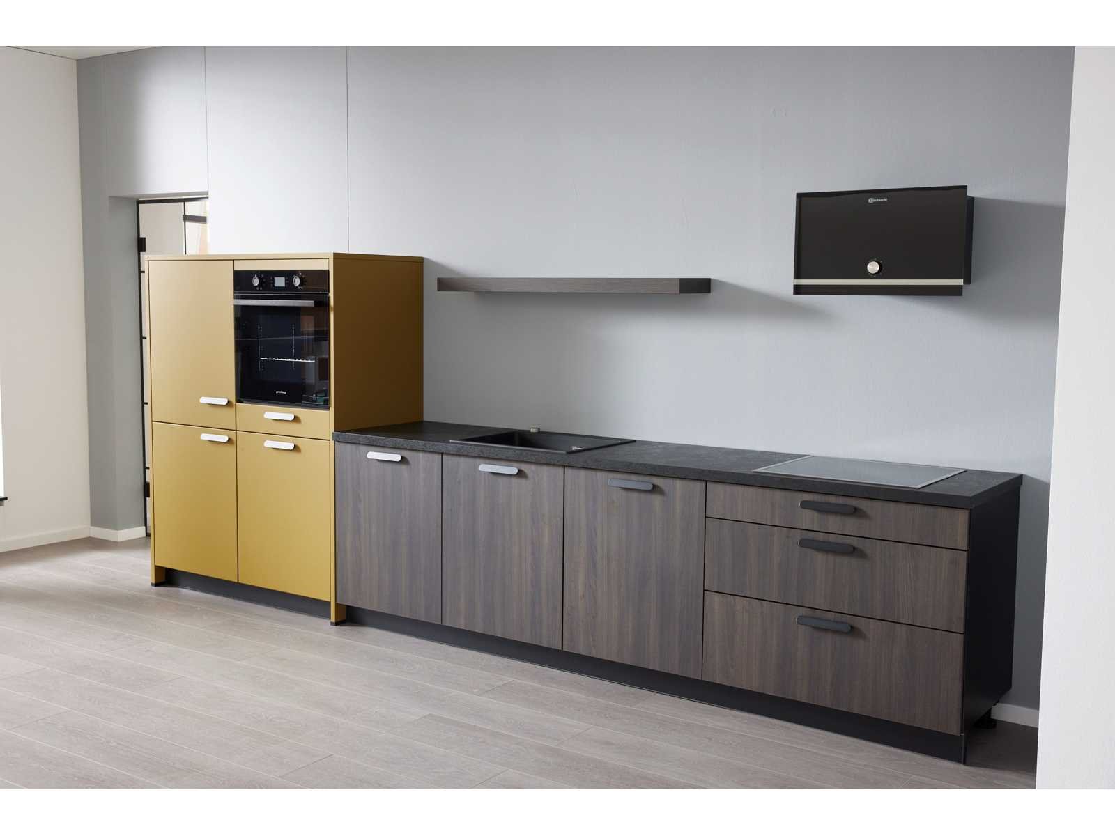 Keuken komt zonder apparatuur; reeds gedemonteerd en ingepakt op pallets. (afstapelen, omruilen of statiegeld per pallet); Pallets zijn niet inbegrepen; statiegeld betalen bij afhalen, of pallets afstapelen; werkblad niet ingepakt op pallets (25-SCH-02553) Nee Merk: Schüller Type keukenopstelling: Recht Lengte: 395cm Breedte: 60cm Hoogte: 159,5cm Werkblad hoogte: 85,4cm Aanrechtblad: Onyxzwart structuur Softclose: true Kleur: Eiken siena synchroonprint imitatie
