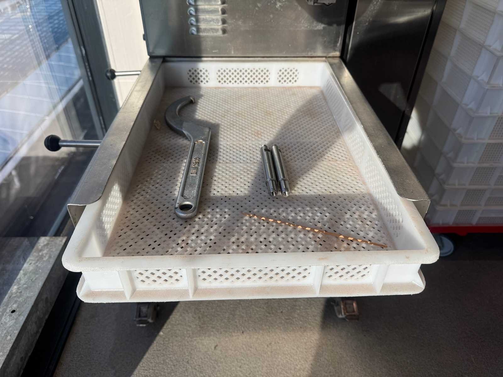 Incl. transportkarren met kratten. No Merk: Dominioni Model: P55R Lengte: 750mm Breedte: 950mm Hoogte: 1530mm