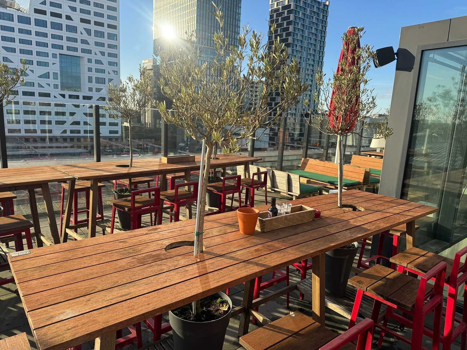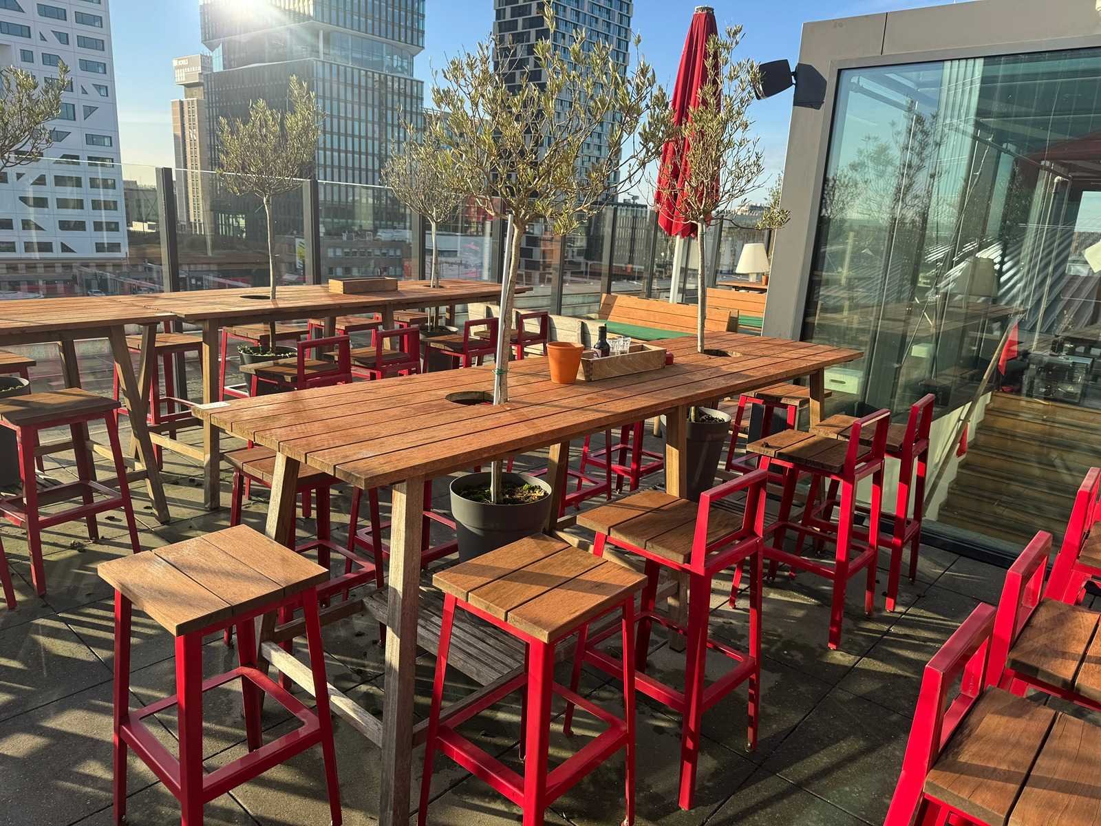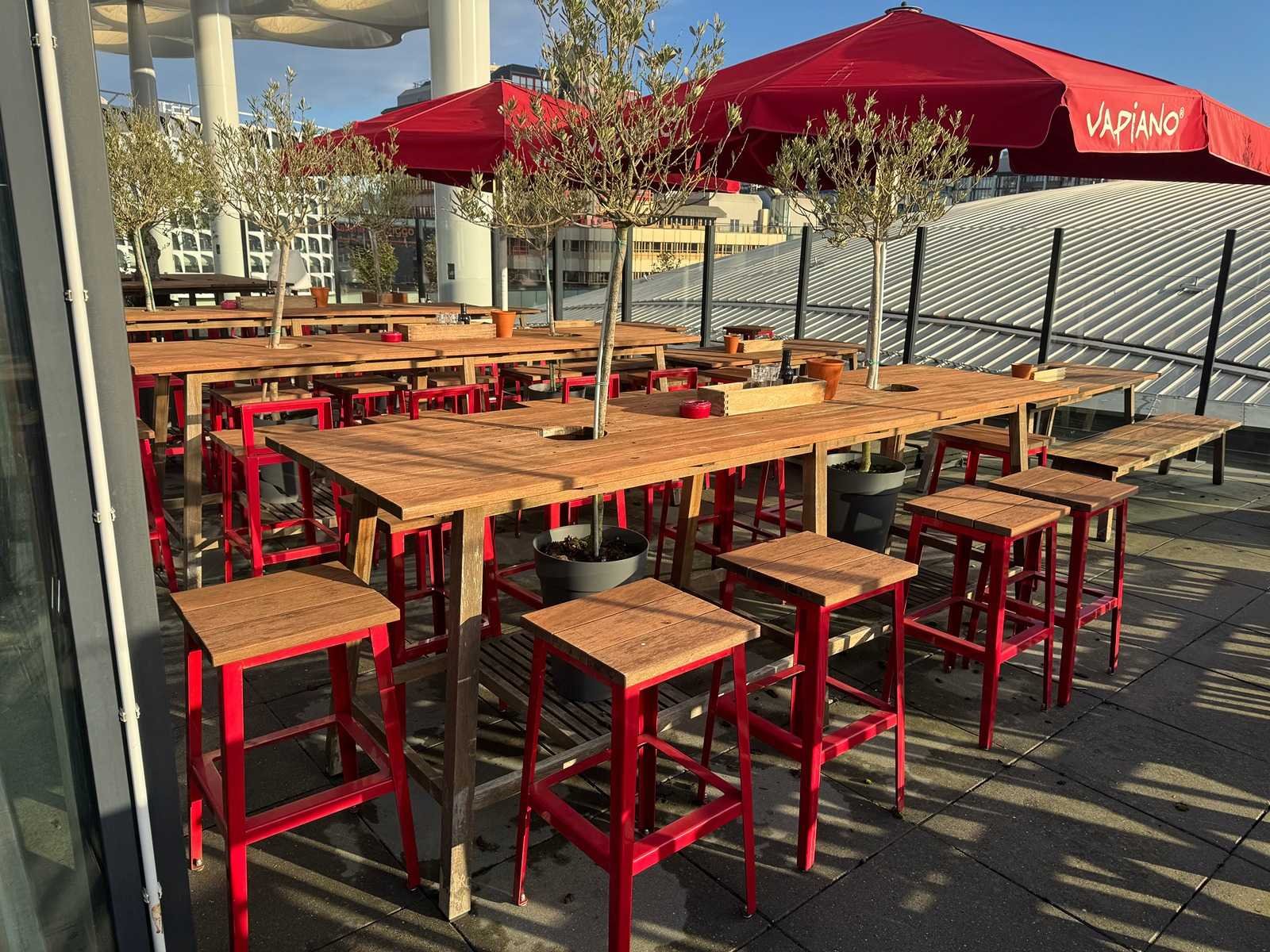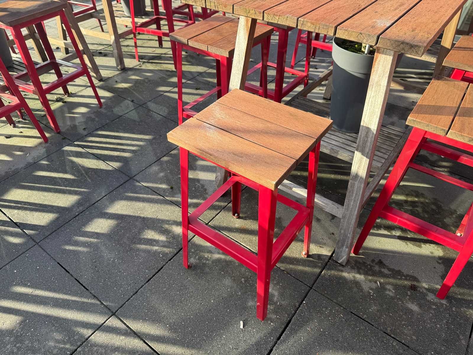 Bartafel inclusief boompjes, met 10 krukken (3x krukken met rugleuning, 7x zonder rugleuning). Zithoogte krukken: 75 cm. LET OP! Kavel bevindt zich op het dakterras. Nee Merk: Hutten Lengte: 300cm Breedte: 80cm Hoogte: 105cm