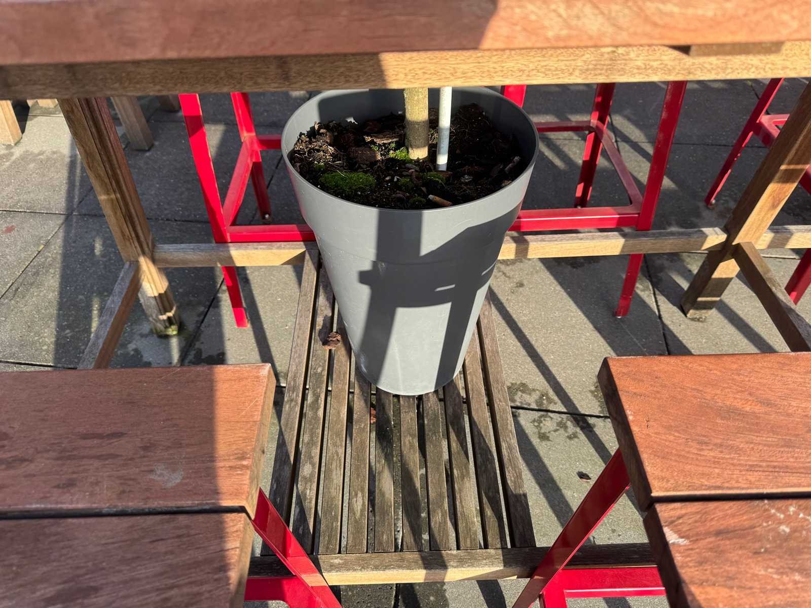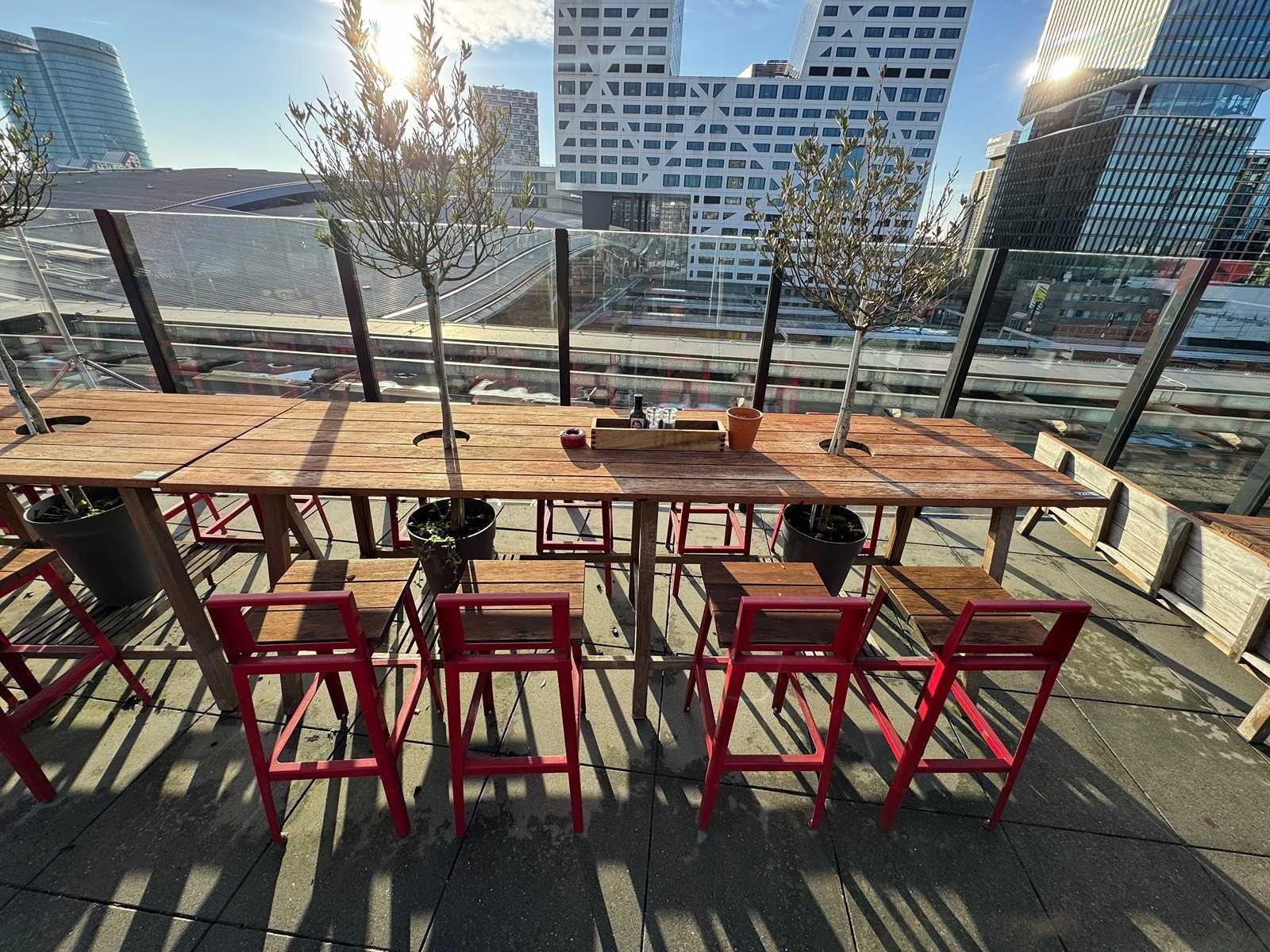 Terras bartafel met 8 barkrukken met rugleuning. Inclusief boompjes. LET OP! Kavel bevindt zich op het dakterras. Nee Merk: Hutten