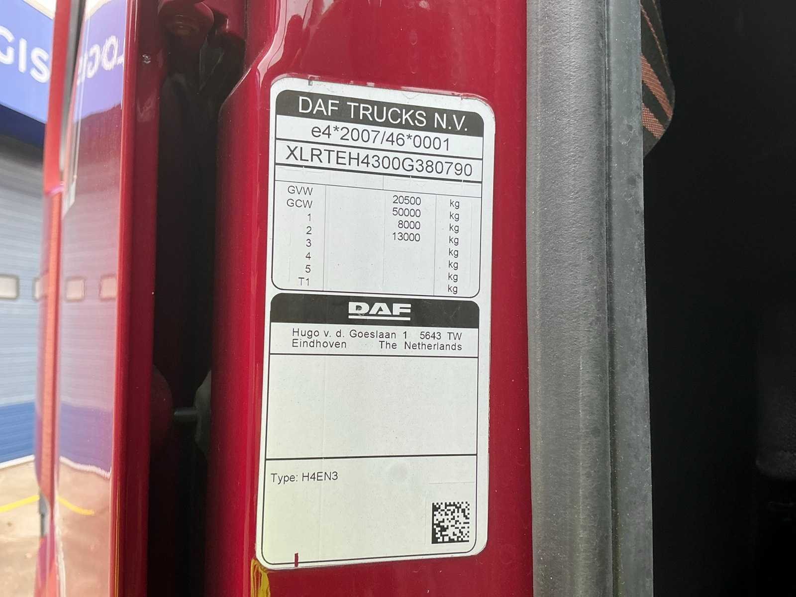 Wettelijke max massa voertuig 19500kg, technische max massa voertuig 20500kg, max massa samenstel 50000kg, max opleggertrekgewicht 42025kg., voorzien van dakairco, standkacheo, climatecontrol/airco, lange departure warning, President 27MC, koelkast, luchtgeveerde achter-asdiverse storingen. Nee Kenteken: 73-BSH-9 Merk: DAF Type: XF480FT Bouwjaar: 2022 Chassisnummer VIN: XLRTEH4300G380790 Cilinderinhoud: 12902cc Kilometerstand bij opname: 296250km APK vervaldatum: 2026-02-10 Datum eerste toelating: 2022-02-10 Datum eerste toelating (NL): 2022-02-10 Type transmissie: Automaat Aantal assen: 2 Asconfiguratie: 4x2 Fuel Type: Diesel Laadvermogen: 11625kg Aantal sleutels: 2 Emissieklasse: EURO 6 Slaapcabine: true Eigen gewicht: 7975kg Totale afmeting L: 6160mm Totale afmeting Breedte: 2550mm Nationaliteit documenten: Nederlands Aantal zitplaatsen: 2 Zelf rijdend exporteren: Ja Diesel: true