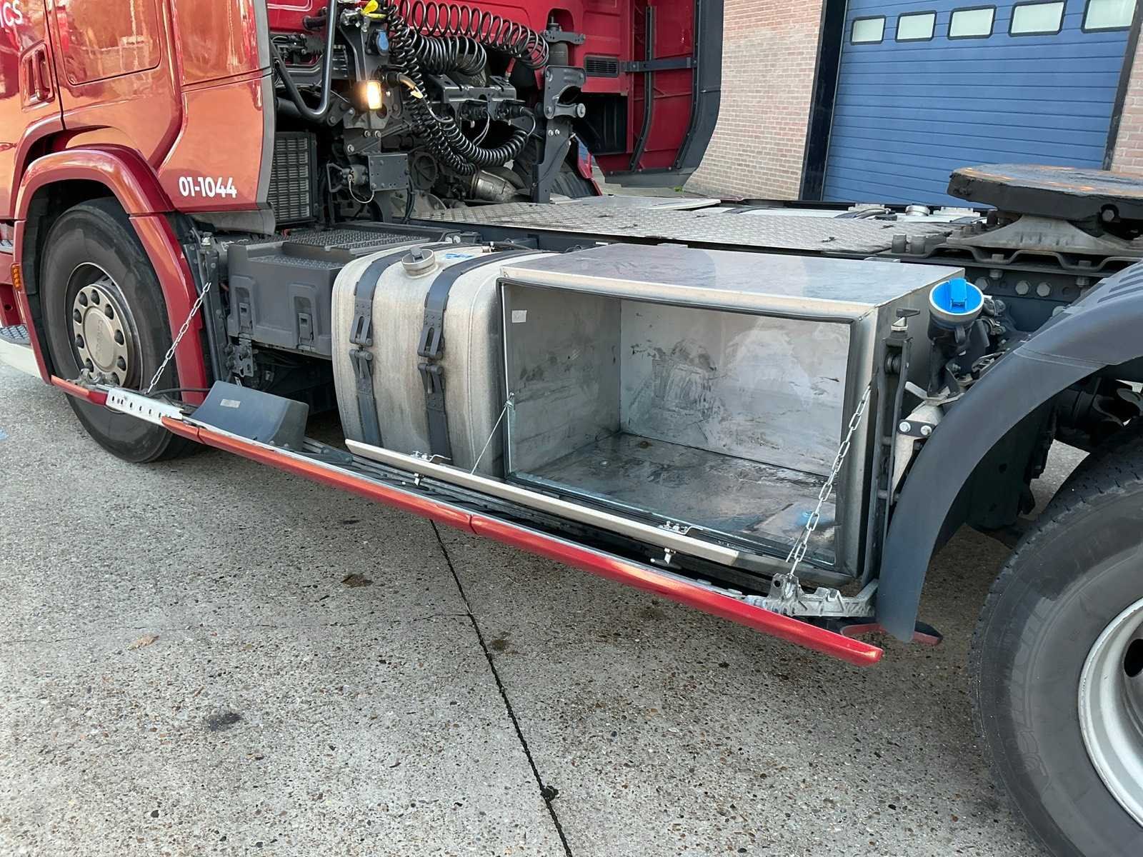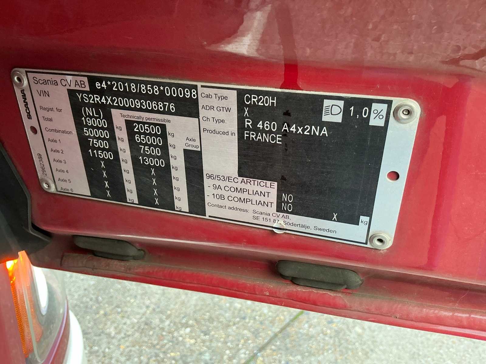 Wettelijke max massa voertuig 19000kg, technische max massa voertuig 20500kg, max massa samenstel 50000kg, max opleggertrekgewicht 41626kg. Voorzien van retarder, luchtgeveerde achter-as, 615 liter brandstoftank rechts, 285 liter brandstoftank links, 24/230volt inverter, climatecontrol/airco, audio, 1 bed, Nee Kenteken: 57-BTJ-2 Merk: Scania Type: R460 Bouwjaar: 2022 Chassisnummer VIN: XLRTEH4300G378831 Cilinderinhoud: 12742cc Kilometerstand bij opname: 186488km APK vervaldatum: 2025-11-15 Datum eerste toelating: 2022-11-15 Datum eerste toelating (NL): 2022-11-15 Type transmissie: Automaat Aantal assen: 2 Asconfiguratie: 4x2 Fuel Type: Diesel Laadvermogen: 10726kg Aantal sleutels: 2 Emissieklasse: EURO 6 Slaapcabine: true Eigen gewicht: 8374kg Totale afmeting L: 5960mm Totale afmeting Breedte: 2550mm Nationaliteit documenten: Nederlands Aantal zitplaatsen: 2 Zelf rijdend exporteren: Nee Diesel: true No self drive export!: true