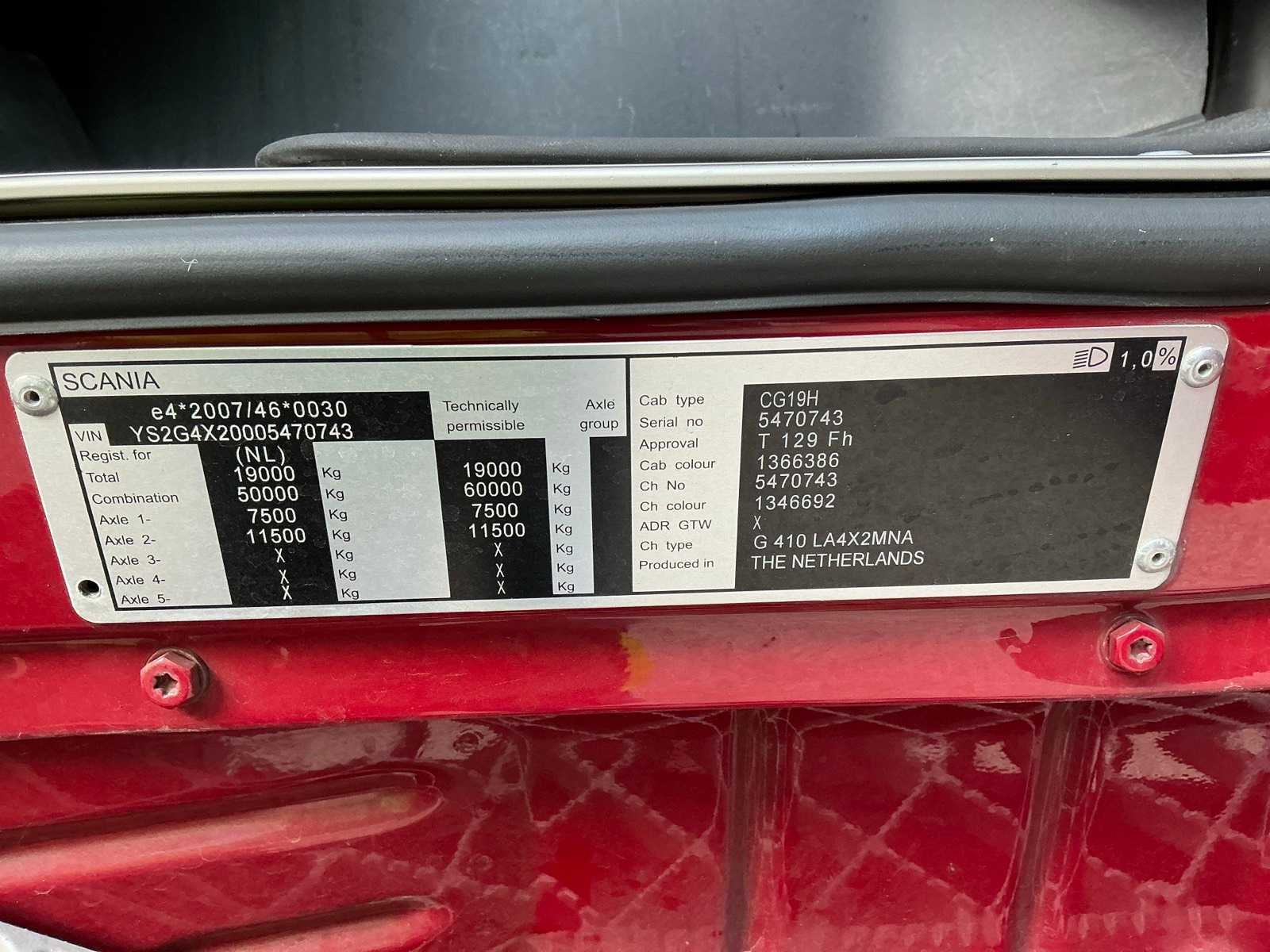 Eigen gewicht 8058kg, maxa massa voertuig 19000kg, max massa samenstel 50000kg. Voorzien van luchtgeveerde achter-as, 1000 liter brandstoftank links, climatecontrol/airco, koelkast, cruisecontrol, 2 bedden, Nee Kenteken: 40-BJN-5 Merk: Scania Type: G410 Bouwjaar: 2017 Chassisnummer VIN: YS2G4X20005470743 Cilinderinhoud: 12742cc Kilometerstand bij opname: 619210km APK vervaldatum: 2026-01-11 Datum eerste toelating: 2017-06-07 Datum eerste toelating (NL): 2017-06-07 Type transmissie: Automaat Aantal assen: 2 Asconfiguratie: 4x2 Laadvermogen: 11042kg Aantal sleutels: 1 Emissieklasse: 6 Nationaliteit documenten: Nederlands Aantal zitplaatsen: 2 Zelf rijdend exporteren: Nee No self drive export!: true