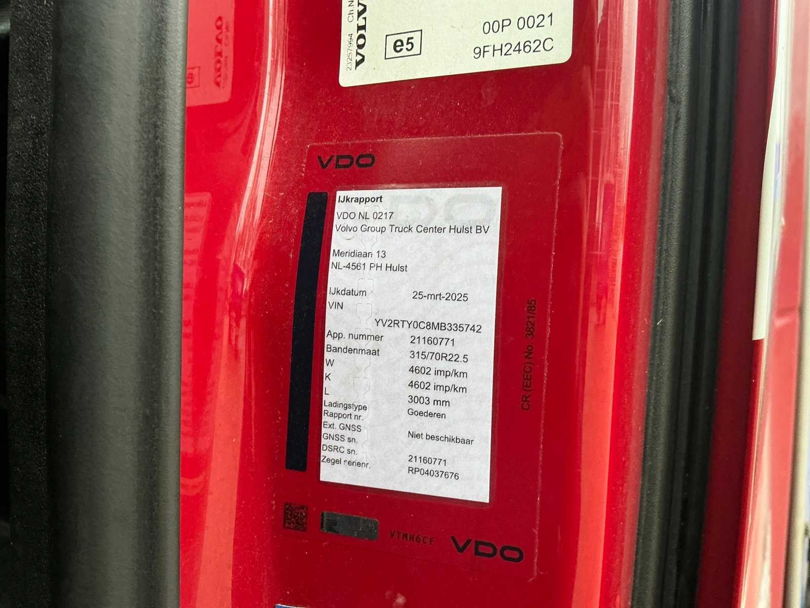 Max massa voertuig 12820kg, max massa samenstel 50000kg; Wielbasis 657cm; 3e as is lift-as, Rockinger vangmuilkoppeling, dubbele brandstoftank,24/230Volt inverter, climatecontrol/airco, lane departure warning, cruise control, koelkast, elektrische ramen en spiegels, vangmuilkoppeling Dit kavel maakt onderdeel uit van de combinatiekavel 151 bestaande uit kavel 28 en kavel 69. Let op! De combikavel 151 sluit een half uur later dan de genoemde losse kavels. No Kenteken: 56-BRL-5 Merk: Volvo Type: FH Bouwjaar: 2021 Chassisnummer VIN: YV2RTY0C8MB335742 Cilinderinhoud: 12777cc Kilometerstand bij opname: 491472km APK vervaldatum: 2026-04-08 Datum eerste toelating: 2021-04-08 Datum eerste toelating (NL): 2021-04-08 Type transmissie: Automaat Aantal assen: 3 Asconfiguratie: 6x2 Fuel Type: Diesel Laadvermogen: 14780kg Aantal sleutels: 2 Emissieklasse: EURO 6 Slaapcabine: true Hydraulische laadklep: true Navigatie: true Eigen gewicht: 7893kg Totale afmeting L: 10580mm Totale afmeting Breedte: 2550mm Nationaliteit documenten: Nederlands Aantal zitplaatsen: 2 Zelf rijdend exporteren: Ja Automaat: true Diesel: true