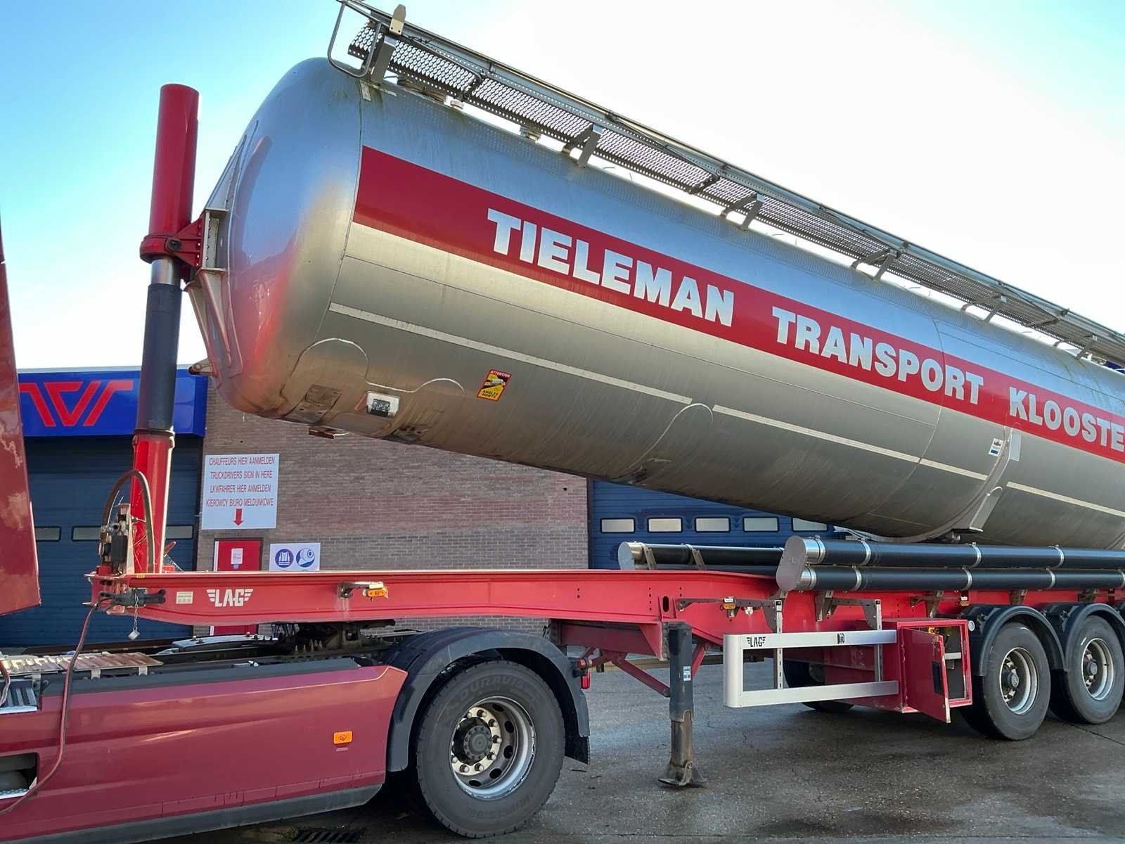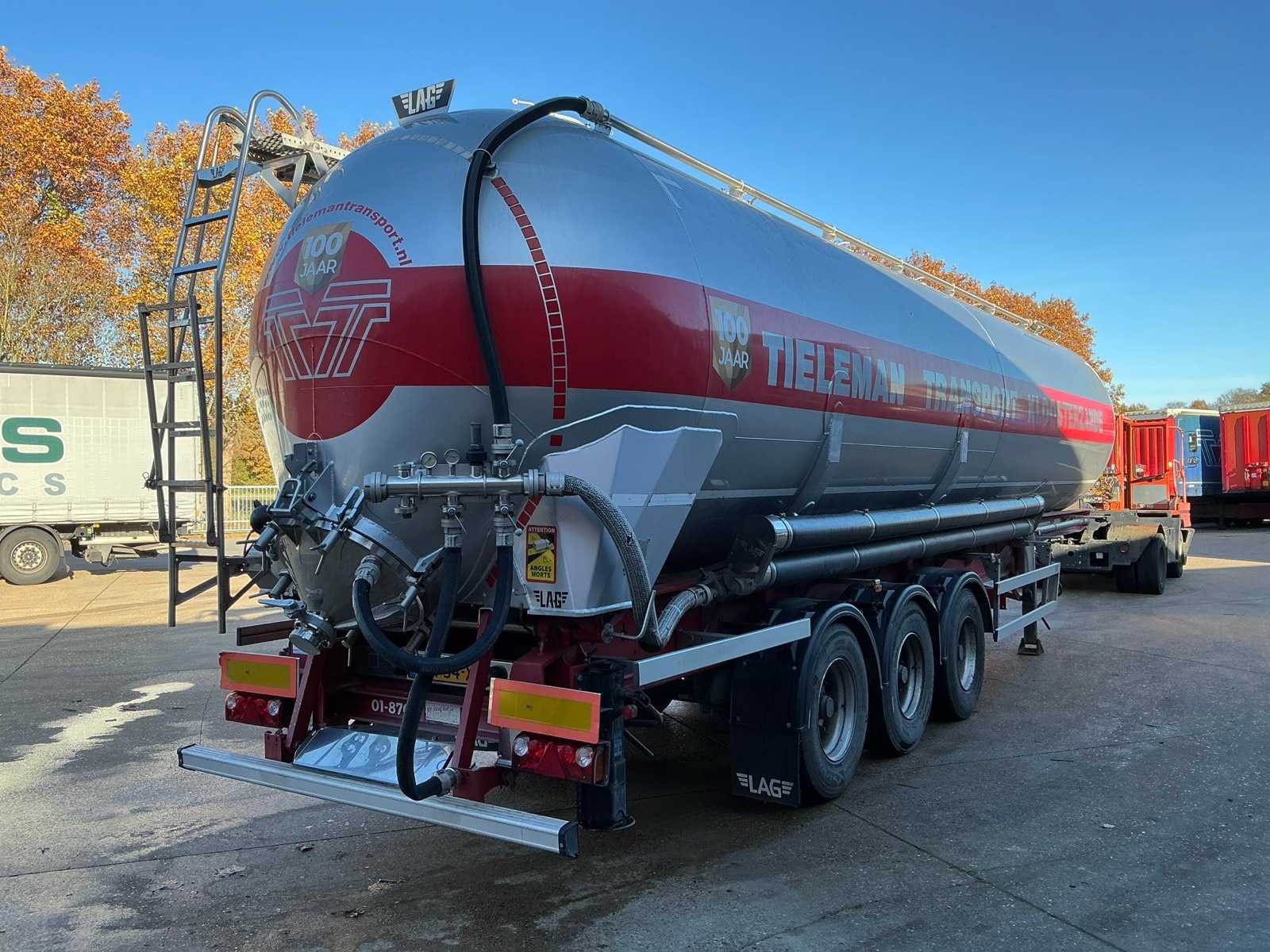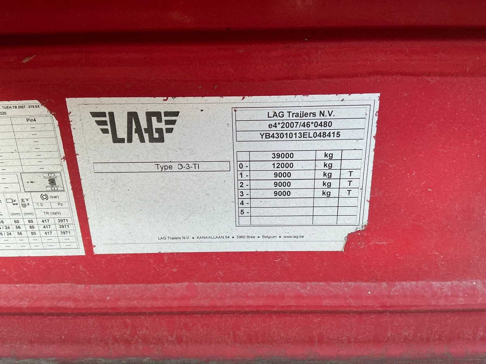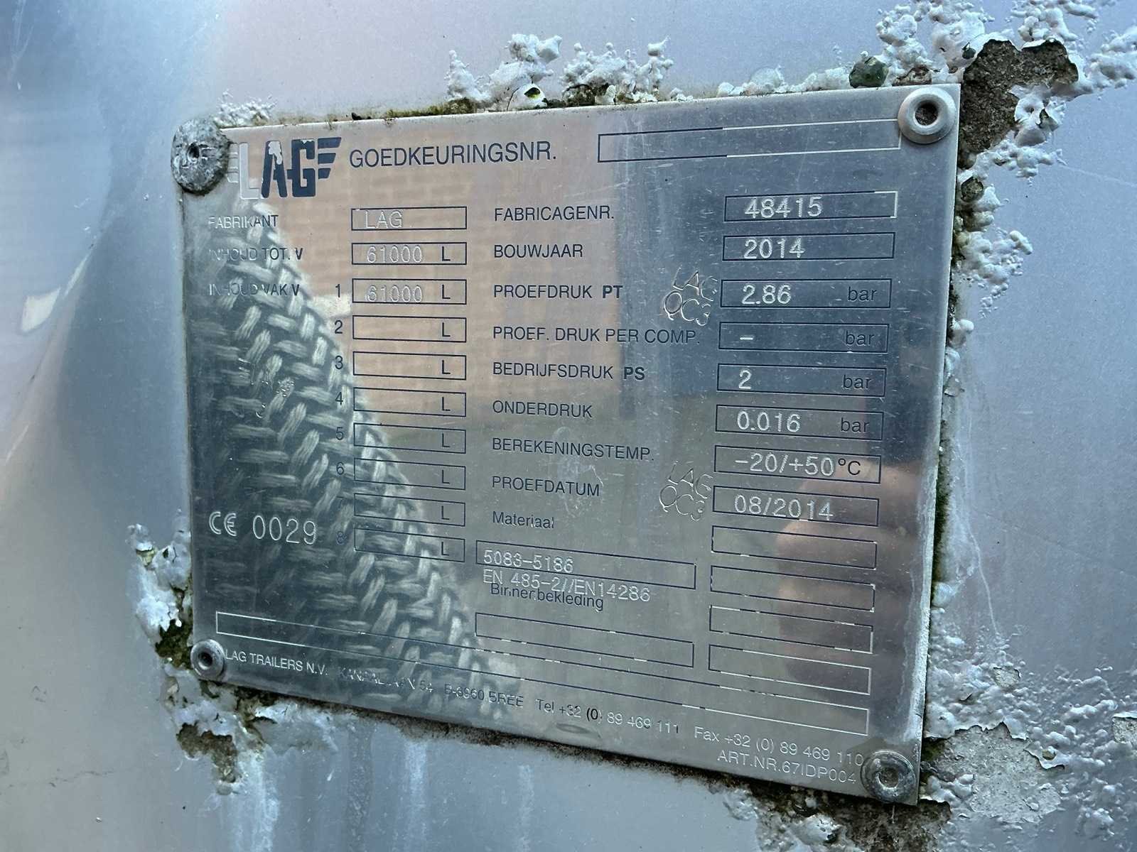 Max massa 39000kg, wielbasis 866cm., voorzien van BPW Eco plus assen waarvan 1e as als lift-as, tank, tankcapaciteit 61000liter, 6 deksels, bedrijfsdruk max 2 bar, max bpvacuum 0,016 bar, elektrische hydrauliekpomp, laatste transport met sepioliet, tank niet gereinigd, kan residu aanwezig zijn Nee Merk: LAG Type: 0-3TI Type aanhangwagencarrosserie: Tankopbouw Bouwjaar: 2014 Chassisnummer VIN: YB4301013EL048415 Kenteken: OR-54-XZ Datum eerste toelating (NL): 2019-05-10 Datum eerste toelating: 2014-09-25 APK vervaldatum: 2026-10-04 Aantal assen: 3 Laadvermogen: 32100kg Eigen gewicht: 6900kg Totale afmeting L: 13470mm Totale afmeting Breedte: 2550mm Zelf rijdend exporteren: Ja