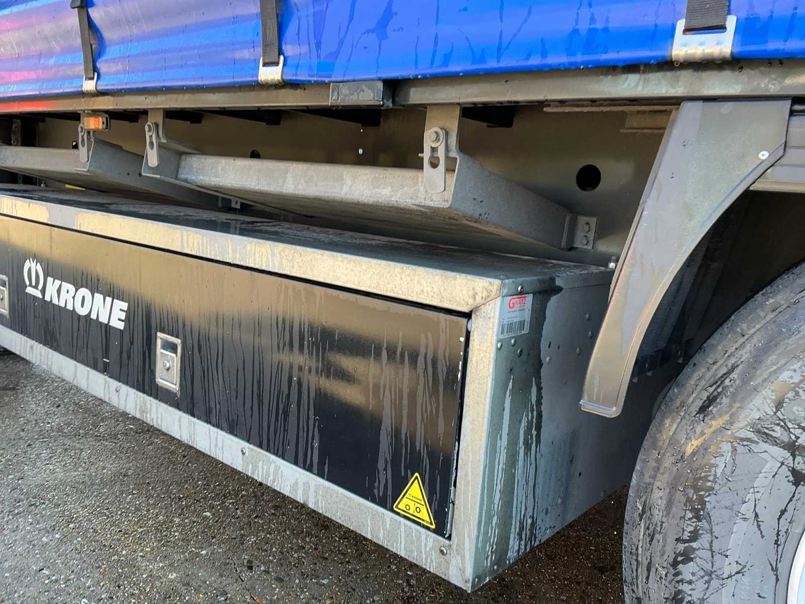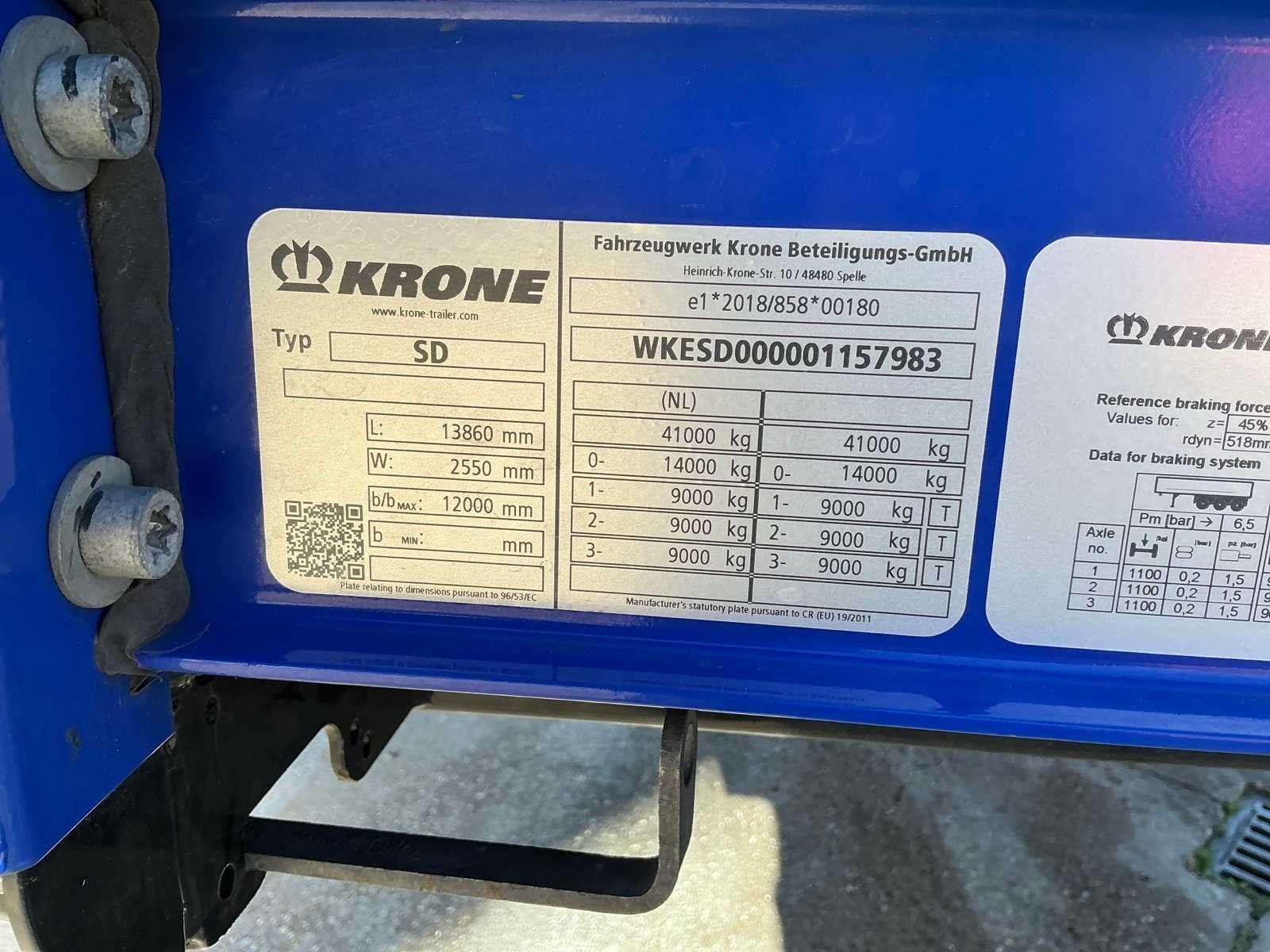Max massa 41000kg, Afstand hart koppeling tot achterzijde voertuig 1200cm; Wielbasis 879 cm; Krone luchtgeveerde assen, 1e as is hefas; Voorzien van schuifzeilen, aluminium zijborden, schuifdak en palletkist Nee Merk: Krone Type: SD Type aanhangwagencarrosserie: Tautliner Bouwjaar: 2024 Chassisnummer VIN: WKESD000001157983 Kenteken: OV-76-GR Datum eerste toelating (NL): 2024-03-26 Datum eerste toelating: 2024-03-26 APK vervaldatum: 2026-03-26 Laadvermogen: 33608kg Eigen gewicht: 7392kg Totale afmeting L: 13860mm Totale afmeting Breedte: 2550mm Totale afmeting Hoogte: 4000mm Zelf rijdend exporteren: Ja
