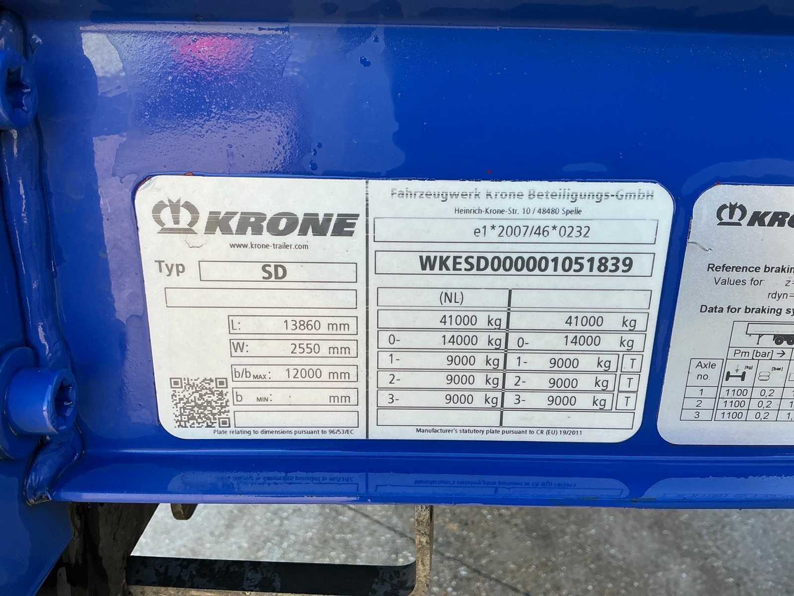Max massa 41000kg. Wielbasis 867cm, voorzien vanKrone luchtgeveerde assen waarvan 1e as als lift-as, aluminium zijborden, schuifzeilen schuifdak en palletkist. Nee Merk: Krone Type: SD Type aanhangwagencarrosserie: Tautliner Bouwjaar: 2022 Chassisnummer VIN: WKESD0000001051839 Kenteken: OT-77-NL Datum eerste toelating (NL): 2022-10-03 Datum eerste toelating: 2022-10-03 APK vervaldatum: 2026-03-30 Aantal assen: 3 Laadvermogen: 33790kg Eigen gewicht: 7210kg Totale afmeting L: 13860mm Totale afmeting Breedte: 2550mm Zelf rijdend exporteren: Ja