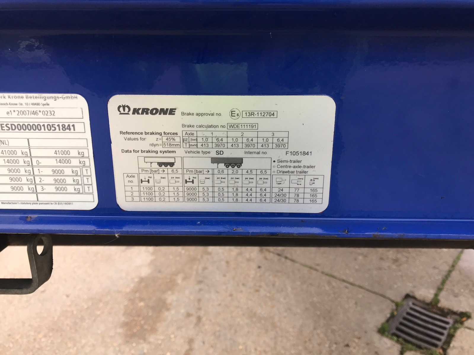 Max massa 41000kg, Afstand hart koppeling tot achterzijde voertuig 1200cm; Wielbasis 879 cm; 1e as is hefas; Voorzien van Krone luchtgeveerde assen, schuifzeilen, zijborden, schuifdak en palletkist, bandenmaat 385/65R22.5 Nee Merk: Krone Type: SD Type aanhangwagencarrosserie: Tautliner Bouwjaar: 2022 Chassisnummer VIN: WKESD0000001051841 Kenteken: OT-40-NP Datum eerste toelating (NL): 2022-10-06 Datum eerste toelating: 2022-10-06 APK vervaldatum: 2026-10-06 Aantal assen: 3 Laadvermogen: 33790kg Eigen gewicht: 7210kg Totale afmeting L: 13860mm Totale afmeting Breedte: 2550mm Zelf rijdend exporteren: Ja