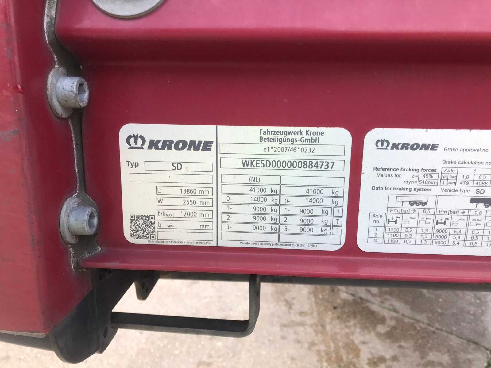 Max massa 41000kg, Afstand hart koppeling tot achterzijde voertuig 1200cm; Wielbasis 879 cm; 1e as is hefas; Voorzien van Krone luchtgeveerde assen, schuifzeilen, zijborden, schuifdak en palletkist, bandenmaat 385/65R22.5 Nee Merk: Krone Type: SD Type aanhangwagencarrosserie: Tautliner Bouwjaar: 2019 Chassisnummer VIN: WKESD000000884737 Kenteken: OR-75-TN Datum eerste toelating (NL): 2019-02-15 Datum eerste toelating: 2019-02-15 APK vervaldatum: 2026-02-15 Aantal assen: 3 Laadvermogen: 33793kg Eigen gewicht: 7207kg Totale afmeting L: 13860mm Totale afmeting Breedte: 2550mm Zelf rijdend exporteren: Ja