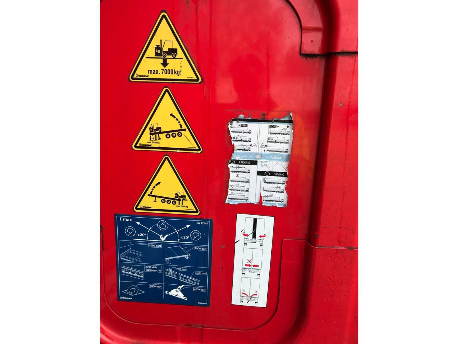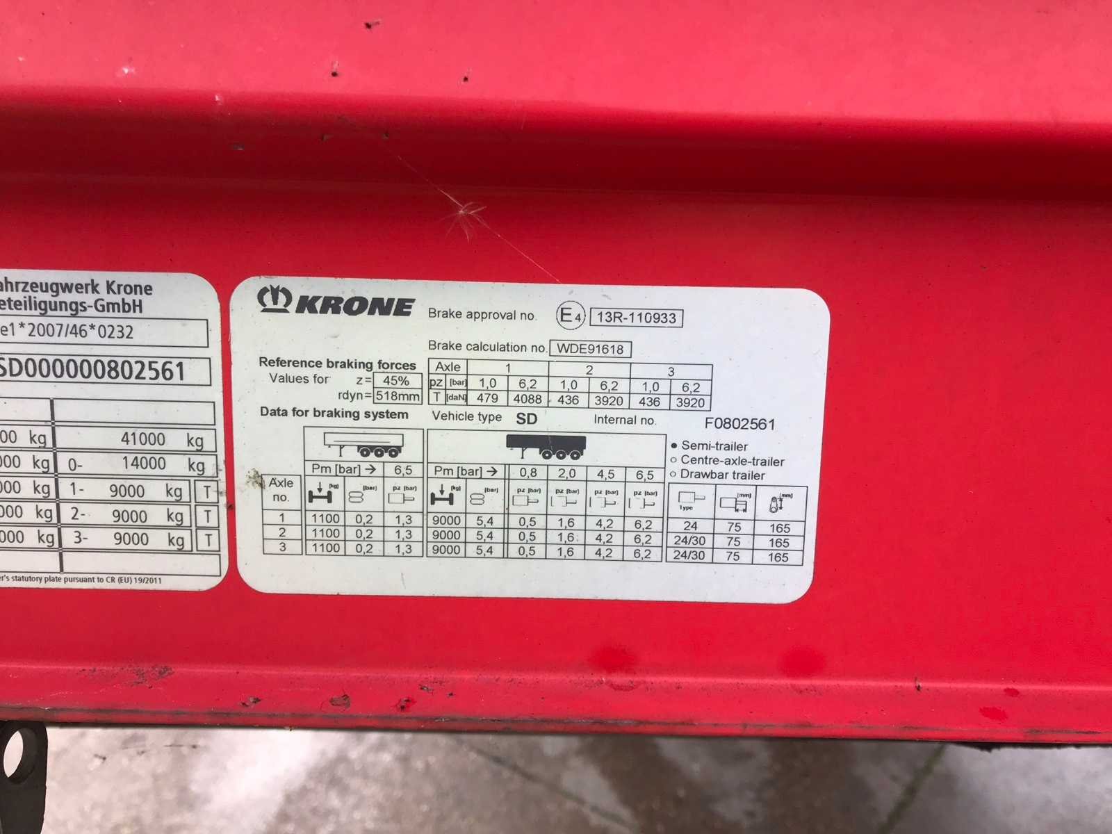 Max massa 41000kg, Afstand hart koppeling tot achterzijde voertuig 1200cm; Wielbasis 879 cm; 1e as is hefas; Voorzien van BPW luchtgeveerde assen, schuifzeilen, zijborden, schuifdak en palletkist, bandenmaat 385/65R22.5 Nee Merk: Krone Type: SD Type aanhangwagencarrosserie: Tautliner Bouwjaar: 2018 Chassisnummer VIN: WKESD000000802561 Kenteken: OR-82-DP Datum eerste toelating (NL): 2018-01-12 Datum eerste toelating: 2018-01-12 APK vervaldatum: 2026-01-12 Aantal assen: 3 Laadvermogen: 33795kg Eigen gewicht: 7205kg Totale afmeting L: 13860mm Totale afmeting Breedte: 2550mm Zelf rijdend exporteren: Mot expire date 12-01-2026 No self drive export!: true
