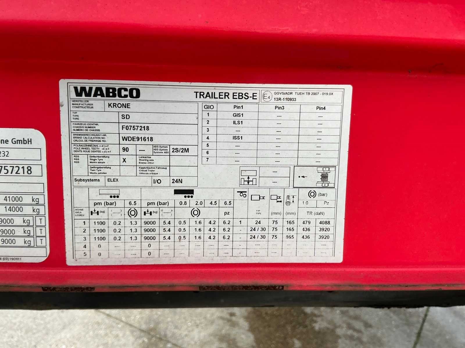 Max massa 41000kg, voorzien van luchtgeveerde BPW assen, 1e as is lift-as, zijborden, schuifzeilen, schuifdak en palletkist. Nee Merk: Krone Type: SD Type aanhangwagencarrosserie: Tautliner Bouwjaar: 2017 Chassisnummer VIN: WKESD000000757218 Kenteken: OP-22-RP Datum eerste toelating (NL): 2017-03-03 Datum eerste toelating: 2017-03-03 APK vervaldatum: 2026-03-07 Laadvermogen: 33870kg Eigen gewicht: 7130kg Totale afmeting L: 13860mm Totale afmeting Breedte: 2550mm Zelf rijdend exporteren: Ja