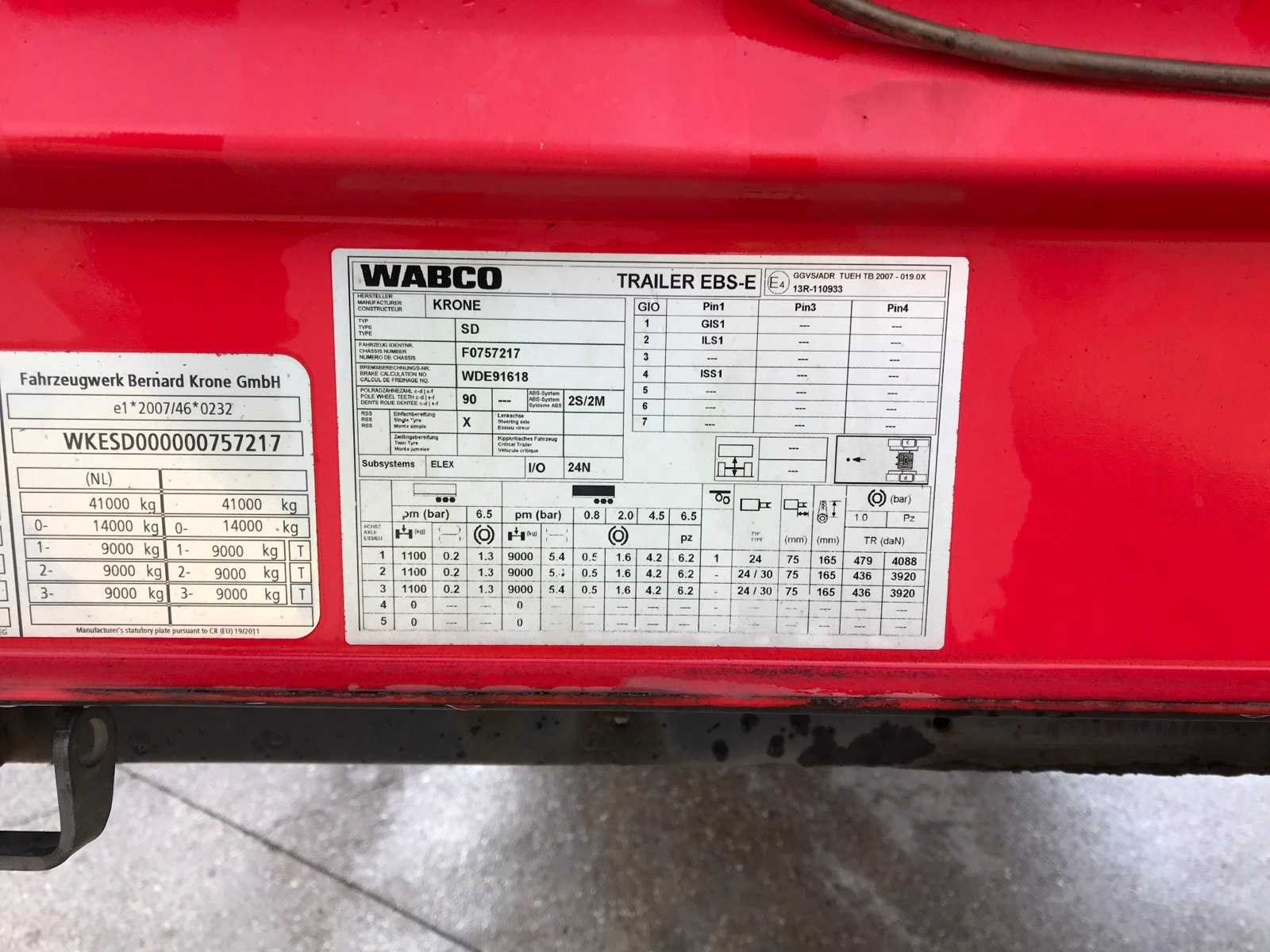 Max massa 41000kg, Afstand hart koppeling tot achterzijde voertuig 1200cm; Wielbasis 879 cm; 1e as is hefas; Voorzien van BPW luchtgeveerde assen, schuifzeilen, zijborden, schuifdak en palletkist, bandenmaat 385/65R22.5 Nee Merk: Krone Type: SD Type aanhangwagencarrosserie: Tautliner Bouwjaar: 2017 Chassisnummer VIN: WKESD000000757217 Kenteken: OP-21-RP Datum eerste toelating (NL): 2017-03-03 Datum eerste toelating: 2017-03-03 APK vervaldatum: 2026-03-03 Aantal assen: 3 Laadvermogen: 33870kg Eigen gewicht: 7130kg Totale afmeting L: 13860mm Totale afmeting Breedte: 2550mm Zelf rijdend exporteren: Ja