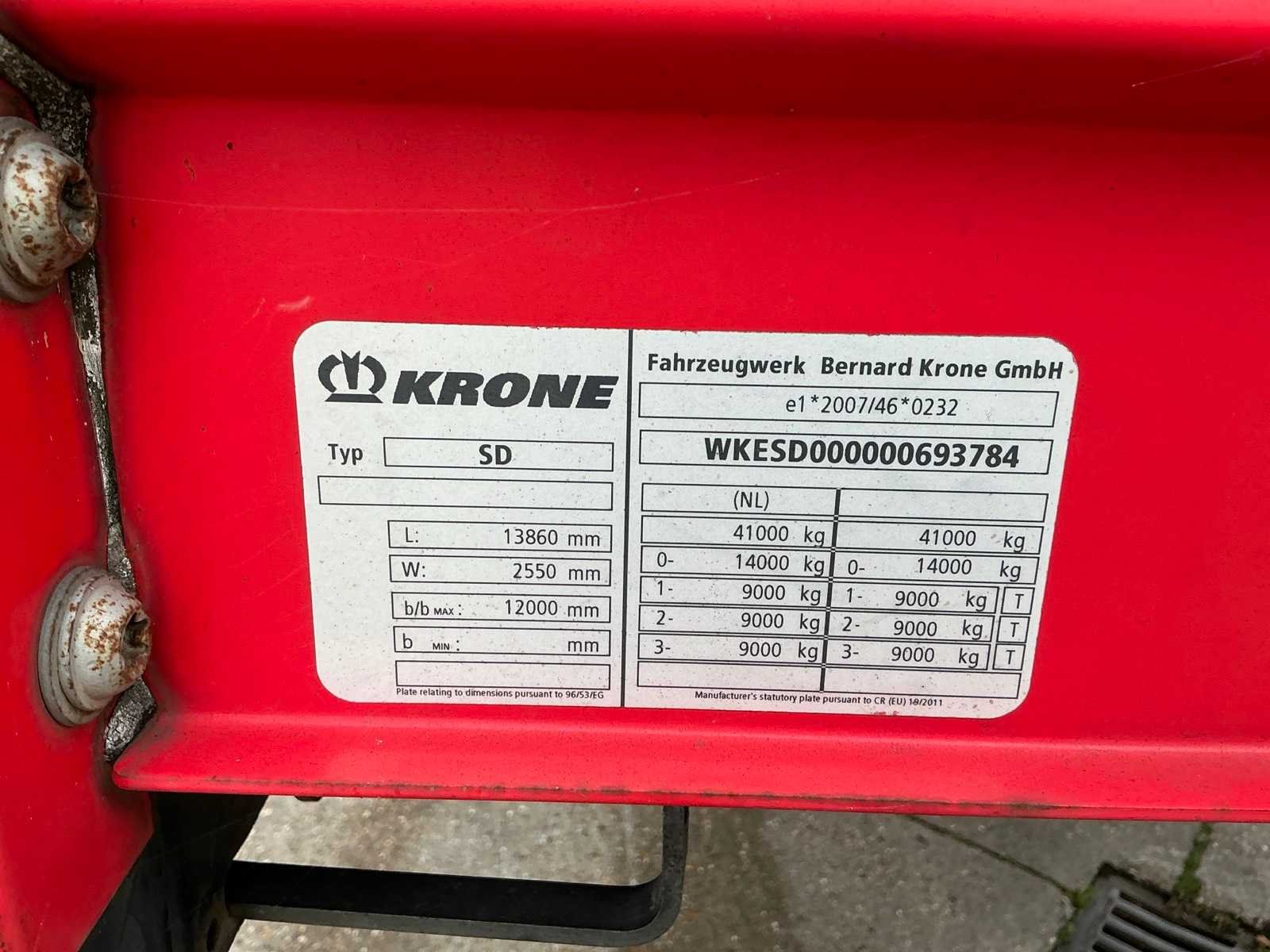 Max massa 41000kg, Afstand hart koppeling tot achterzijde voertuig 1200cm; Wielbasis 879 cm; luchtgeveerde BPW assen, 1e as is hefas; Voorzien van schuifzeilen, zijborden, schuifdak en palletkist Nee Merk: Krone Type: SD Type aanhangwagencarrosserie: Tautliner Bouwjaar: 2016 Chassisnummer VIN: WKWSD000000693784 Kenteken: OP-63-BT Datum eerste toelating (NL): 2016-01-14 Datum eerste toelating: 2016-01-14 APK vervaldatum: 2026-01-25 Laadvermogen: 33950kg Eigen gewicht: 7050kg Totale afmeting L: 13860mm Totale afmeting Breedte: 2550mm Zelf rijdend exporteren: Ja