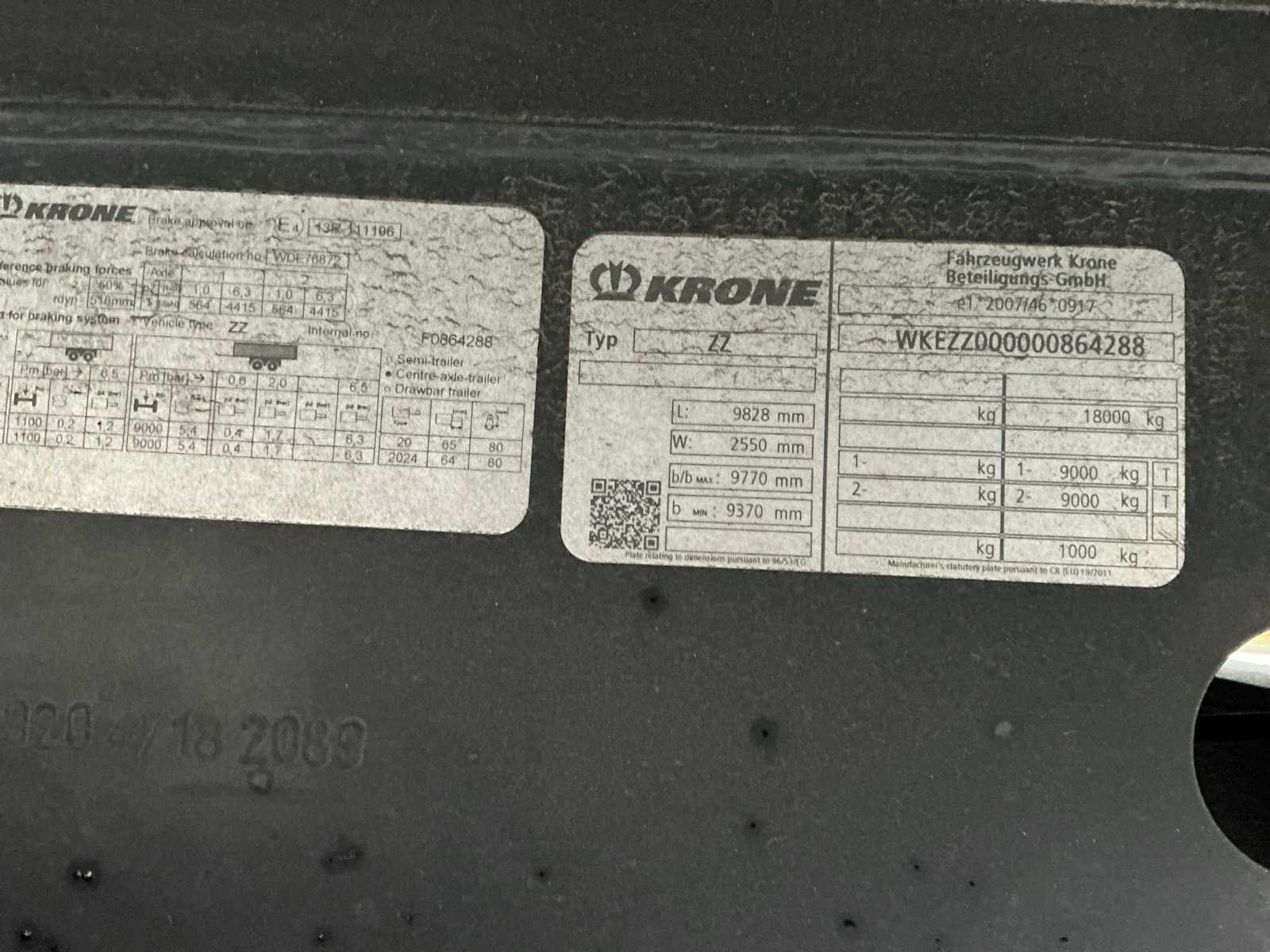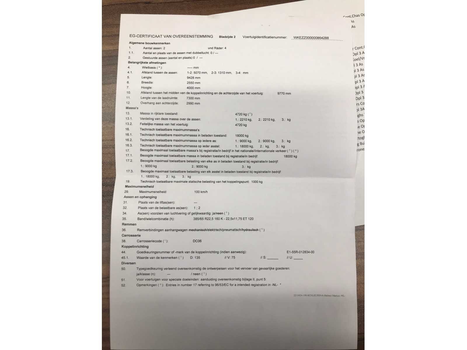 Max massa 18000kg, wielbasis 638cm. Voorzien van schuifdak, luchtgeveerde BPW assen, 1 steunpoot voor, 2 steunpoten achter, schuifzeilen No Merk: Krone Type: ZZ Model: Huifopbouw Bouwjaar: 2019 Chassisnummer: WKEZZ000000864288 Aantal assen: 2 Ledig gewicht: 4720kg Laadvermogen: 13280kg Datum eerste toelating: 2019-03-06 Datum eerste toelating (NL): 2019-03-06 APK vervaldatum: 2026-03-10 Kenteken: 86-WT-NS Lengte: 943cm Breedte: 255cm Nationaliteit documenten: Nederlands Zelf rijdend exporteren: Ja