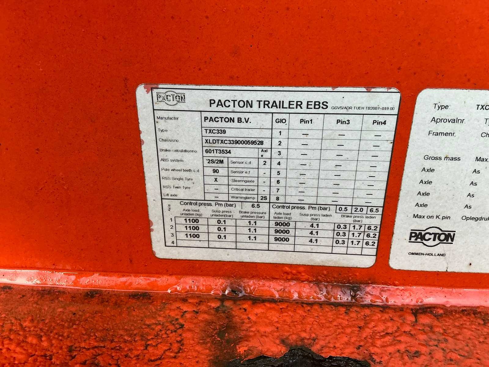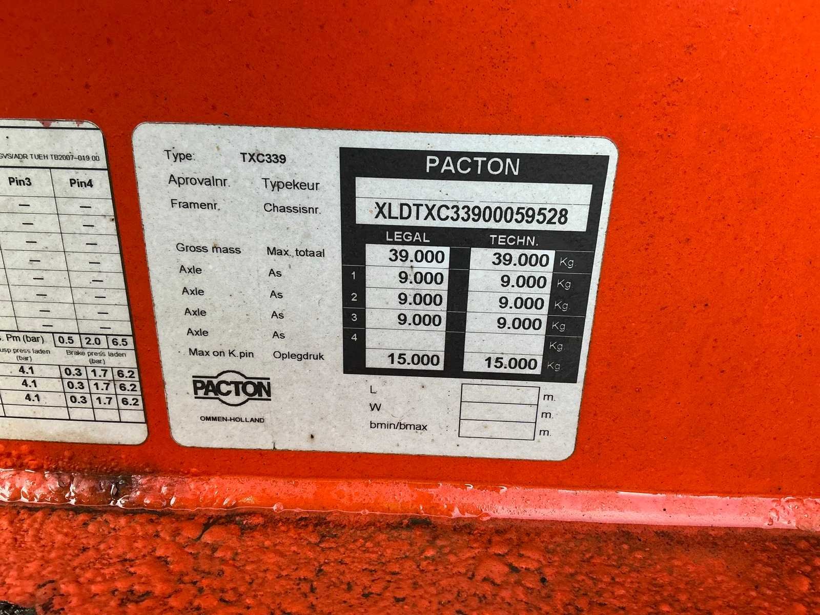 Max massa 39000kg, wielbasis 910cm., hoog chassis, voorzien van luchtgeveerde SAF assen, as 1 lift-as, bandenmaat 385/65R22.5 Nee Merk: Pacton Type: TXC339 Type aanhangwagencarrosserie: 20FT, 40FT, en 45FT containers Bouwjaar: 2009 Chassisnummer VIN: XLDTXC33900059528 Kenteken: OK-94-TL Datum eerste toelating (NL): 2009-01-27 Datum eerste toelating: 2009-01-27 APK vervaldatum: 2026-02-24 Aantal assen: 3 Laadvermogen: 34300kg Eigen gewicht: 4700kg Totale afmeting L: 13450mm Totale afmeting Breedte: 2460mm Zelf rijdend exporteren: Ja