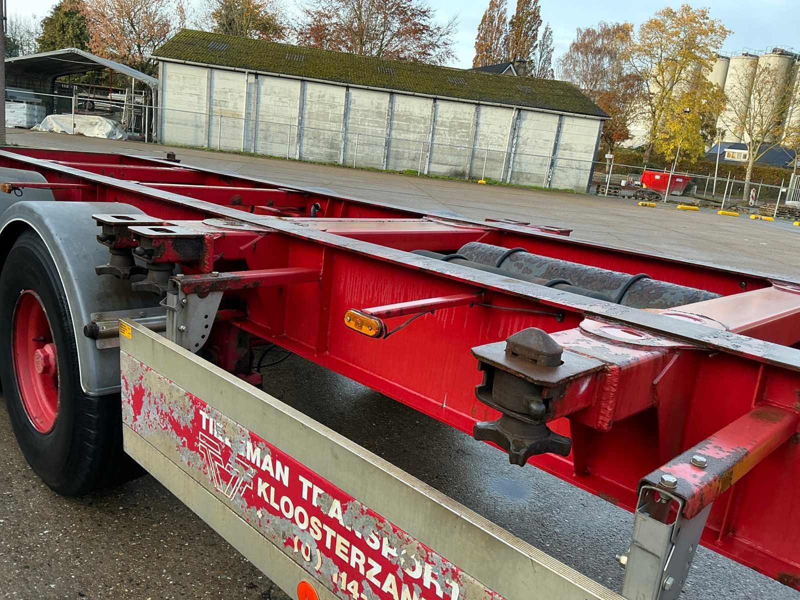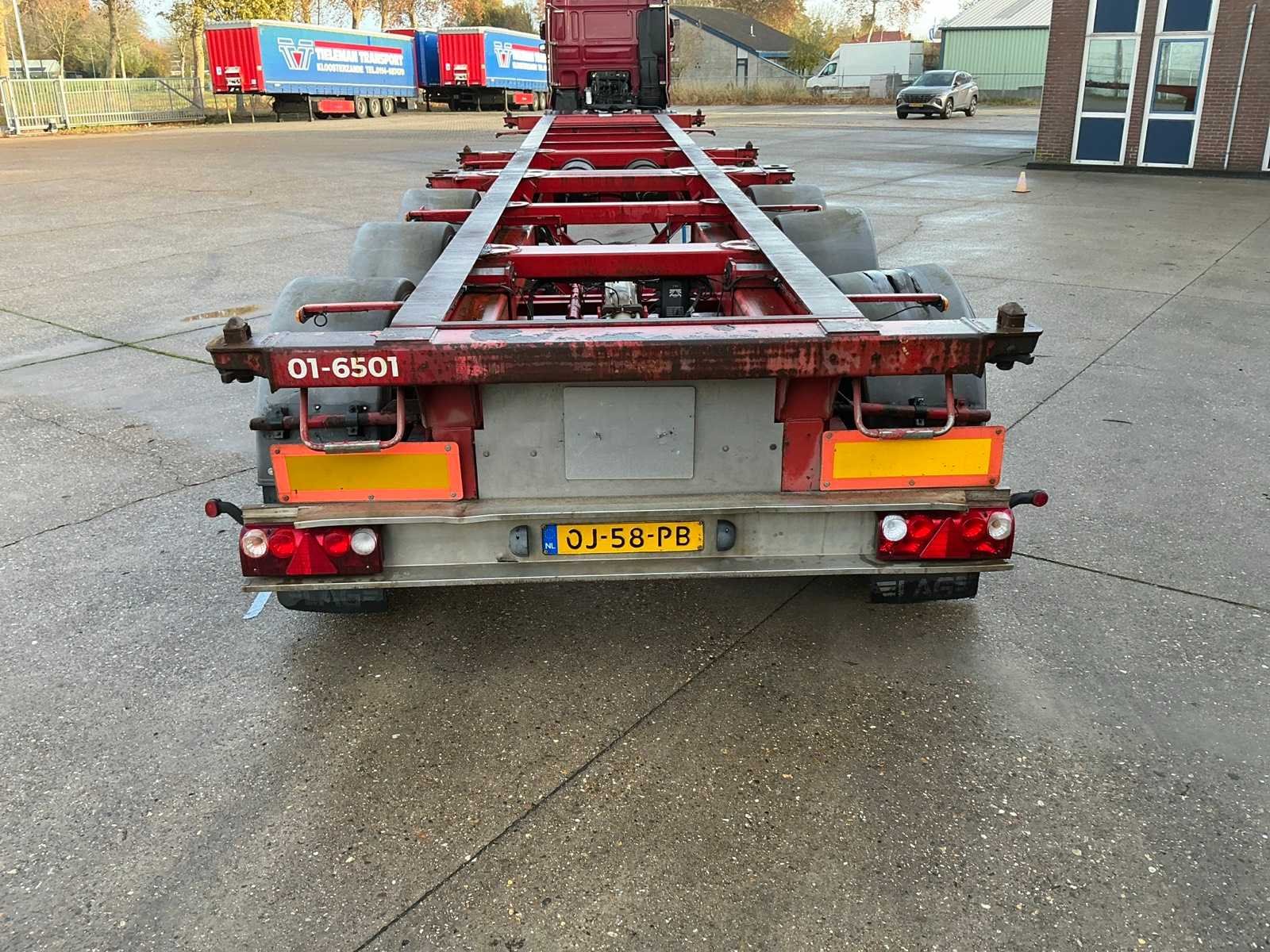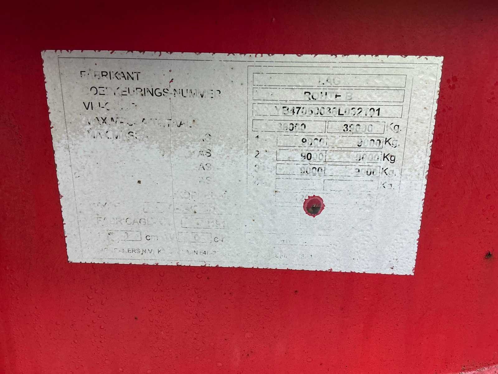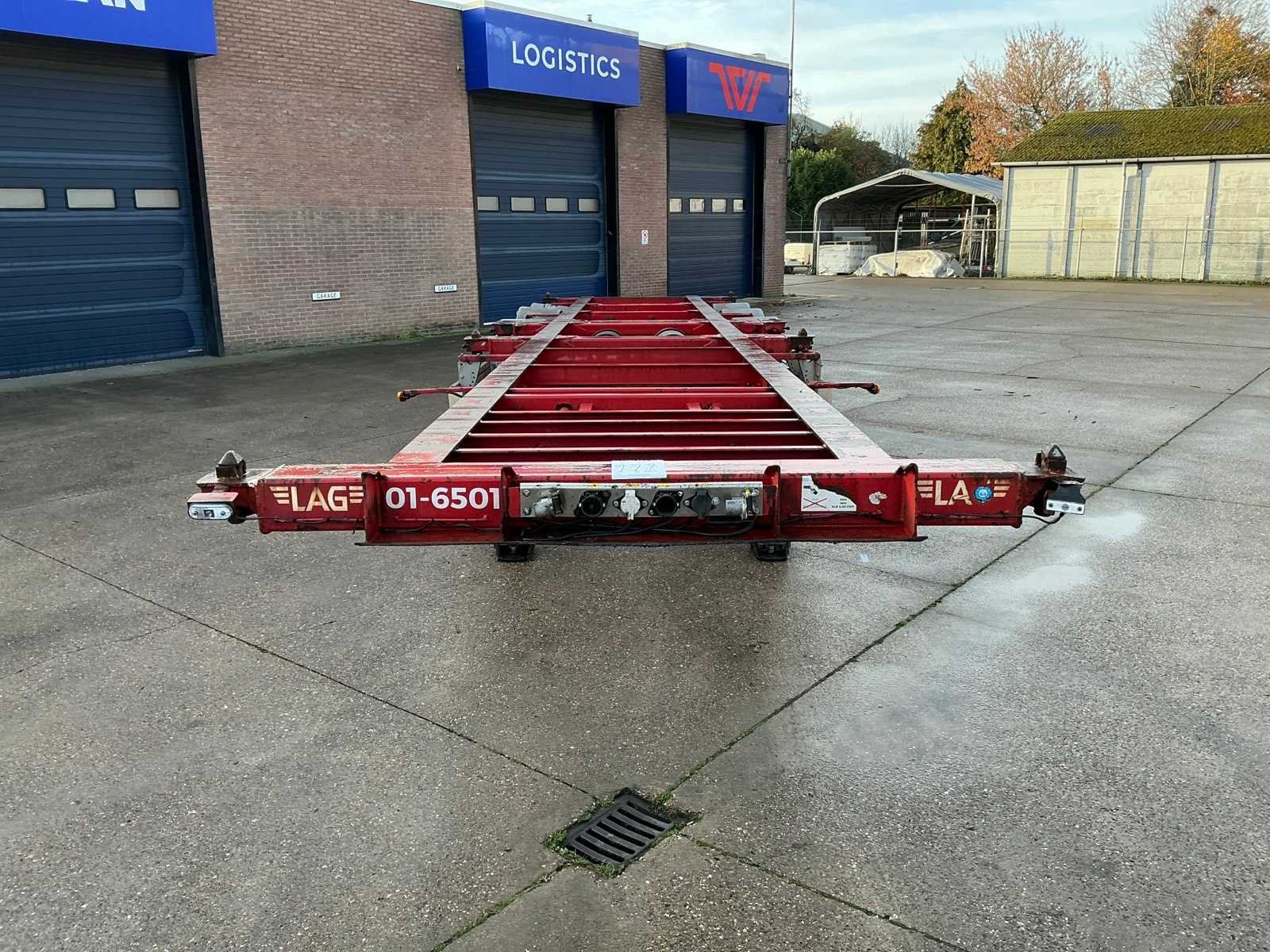 Containers 20”, 40” en 40” HQ; Max massa 39000kg. Wielbasis 804cm; Afstand hart koppeling tot achterzijde voertuig 921cm, voorzien van luchtgeveerde BPW assen, 1 as lift-as, bandenmaat 425/65R22.5 Nee Merk: LAG Type: O-3-39 CD Type aanhangwagencarrosserie: Containerchassis Bouwjaar: 2006 Chassisnummer VIN: YB47050036L032191 Kenteken: OJ-58-PB Datum eerste toelating (NL): 2006-12-14 Datum eerste toelating: 2006-12-14 APK vervaldatum: 2026-02-04 Aantal assen: 3 Laadvermogen: 33950kg Eigen gewicht: 5050kg Totale afmeting L: 10800mm Totale afmeting Breedte: 2520mm Zelf rijdend exporteren: Ja