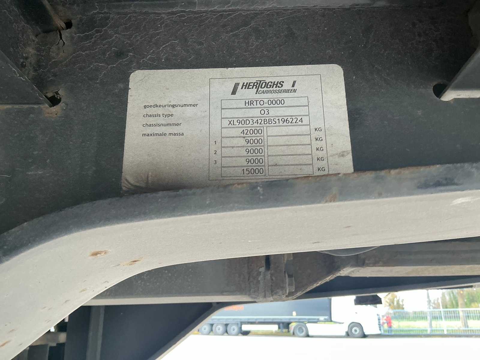 Max massac42000kg., wielbasis 901cm, voorzien van luchtgeveerde BPW Eco Plus assen waarvan 1e als lift-as uitgevoerd en 3e as als gedwongen gestuurde as, , schuifzeilen en Dhollandia DHSMR20 ondervouwlaadklep Nee Merk: Hertoghs Type: O3 Type aanhangwagencarrosserie: Tautliner Bouwjaar: 2011 Chassisnummer VIN: XL90D342BBS196224 Kenteken: OL-91-LS Datum eerste toelating (NL): 2011-10-25 Datum eerste toelating: 2011-10-25 APK vervaldatum: 2026-03-29 Aantal assen: 3 Laadvermogen: 33510kg Eigen gewicht: 8490kg Totale afmeting L: 13860mm Zelf rijdend exporteren: Ja