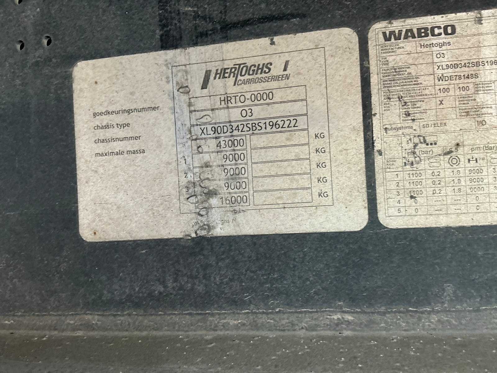 Max massa 43000kg, wielbasis 879cm, 1e as is hefas; Afstand hart koppeling tot achterzijde voertuig 1200cm; Voorzien van luchtgeveerde BPW Eco Plus assen, schuifzeilen en schuifdak. Nee Merk: Hertoghs Type: 03 Type aanhangwagencarrosserie: Tautliner Bouwjaar: 2012 Chassisnummer VIN: XL90D342SBS196222 Kenteken: OL-67-NJ Datum eerste toelating (NL): 2012-01-04 Datum eerste toelating: 2012-01-04 APK vervaldatum: 2026-01-06 Aantal assen: 3 Laadvermogen: 35570kg Eigen gewicht: 7430kg Totale afmeting L: 13860mm Totale afmeting Breedte: 2550mm Zelf rijdend exporteren: Nee MOT/TÜV til 06-01-2026 No self drive export!: true