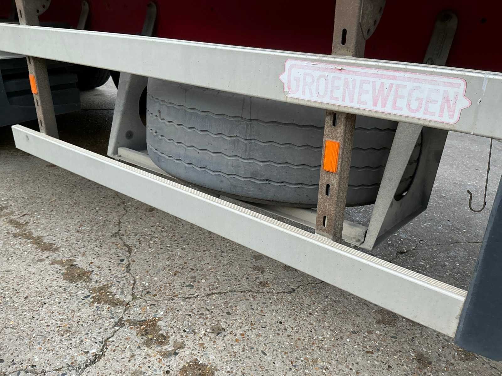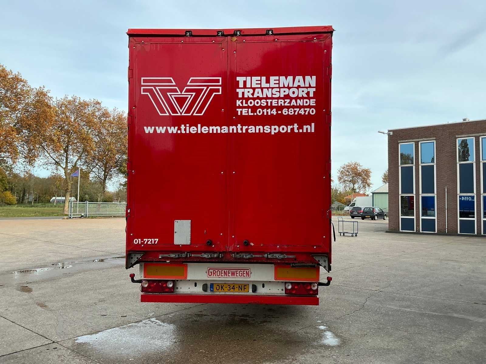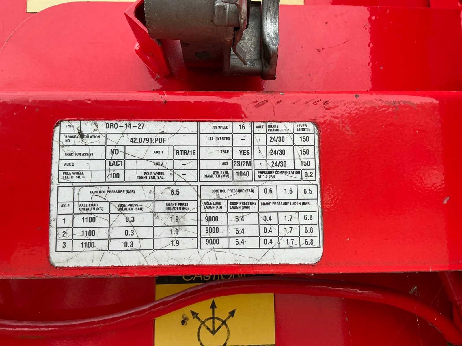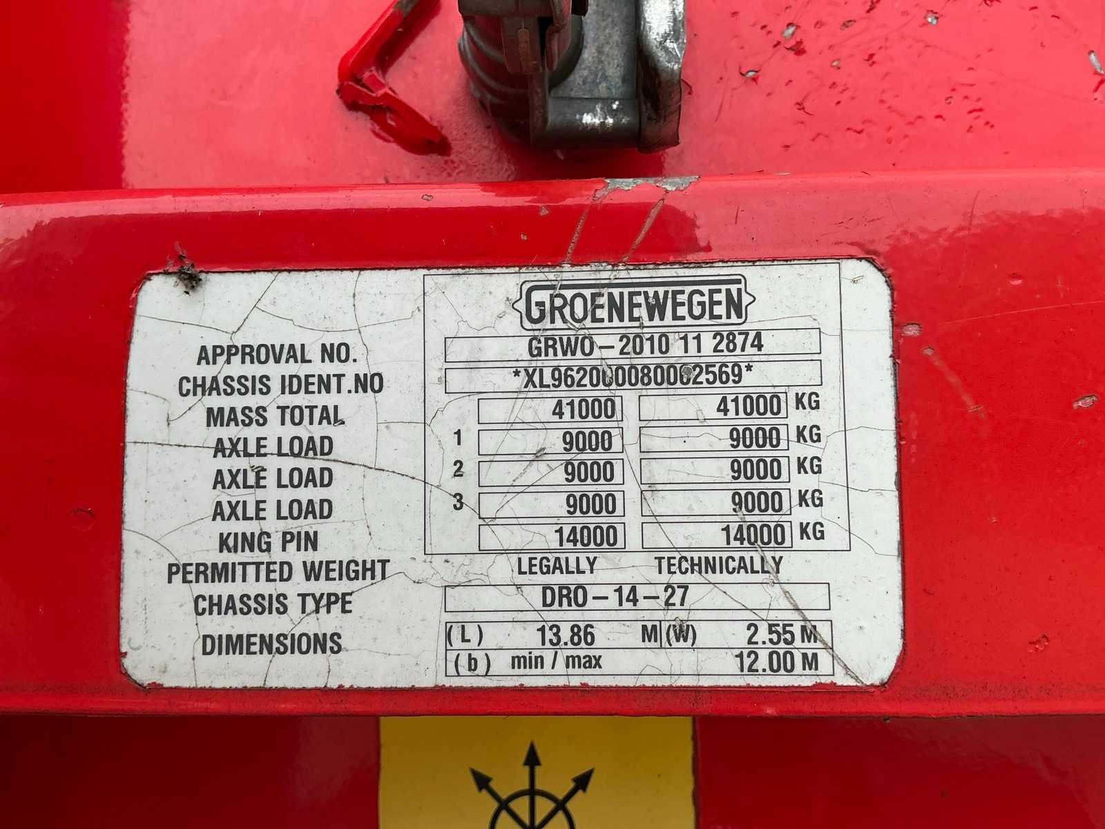 Max massa 41000kg, Afstand hart koppeling tot achterzijde voertuig 1200cm; Wielbasis 879 cm; luchtgeveerde BPW assen, 1e as is hefas; Voorzien van schuifdak, zijborden, schuifzeilen, Nee Merk: Groenewegen Type: DRO-14-27 Type aanhangwagencarrosserie: Tautliner Bouwjaar: 2008 Chassisnummer VIN: XL961000080002569 Kenteken: OK-34-NF Datum eerste toelating (NL): 2008-08-14 Datum eerste toelating: 2008-08-14 APK vervaldatum: 2026-08-29 Aantal assen: 3 Laadvermogen: 33700kg Eigen gewicht: 7300kg Totale afmeting L: 13860mm Totale afmeting Breedte: 2550mm Zelf rijdend exporteren: Ja