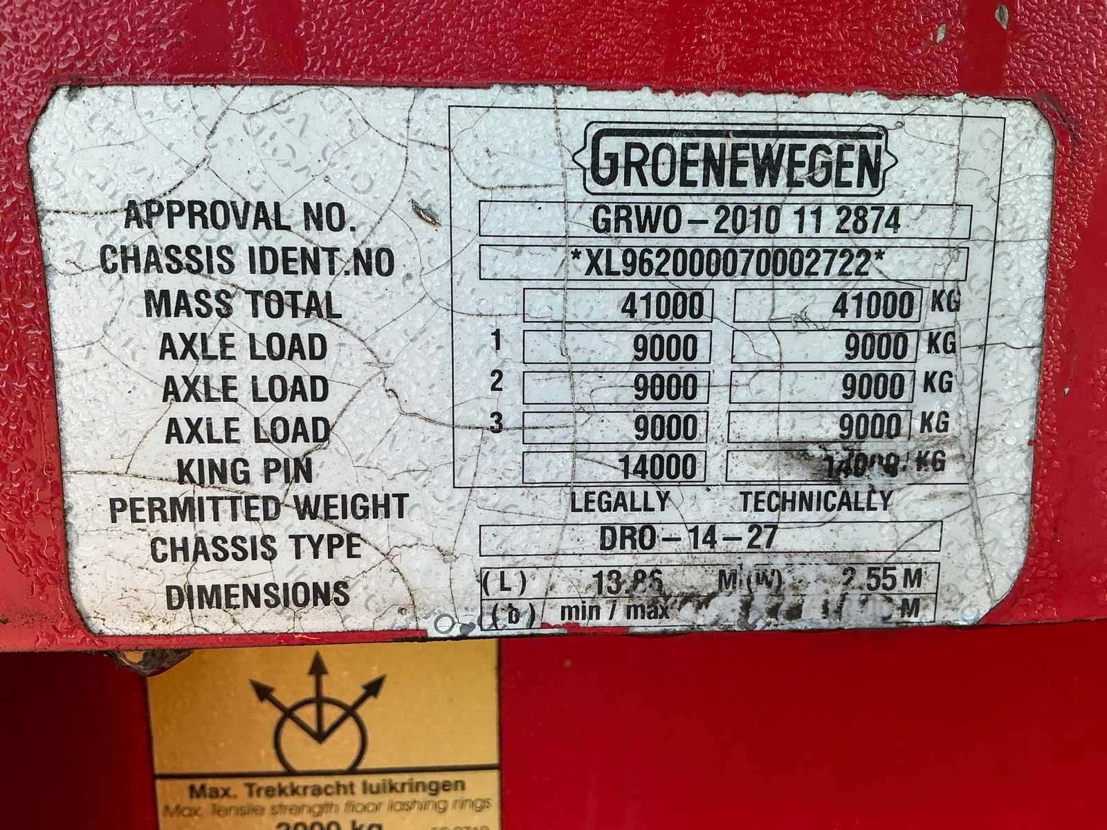 Max massa 41000kg, wielbasis 879cm, voorzien van luchtgeveerde BPW Eco assen waarvan 1e as als lift-as uitgevoerd, schuifdak, schuifzeilen Nee Merk: Groenewegen Type: DRO-14-27 Type aanhangwagencarrosserie: Tautliner Bouwjaar: 2008 Chassisnummer VIN: XL96000070002722 Kenteken: OK-61-DL Datum eerste toelating (NL): 2008-01-22 Datum eerste toelating: 2008-01-22 APK vervaldatum: 2026-01-24 Aantal assen: 3 Laadvermogen: 33700kg Eigen gewicht: 7300kg Totale afmeting L: 13860mm Totale afmeting Breedte: 2550mm Zelf rijdend exporteren: Ja
