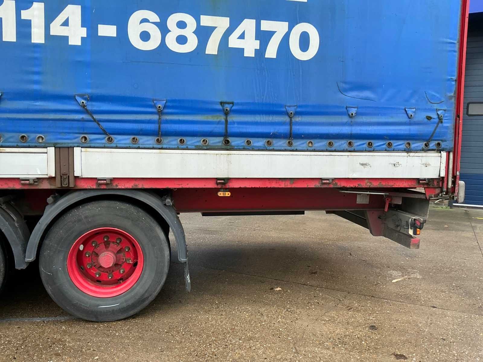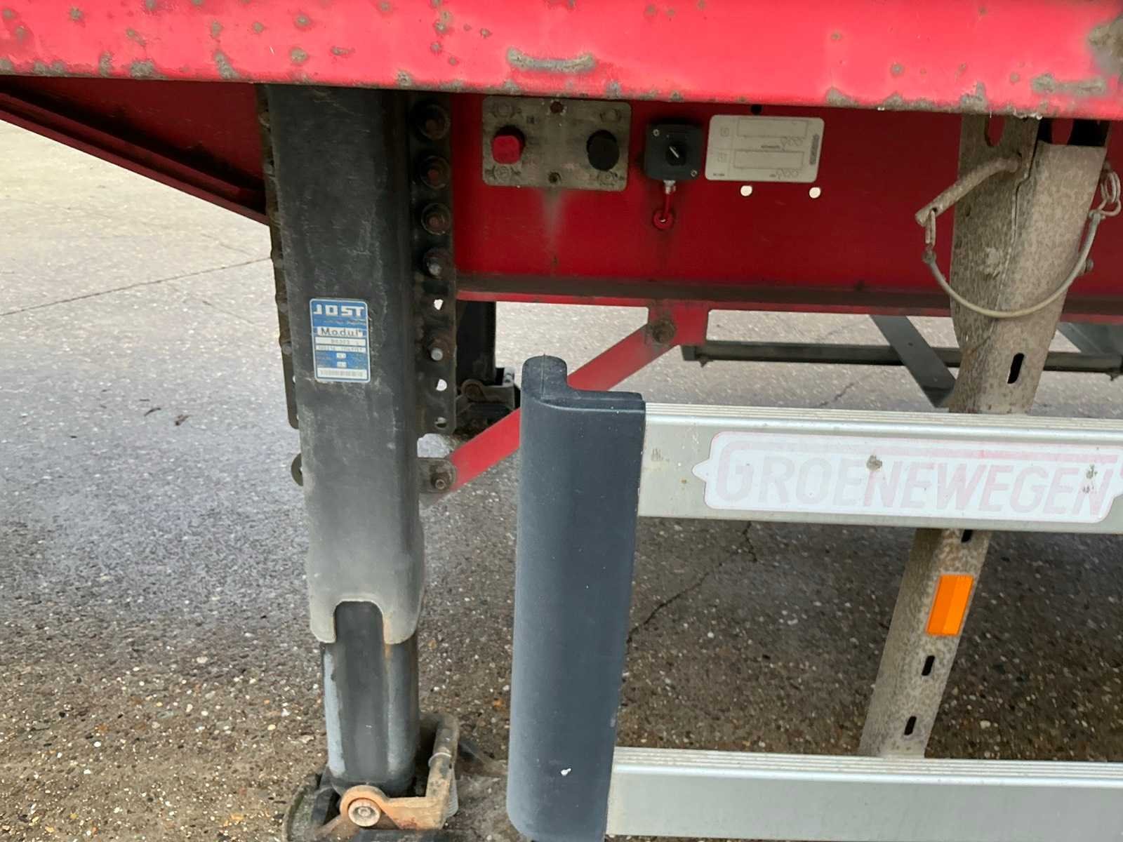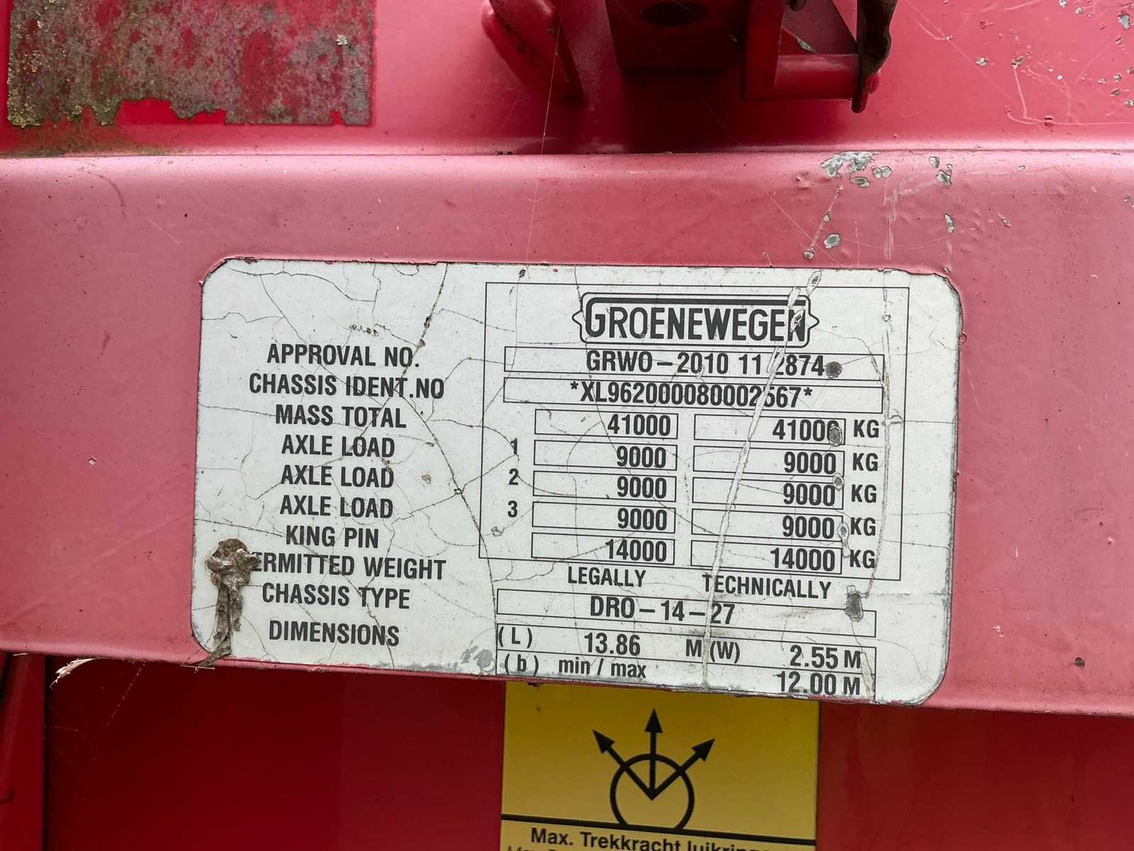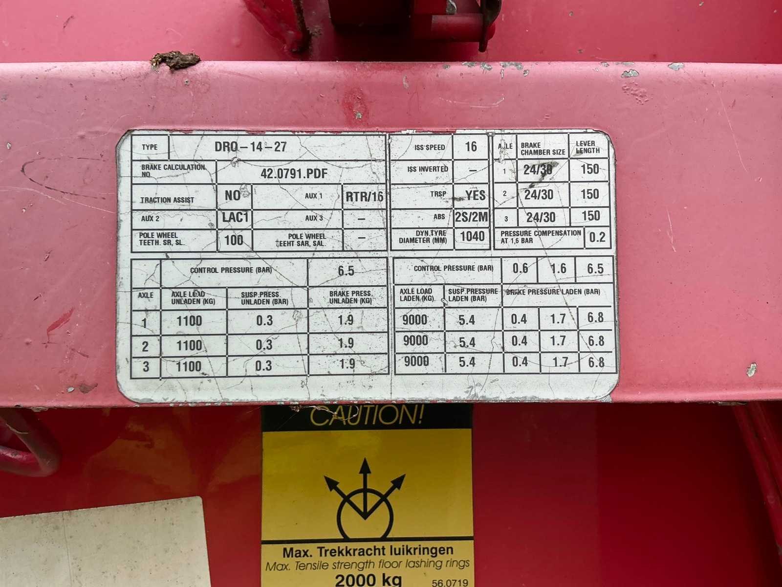 Max massa 41000kg., wielbasis 879cm; Afstand hart koppeling tot achterzijde voertuig 1200cm, As 1 uitgevoerd als hefas; Voorzien van luchtgeveerde BPW assen, 1e as is lift-as, aluminium zijborden, schuifzeilen en schuifdak, bandenmaat 385/65R22.5, 1deur ontbreekt, lekke ban(en) Nee Merk: Groenewegen Type: DRO-14-27 OK-32-NF Type aanhangwagencarrosserie: Tautliner Bouwjaar: 2008 Chassisnummer VIN: XL962000080002567 Kenteken: OK-32-NF Datum eerste toelating (NL): 2008-08-14 Datum eerste toelating: 2008-08-14 APK vervaldatum: 2024-04-26 Aantal assen: 3 Laadvermogen: 33700kg Eigen gewicht: 7300kg Totale afmeting L: 13860mm Totale afmeting Breedte: 2550mm Zelf rijdend exporteren: Nee No self drive export!: true