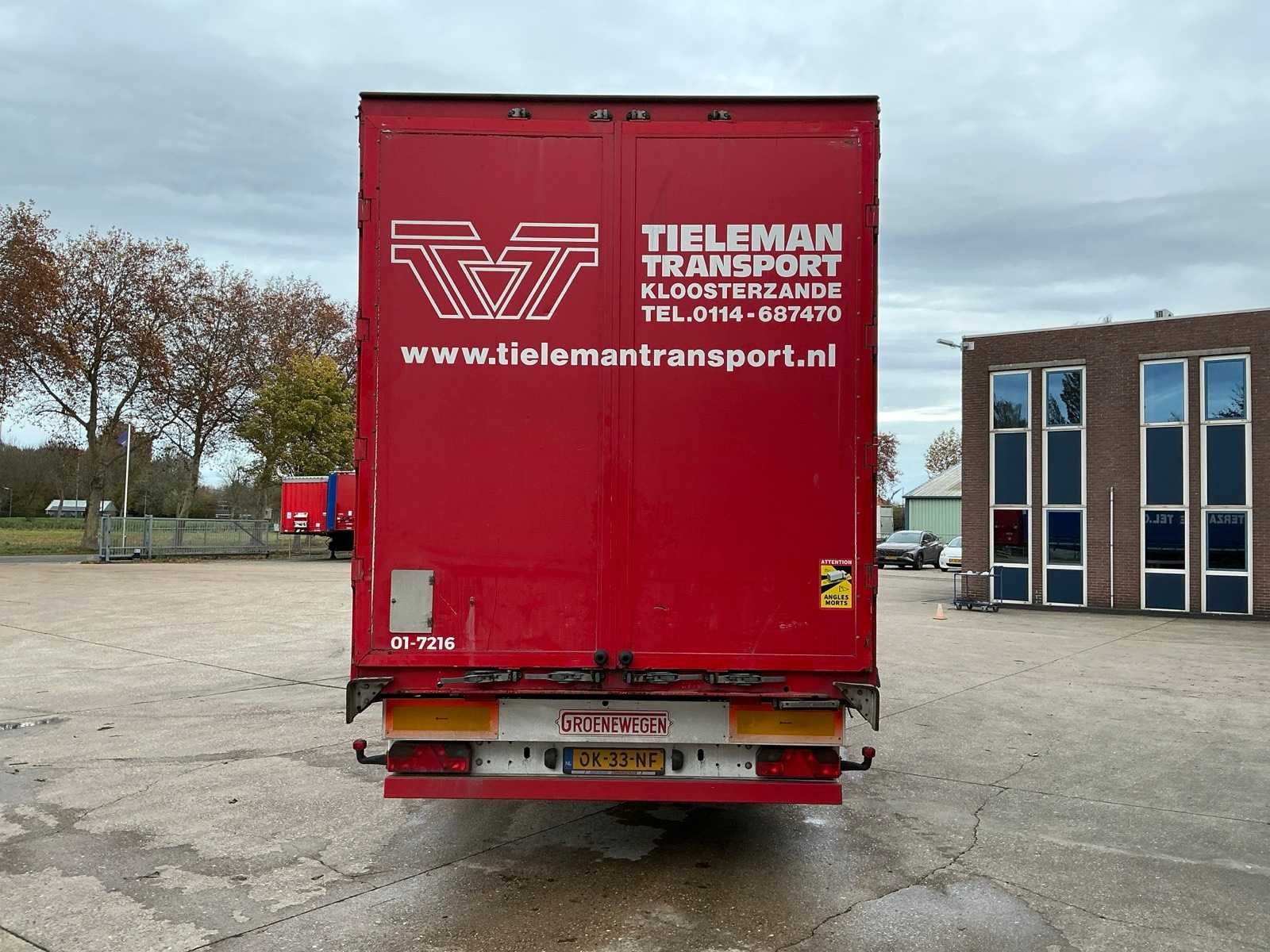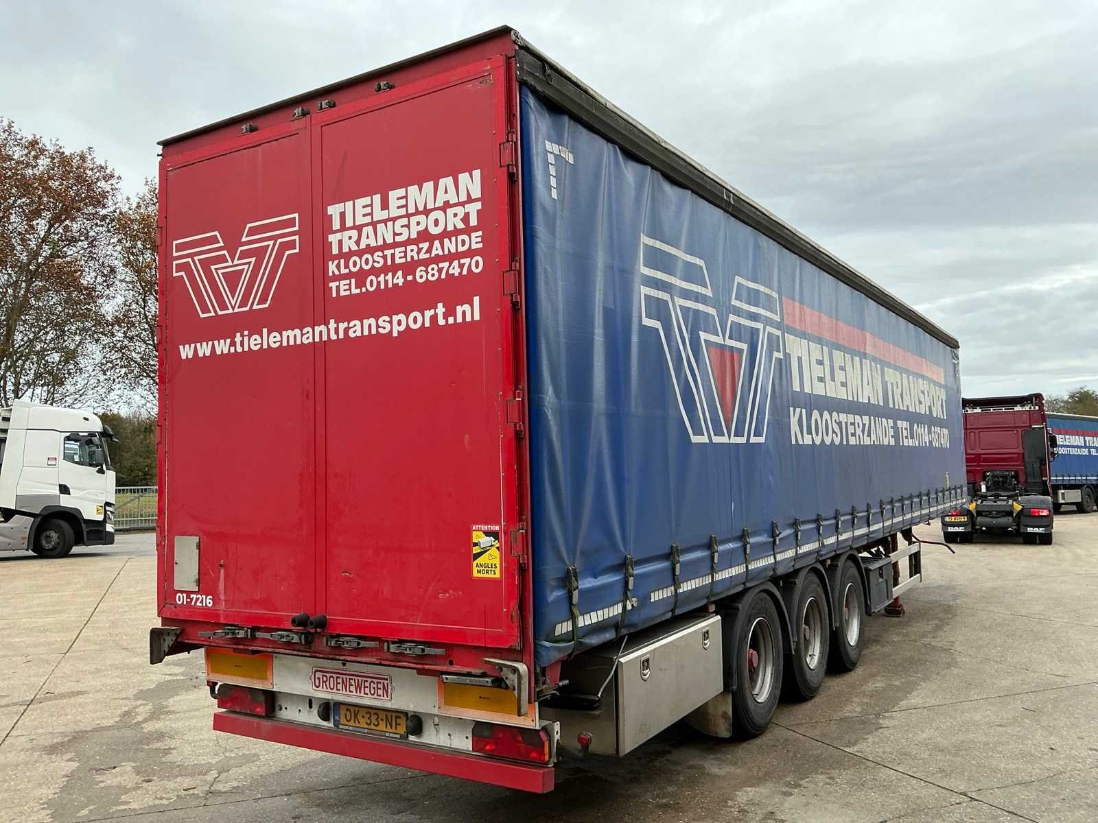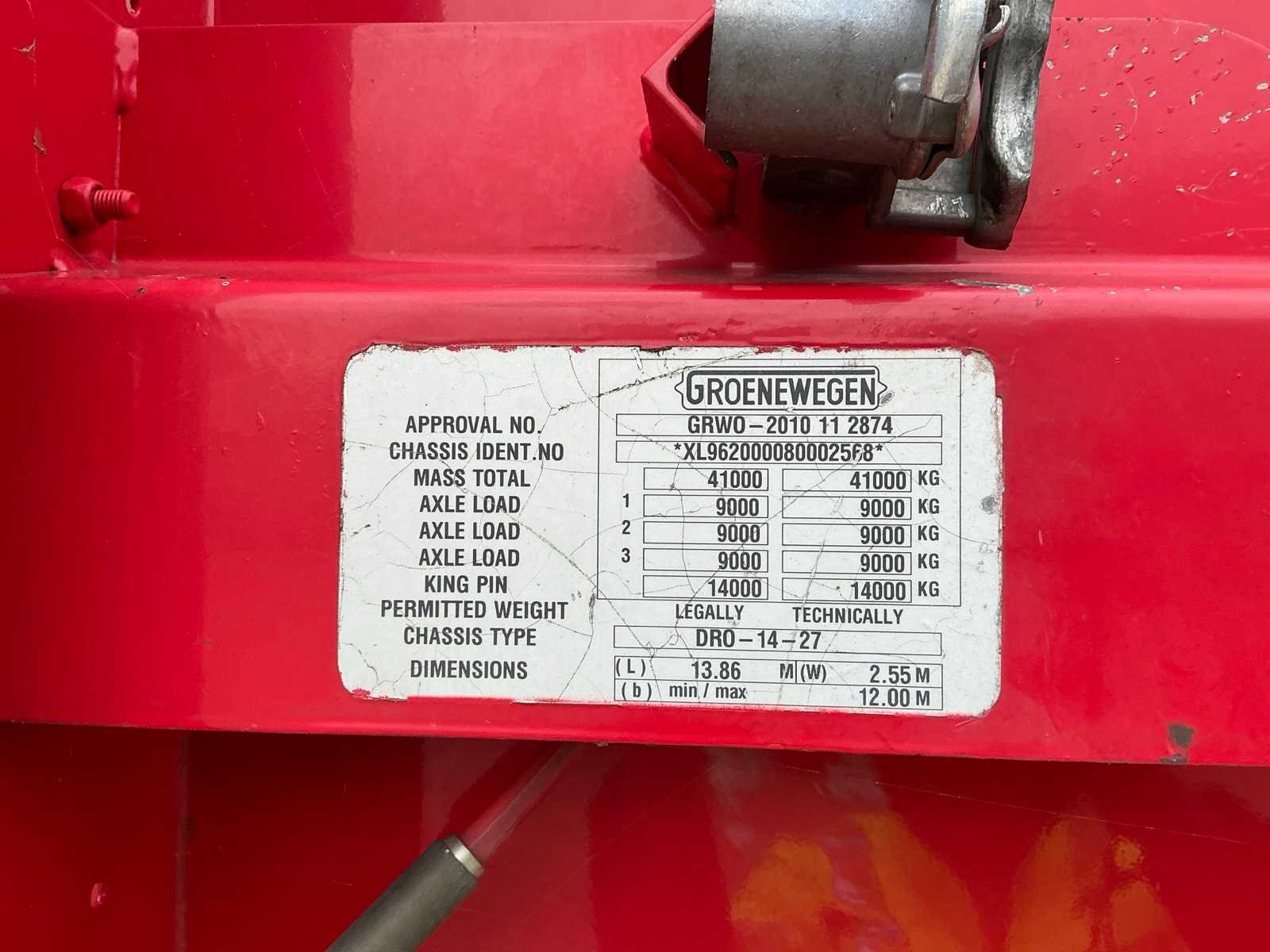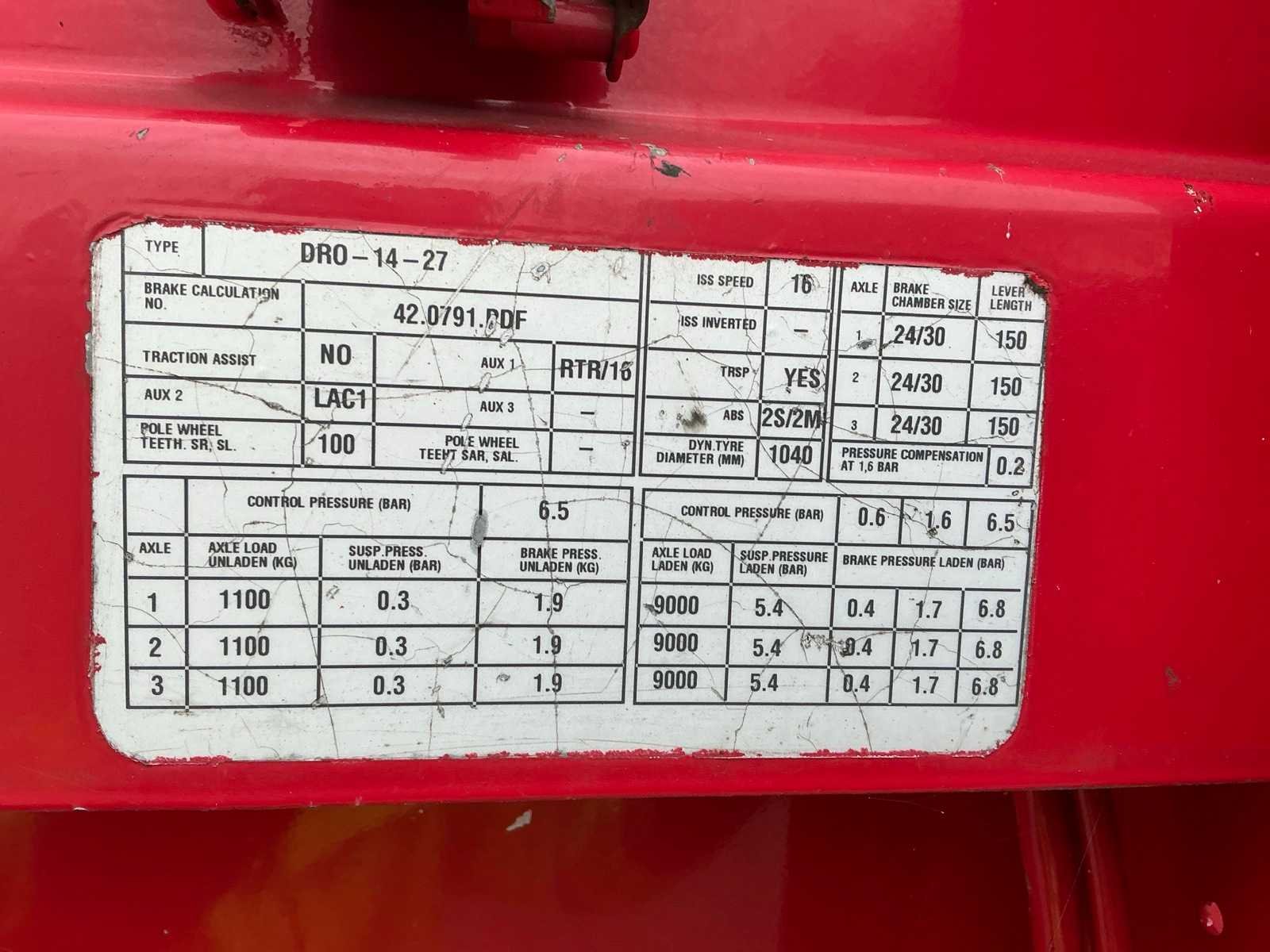 Max massa 41000kg, Afstand hart koppeling tot achterzijde voertuig 1200cm; Wielbasis 879 cm; voorzien van luchtgeveerde BPW assen, 1e as is hefas Nee Merk: Groenewegen Type: DRO-14-27 Type aanhangwagencarrosserie: Tautliner Bouwjaar: 2008 Chassisnummer VIN: XL962000080002568 Kenteken: OK-33-NF Datum eerste toelating (NL): 2008-08-14 Datum eerste toelating: 2008-08-14 APK vervaldatum: 2026-07-04 Aantal assen: 3 Laadvermogen: 33700kg Eigen gewicht: 7300kg Totale afmeting L: 13860mm Totale afmeting Breedte: 2550mm Zelf rijdend exporteren: Ja