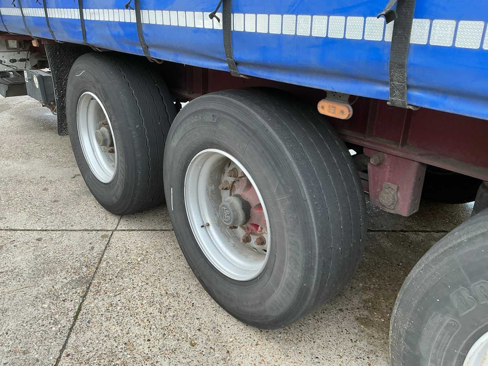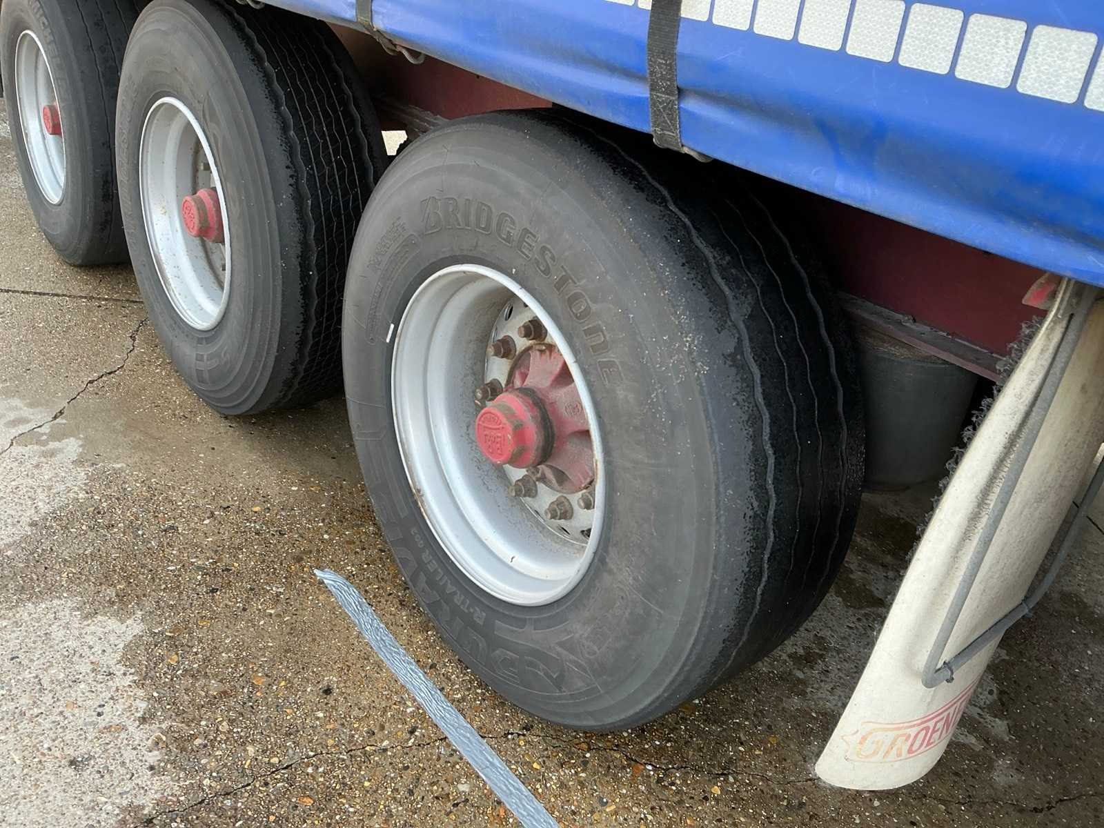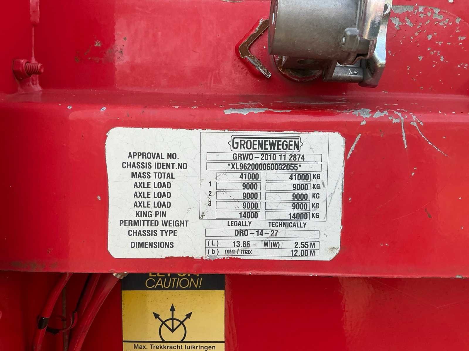 Max massa 41000kg., wielbasis 879cm; Afstand hart koppeling tot achterzijde voertuig 1200cm, As 1 uitgevoerd als hefas; Voorzien van luchtgevverde BPW Eco assen, aluminium schotten en AMA laadklep Nee Merk: Groenewegen Type: DRO-12-27 Type aanhangwagencarrosserie: Tautliner Bouwjaar: 2006 Chassisnummer VIN: XL962000060002055 Kenteken: OJ-87-DS Datum eerste toelating (NL): 2006-02-06 Datum eerste toelating: 2006-02-06 APK vervaldatum: 2026-03-02 Aantal assen: 3 Laadvermogen: 33700kg Hydraulische laadklep: true Eigen gewicht: 7300kg Totale afmeting L: 13860mm Totale afmeting Breedte: 2550mm Zelf rijdend exporteren: Ja