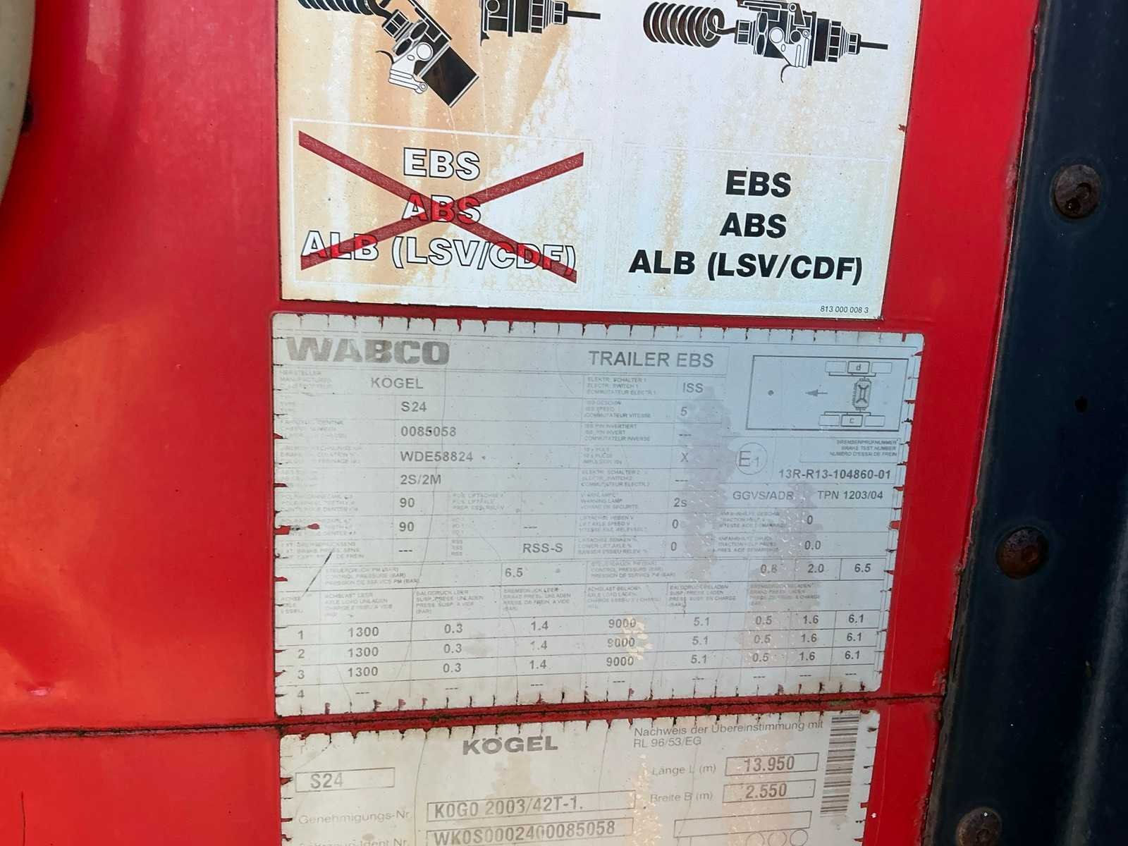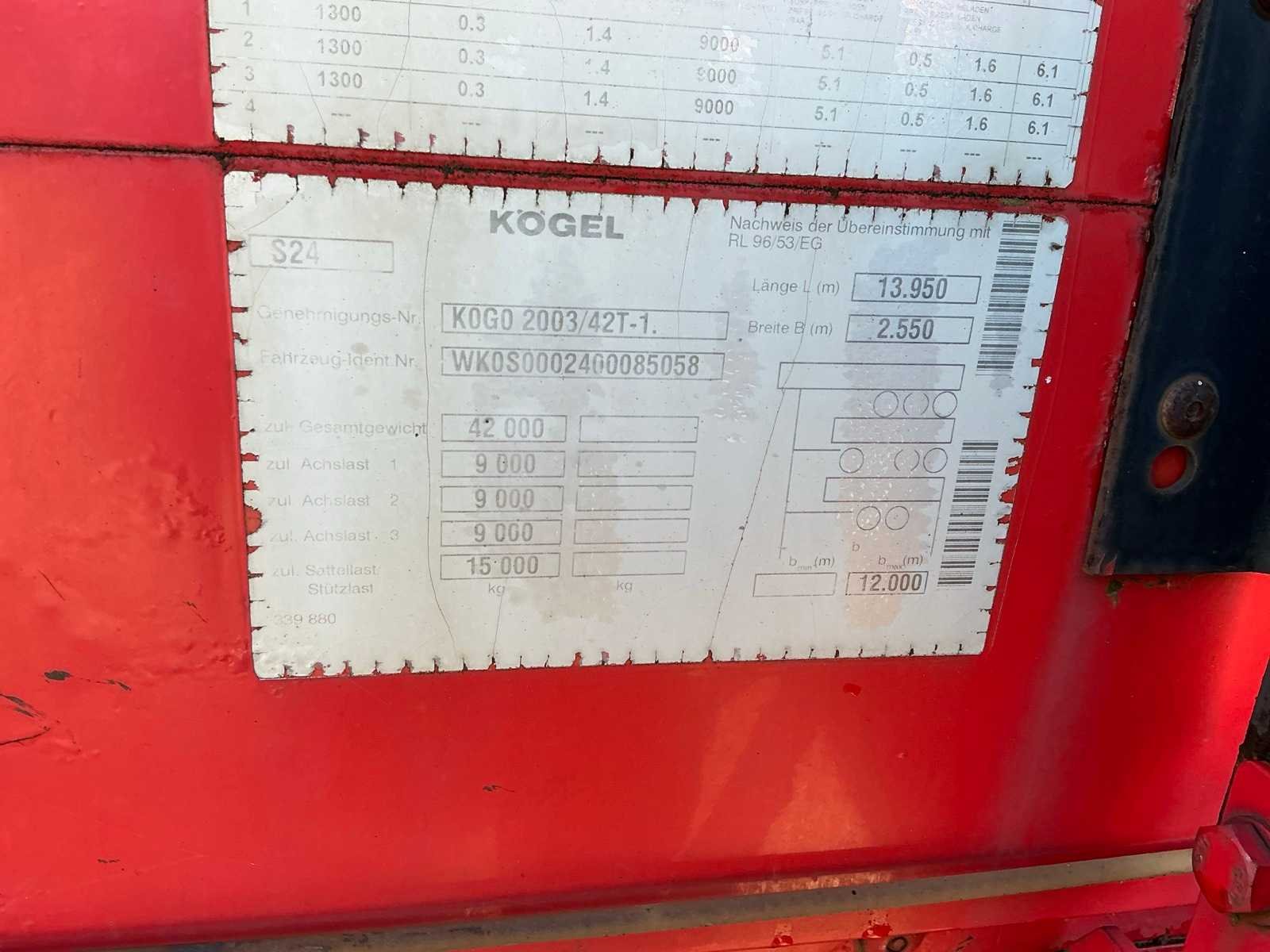 Kogel, Kögel, Max massa 42000kg, wielbasis 901cm, voorzien van luchtgeveerde SAF assen, aluminium zijborden, schuifzeilen en schuifdak Nee Merk: Koegel Type: S24 Type aanhangwagencarrosserie: Tautliner Bouwjaar: 2007 Chassisnummer VIN: WK0S0002400085058 Kenteken: OJ-22-VS Datum eerste toelating (NL): 2007-06-27 Datum eerste toelating: 2007-06-27 APK vervaldatum: 2022-08-24 Aantal assen: 3 Laadvermogen: 35700kg Eigen gewicht: 6300kg Totale afmeting L: 13920mm Totale afmeting Breedte: 2550mm Zelf rijdend exporteren: Nee No self drive export!: true