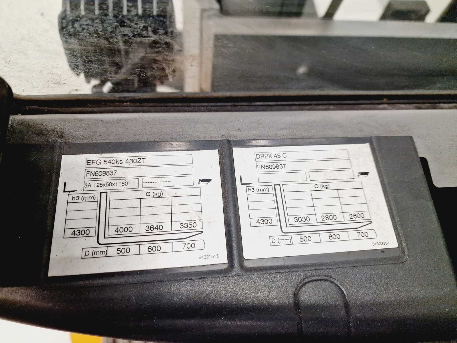 Nieuwe side-shift 4de functie tot vorkenbord Nee Merk: Jungheinrich Type: EFG 540KS Bouwjaar: 2019 Serienummer: FN609837 Brandstof: Elektrisch Aantal wielen: 4 Side-shift: true Duplex mast: true Eigen gewicht: 6800kg Hefvermogen: 4000kg Hefhoogte: 4300mm Vol rubber banden: true Totale afmeting L: 4800mm Totale afmeting Breedte: 1250mm Totale afmeting Hoogte: 2900mm