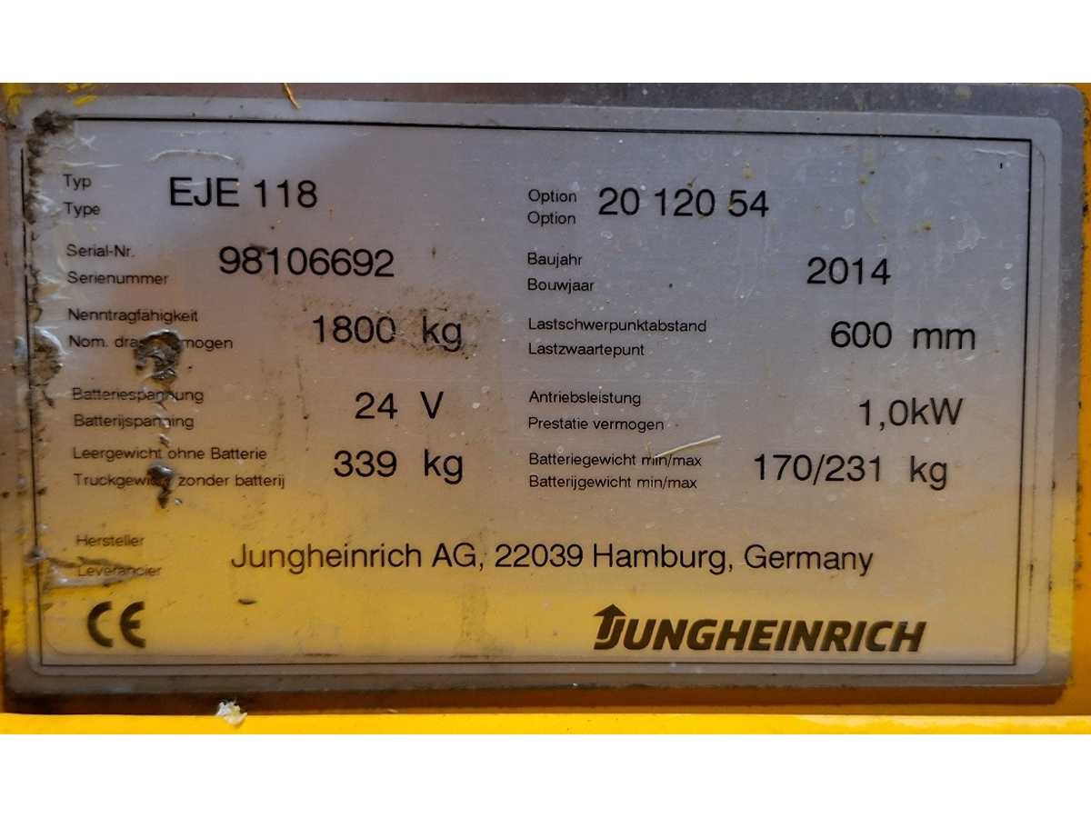 Bezichtiging op afspraak!! Nee Merk: Jungheinrich Type: EJE118 Bouwjaar: 2014 Serienummer: 98106692 Hefvermogen: 1800kg Lepellengte: 1200mm Afgelezen urenstand: 4816 Eigen gewicht: 550kg