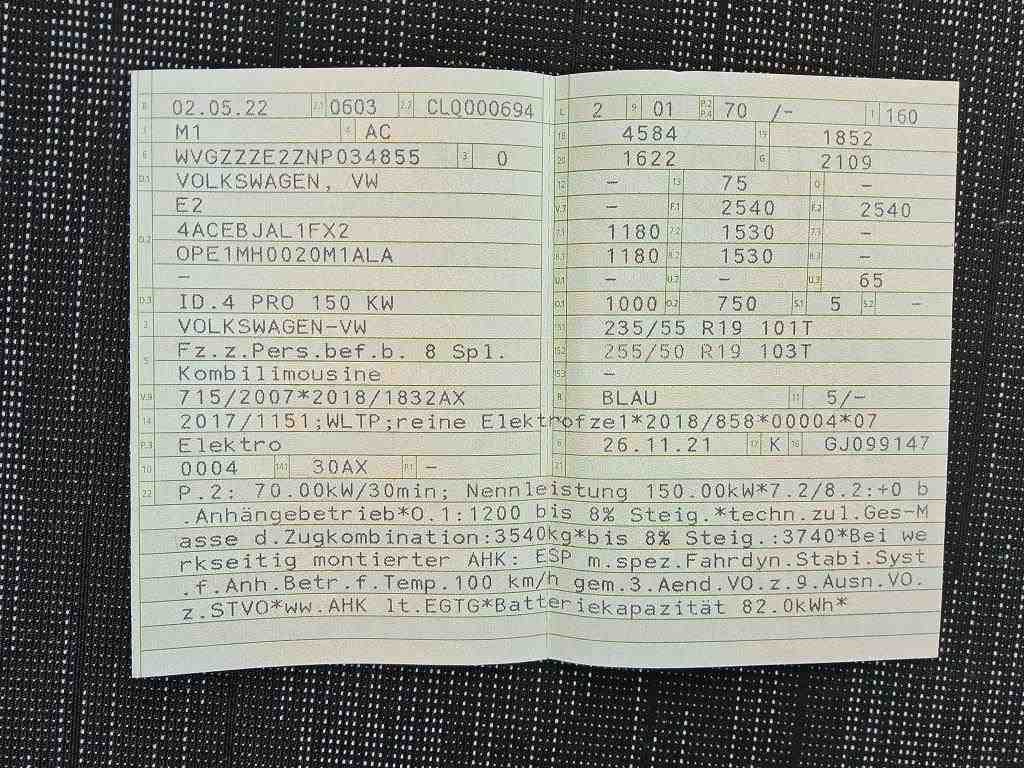 Duitse kenteken papieren. Indien gewenst kunnen wij het gehele import proces voor u verzorgen, RDW invoer, BPM taxatie, Douane afwikkeling, stalling etc. Voor deze auto zijn de totale invoerkosten inclusief de BPM €1.195.- Dus voor €1.195.- boven op uw aankoopprijs verzorgen wij het NL kenteken voor u. (This option is only for Dutch buyers) Voor vragen kunt u mailen naar info@auto-auctions.nl No Kenteken: Duitse kenteken papieren Merk: Volkswagen Model: ID.4 Type: Pro 77 kWh Afgelezen kilometerstand: 94630km Vermogen (kW): 150kW Brandstof: Elektrisch Chassisnummer: WVGZZZE2ZNP034855 Datum eerste toelating: 02-05-2022 Vermogen (pk): 204hp Kleur: Blue Dusk Metallic Transmissie: Automaat Aantal sleutels: 2 Carrosserie: SUV Nationaliteit documenten: Duitse kenteken papieren Onderhoudshistorie: Digitaal volledig aanwezig Start en rijdt: Ja oplaadkabel : Aanwezig