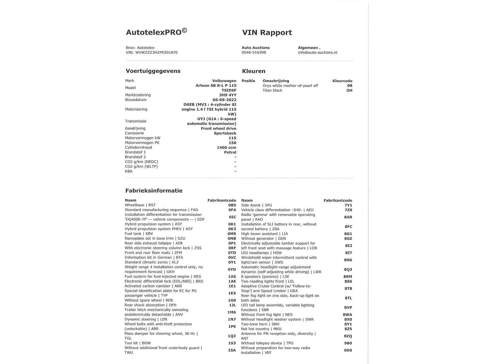 Duitse kenteken papieren. Indien gewenst kunnen wij het gehele import proces voor u verzorgen, RDW invoer, BPM taxatie, Douane afwikkeling, stalling etc. Voor deze auto zijn de totale invoerkosten inclusief de BPM €1.195.- Dus voor €1.195.- boven op uw aankoopprijs verzorgen wij het NL kenteken voor u. (This option is only for Dutch buyers) Voor vragen kunt u mailen naar info@auto-auctions.nl No Kenteken: Duitse Kenteken Papieren Merk: Volkswagen Model: Arteon Shooting Brake Type: 1.4 TSI eHybrid R-Line 2X Afgelezen kilometerstand: 164829km Cilinderinhoud: 1395cc Vermogen (kW): 160kW Brandstof: Hybride Benzine Chassisnummer: WVWZZZ3HZPE501870 Datum eerste toelating: 04-10-2022 Vermogen (pk): 218hp Aantal zitplaatsen: 5 Kleur: Oryx White Pearl Effect Transmissie: Automaat Aantal deuren: 5 Aantal sleutels: 2 Velgmaat: 19 Aantal cilinders: 4 Carrosserie: Stationwagen Nationaliteit documenten: Duitse kenteken papieren Onderhoudshistorie: Digitaal Volledig Aanwezig Start en rijdt: Ja oplaadkabel : Aanwezig