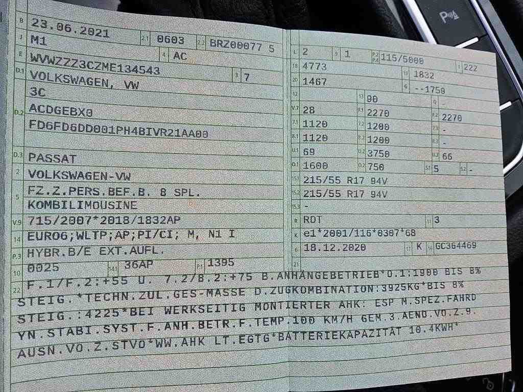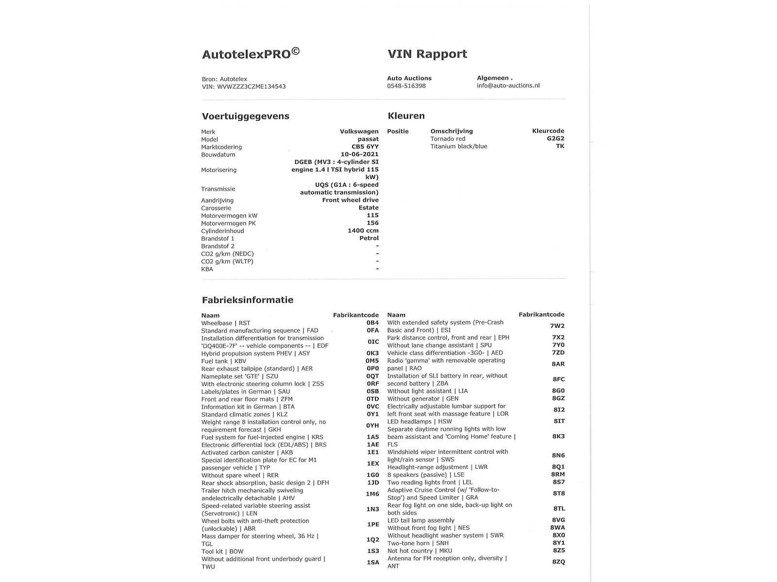 Duitse kenteken papieren. Indien gewenst kunnen wij het gehele import proces voor u verzorgen, RDW invoer, BPM taxatie, Douane afwikkeling, stalling etc. Voor deze auto zijn de totale invoerkosten inclusief de BPM €1.195.- Dus voor €1.195.- boven op uw aankoopprijs verzorgen wij het NL kenteken voor u. (This option is only for Dutch buyers) Voor vragen kunt u mailen naar info@auto-auctions.nl No Kenteken: Duitse Kenteken Papieren Merk: Volkswagen Model: Passat Type: Variant GTE 1.4 TSI PHEV Afgelezen kilometerstand: 115432km Cilinderinhoud: 1395cc Vermogen (kW): 160kW Brandstof: Hybride Benzine Chassisnummer: WVWZZZ3CZME134543 Datum eerste toelating: 23-06-2021 Vermogen (pk): 218hp Aantal zitplaatsen: 5 Kleur: Tornado Red Transmissie: Automaat Aantal deuren: 5 Aantal sleutels: 2 Velgmaat: 17 Aantal cilinders: 4 Carrosserie: Stationwagen Nationaliteit documenten: Duitse Kenteken Papieren Onderhoudshistorie: Digitaal Volledig Aanwezig Start en rijdt: Ja oplaadkabel : Aanwezig