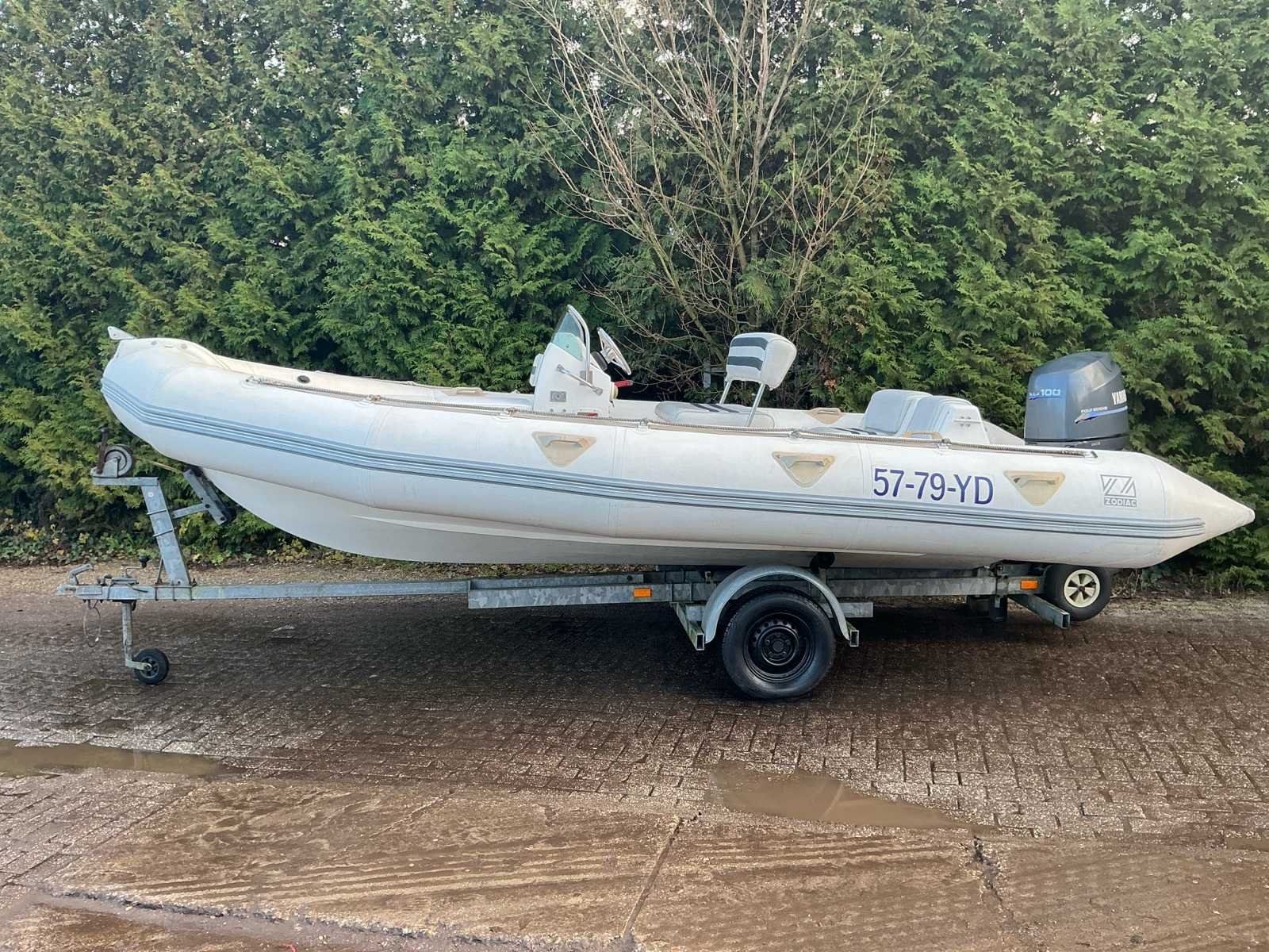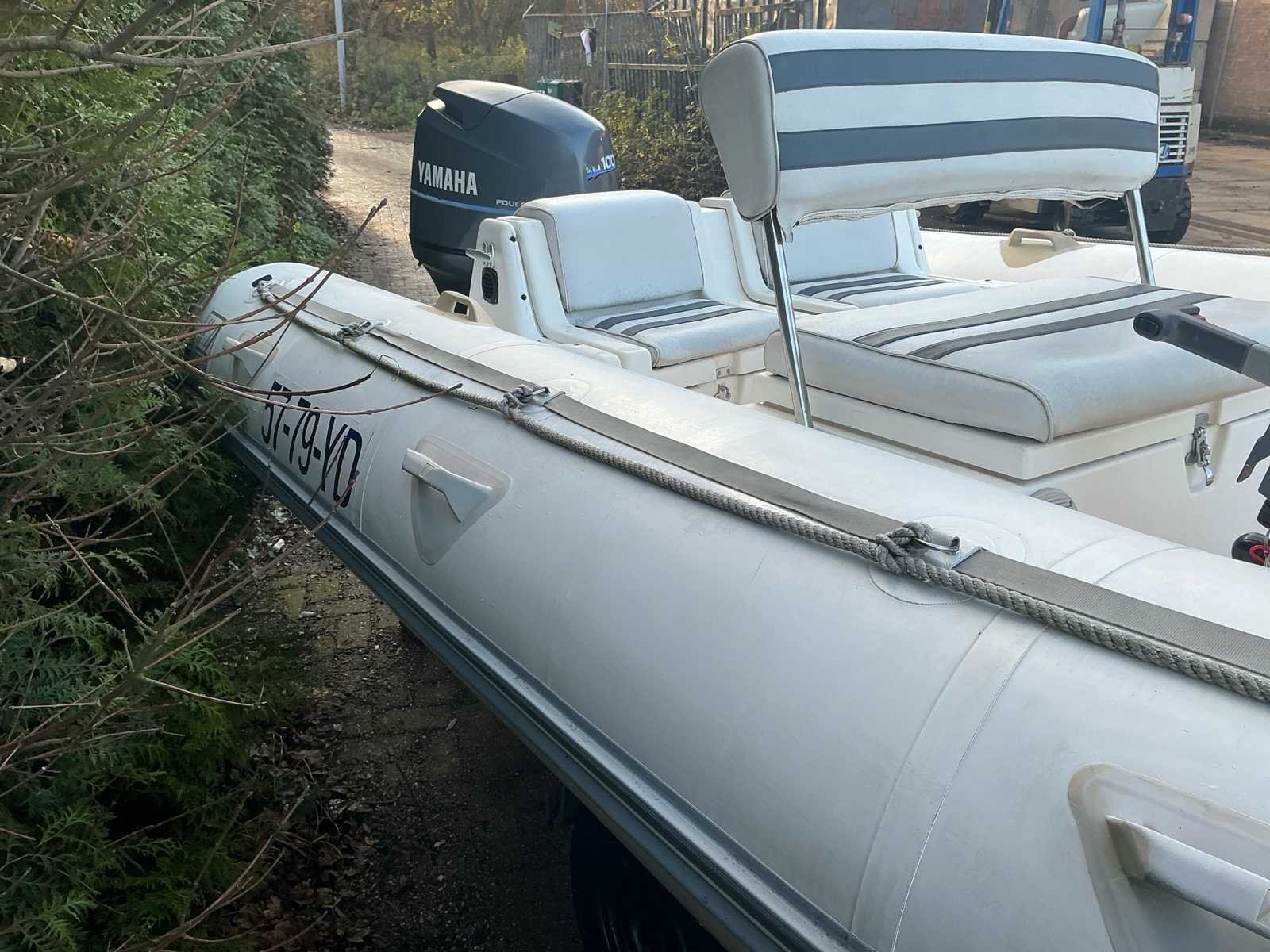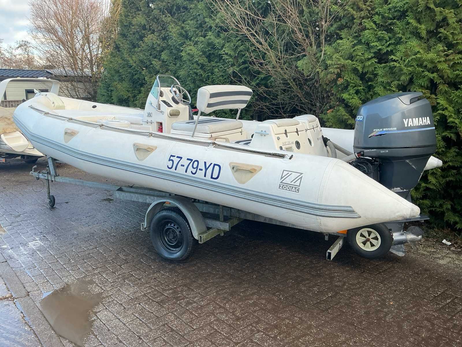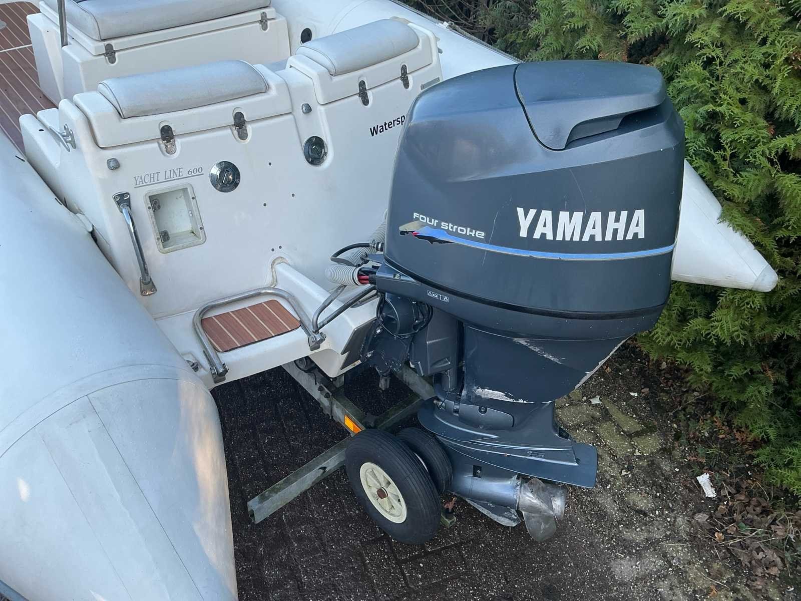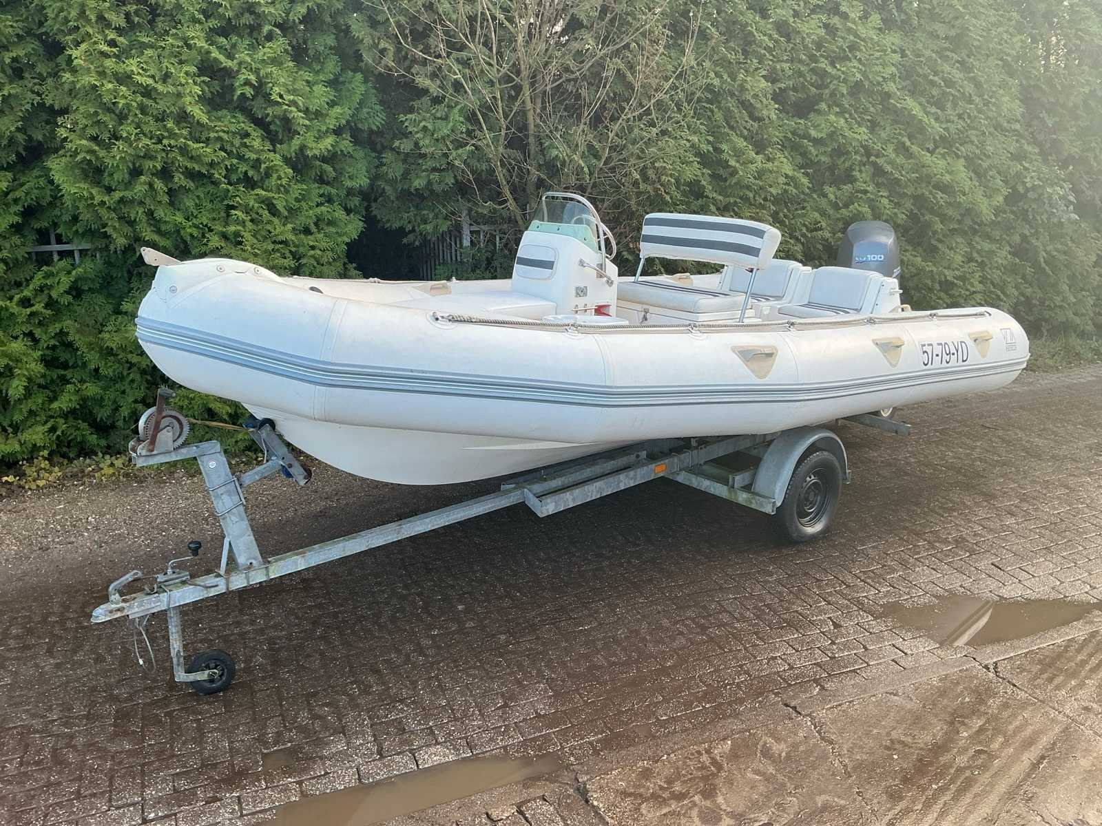 100pk Yamaha 4 takt Elektrische start Elektrische Powertrim Lengte over alles 6M Teak (look) inleg Zwemtrap Ruim zonnedek Tafel Interne bezinetank Radio + boxen (werking onbekend) Zelflozende kuip Afdekzeil Diverse tellers Vaste benzinetank Stallingstrailer Pomp Topsnelheid +-60kmph Nee Merk: Zodiac Type: Yacht Line 600 Rompmateriaal: Polyester Brandstof: Benzine