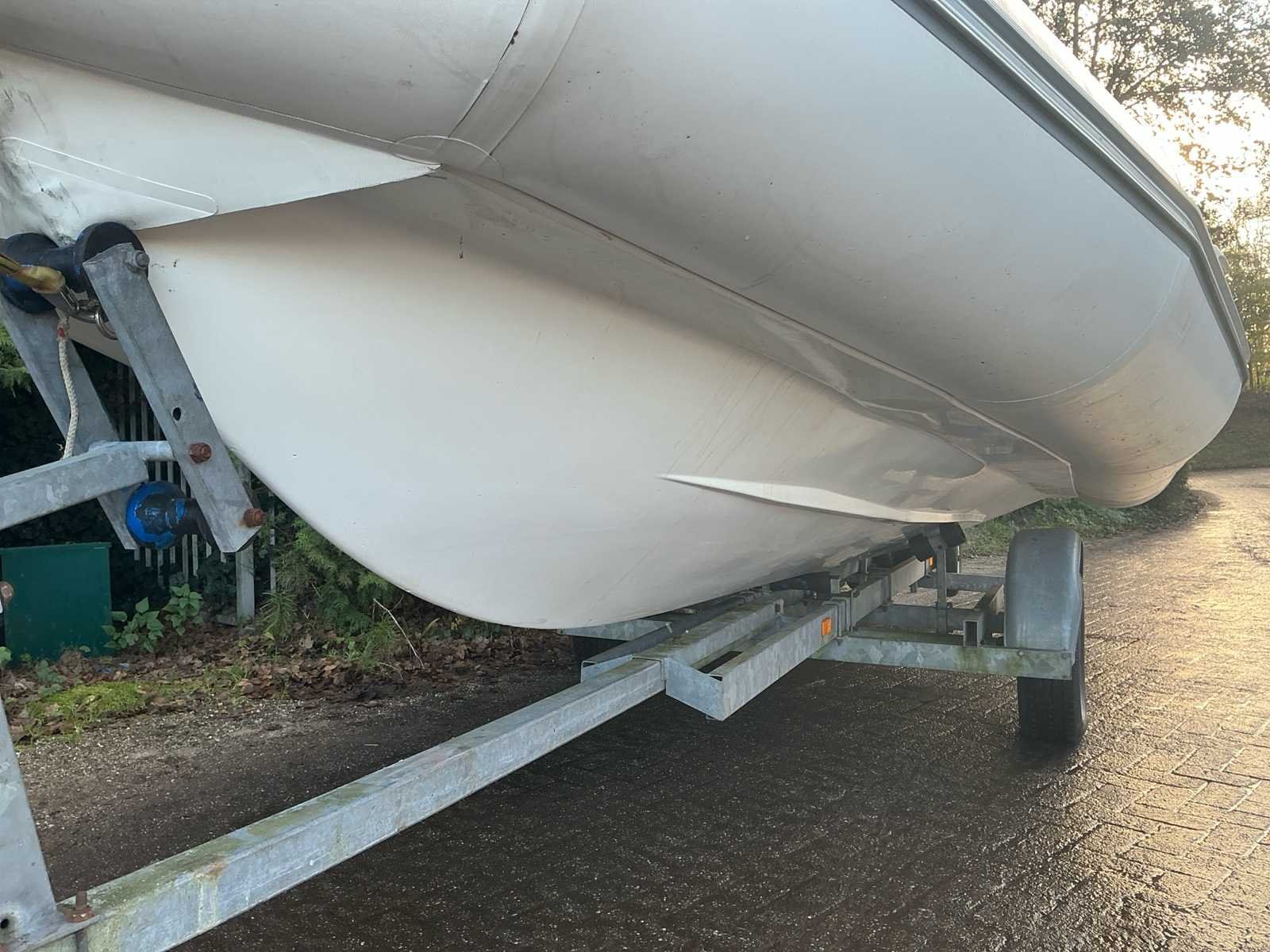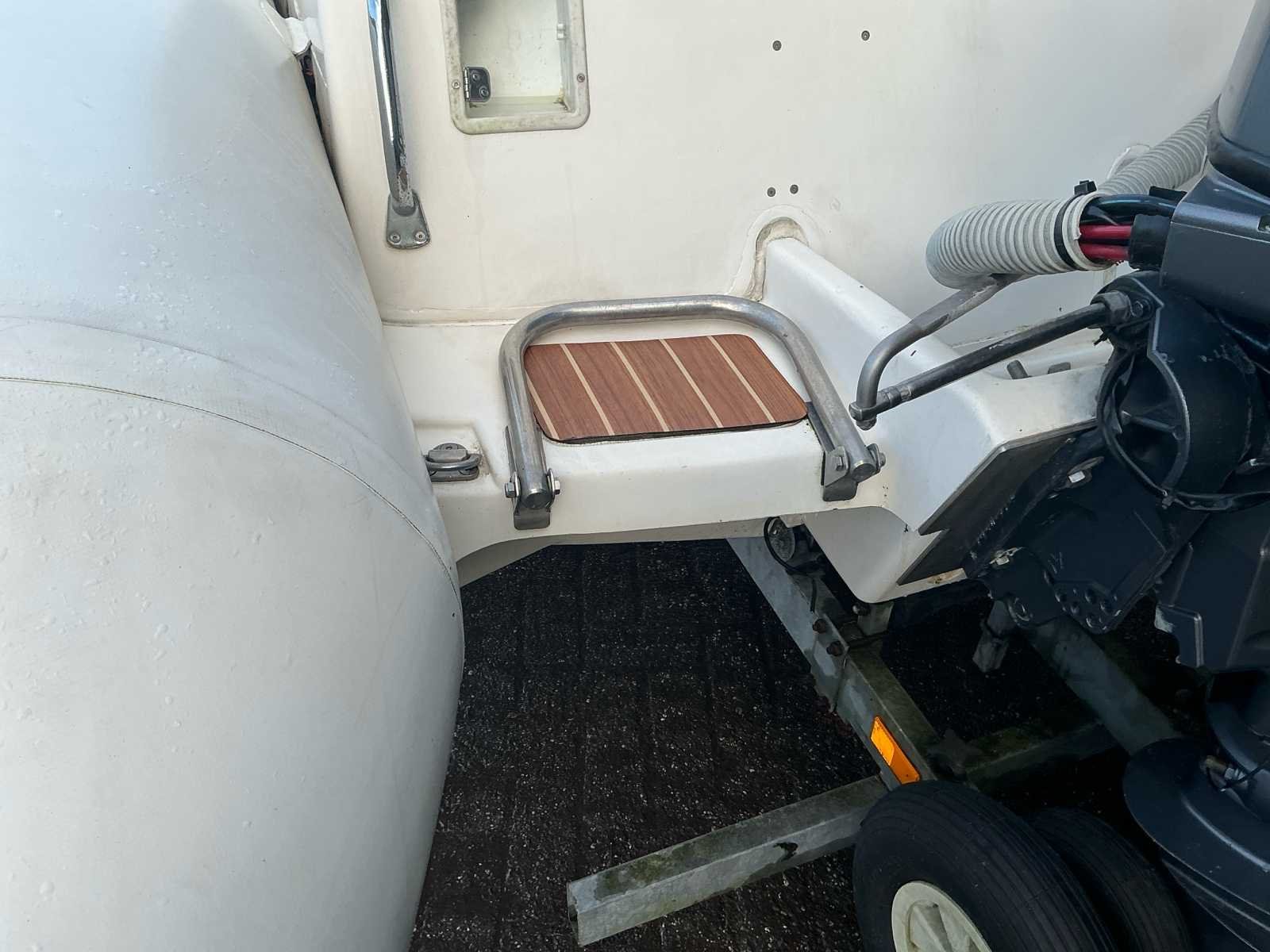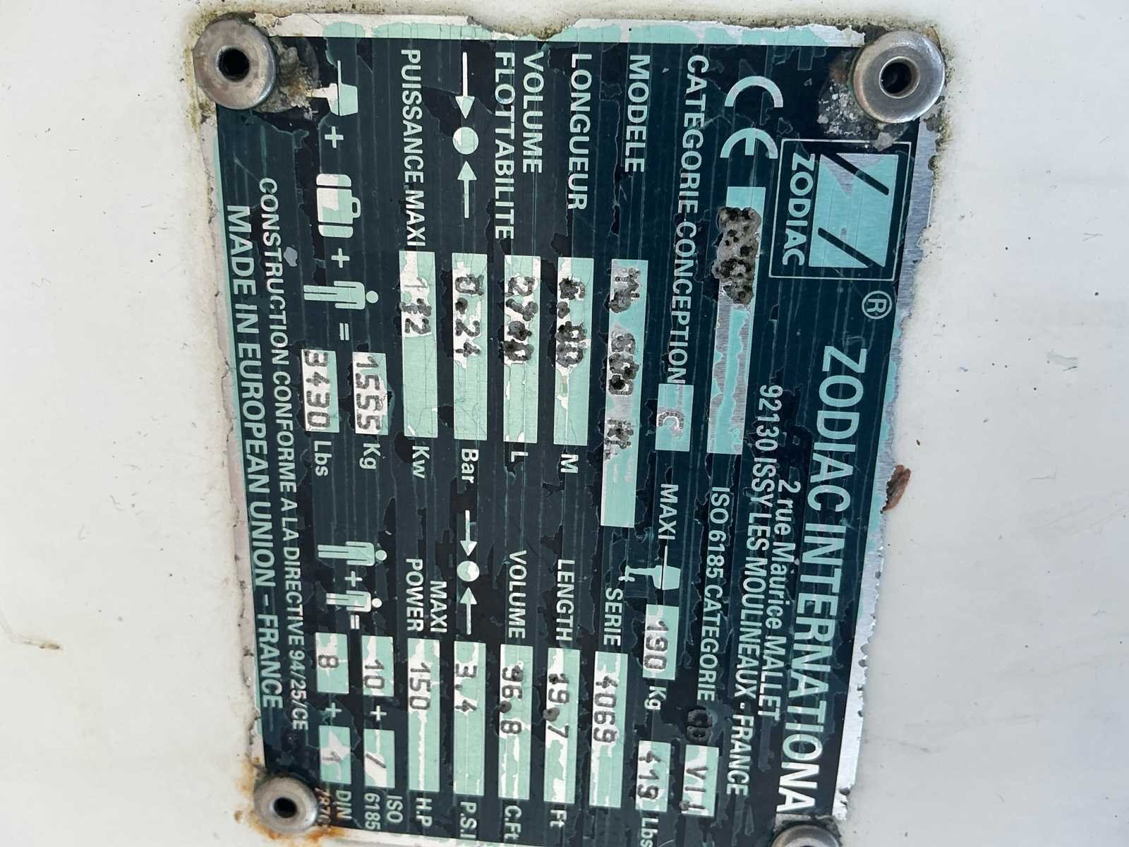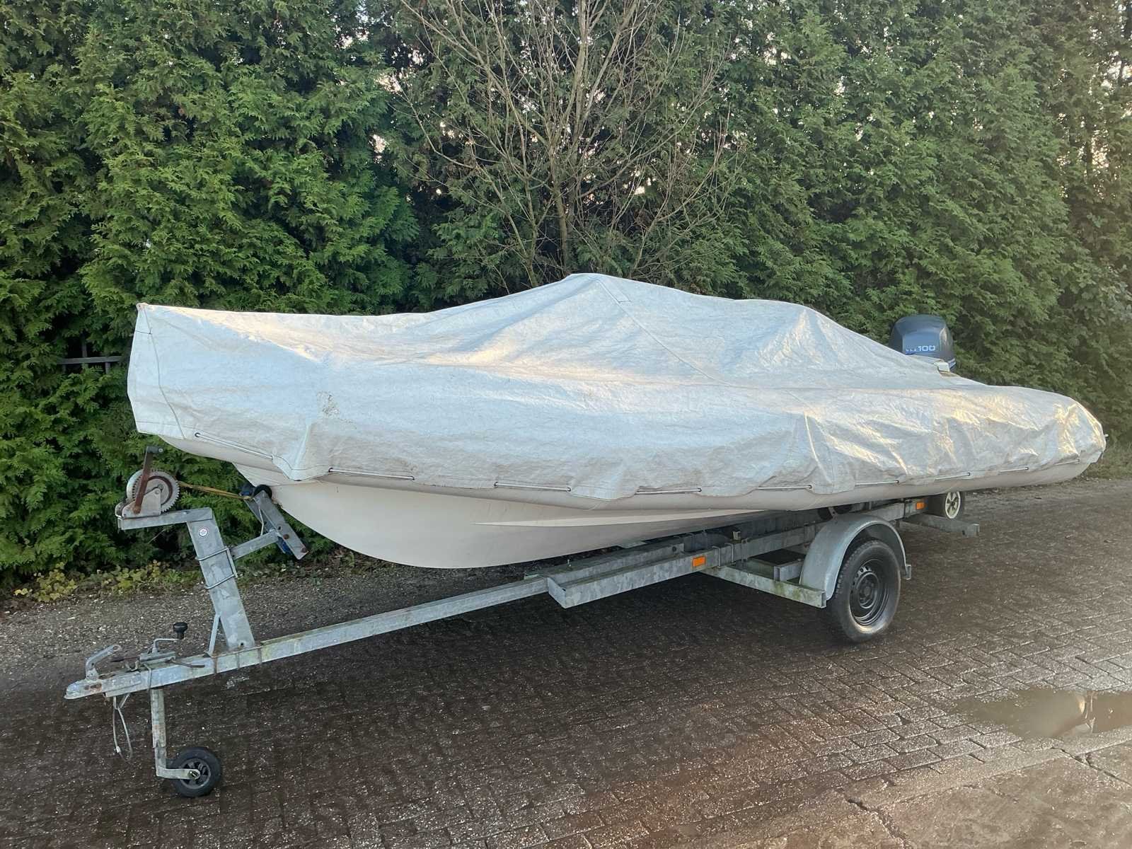 100pk Yamaha 4 takt Elektrische start Elektrische Powertrim Lengte over alles 6M Teak (look) inleg Zwemtrap Ruim zonnedek Tafel Interne bezinetank Radio + boxen (werking onbekend) Zelflozende kuip Afdekzeil Diverse tellers Vaste benzinetank Stallingstrailer Pomp Topsnelheid +-60kmph Nee Merk: Zodiac Type: Yacht Line 600 Rompmateriaal: Polyester Brandstof: Benzine