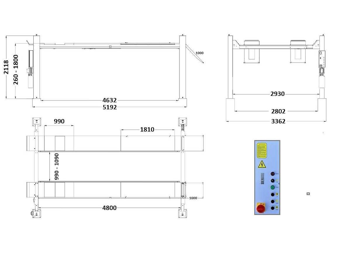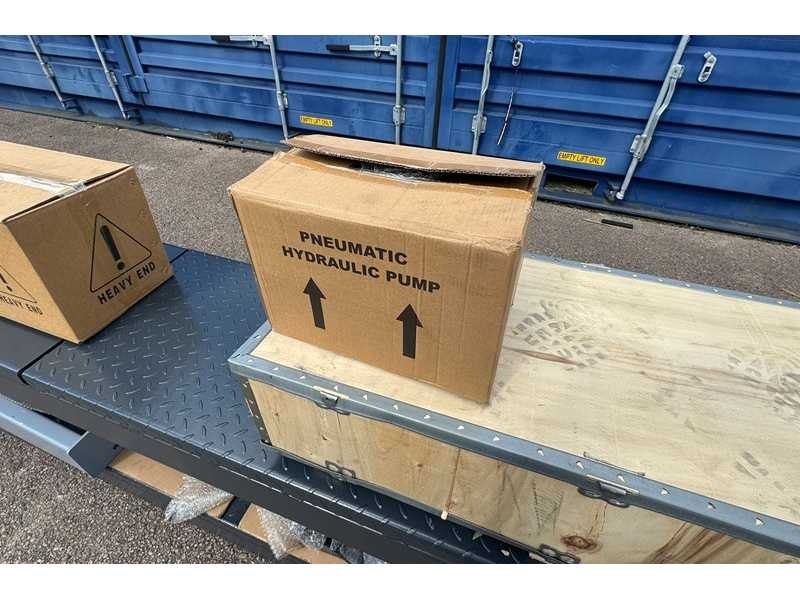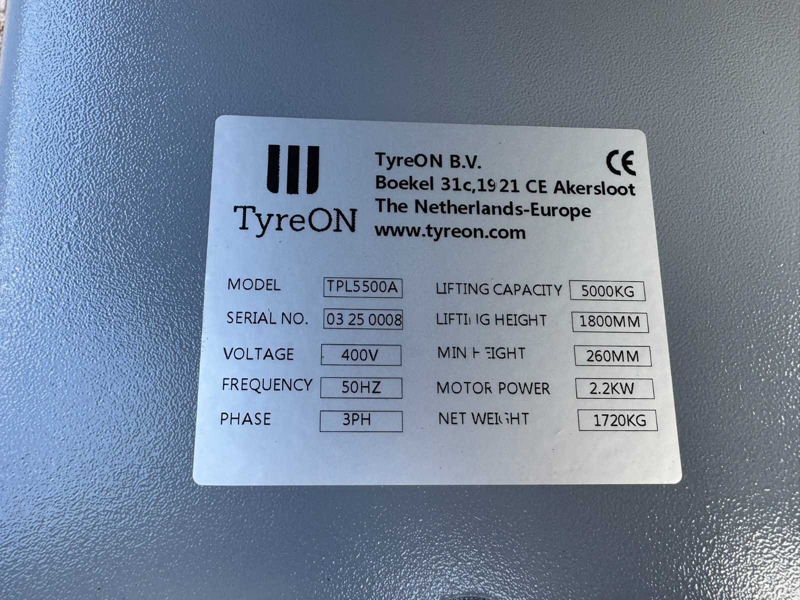 Ongebruikte TyreON TPL5500A elektro‑hydraulische 4-koloms uitlijnhefbrug. Voorzien van achterwiel uitlijnplaten + rijbaan-vulplaten, met geïntegreerde 2,5 ton lucht-hydraulische rolkrik (TRJ25ALP) en LED rijbaanverlichting met beschermroosters (LED8P); rijbanen 4,8 meter lang × ca. 50 cm breed; hefvermogen 5 000 kg; maximale hefhoogte ca. 180 cm; aangedreven door 2,2 kW elektromotor (400V, 3-fase); voorzien van mechanicshe vergrendeling en automatische ontgrendeling bij op/neer bewegen; Afrolbeveiliging voor en achter; lastafhankelijk daalventiel; mechanisch synchroon via stalen kabels; Bediening via bedieningsconsole (24V); handmatige nooddaal-voorziening bij stroomuitval; verstelbare rijbaanafstand van 99 tot 115 cm (geschikt voor het heffen van voertuigen met wielbasis tot ca. 4,65 m); rijbaanverlichting bestaande uit 24V LED-armaturen met beschermroosters, gemonteerd aan de zijkanten van de rijbanen voor optimale werkverlichting. Levering omvat : 4 koloms hefbrug verpakt in stalen transportframe samen met LED rijbaanverlichting en de beschermroosters Lucht hydraulische rolkrik - 2500 kg Lucht-hydraulische pomp met luchtslang 2,2 kW 400V electisch hydraulische powerunit Bedieningkast inclusief bekabeling Nee Merk: TyreON Hefhoogte: 180cm Type: TPL5500A Bouwjaar: 2025 Serienummer: 02 25 008 4-koloms: true Capaciteit.: 5000kg Baanbreedte: 500mm Aansluiting: 400V Eigen gewicht: 2000kg Totale afmeting L: 5100mm Totale afmeting Breedte: 660mm Totale afmeting Hoogte: 80mm Leveringsvoorwaarden: Geladen op vrachtwagen