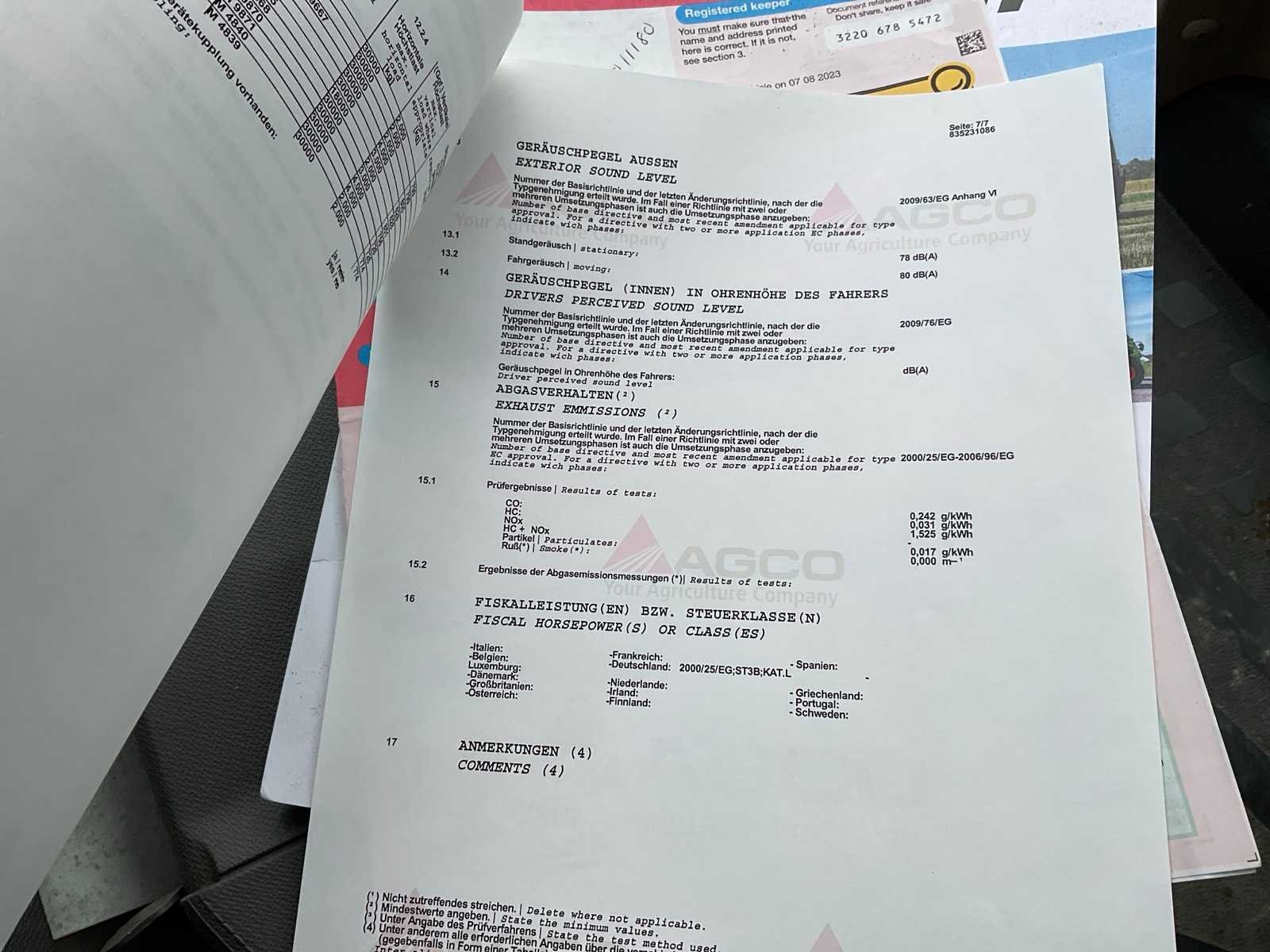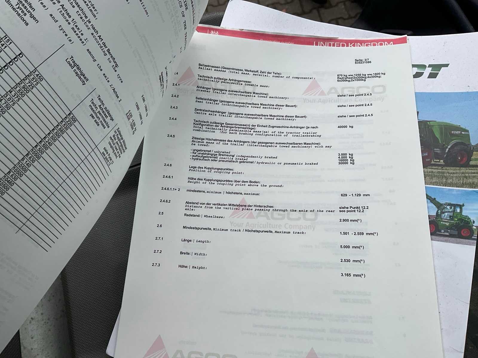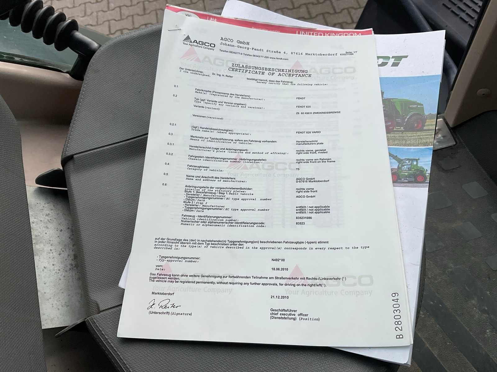 60 km/h, voorzien van: 6x dubbelwerkend hydraulisch ventiel achter, load sensing, hydraulisch remventiel, luchtsysteem, luchtremaansluiting, ondertrekhaak, 1x dubbelwerkend hydraulisch ventiel voor, 1x drukloze retour voor, fronthefinrichting, frontaftakas, geveerde vooras, geveerde cabine, 540E-1000 rpm aftakas, 27mc, Engelse papieren (COC), Deutz 6L dieselmotor Nee Merk: Fendt Type: 826 Vario Bouwjaar: 2011 Serienummer: 835231086 Motorvermogen (kW): 188kW Afgelezen urenstand: 17772 Versnellingsbaktype: Vario Aantal hydraulische ventielen voor: 1 Aantal hydraulische ventielen achter: 6 Bandenmaat voor: Alliance 600/70R30 Bandenmaat achter: Alliance 650/85R38 Frontaftakas: true Cabine: true Luchtgeveerde stoel: true Totale afmeting L: 5500mm Totale afmeting Breedte: 2700mm Totale afmeting Hoogte: 3250mm Nationaliteit documenten: Engels