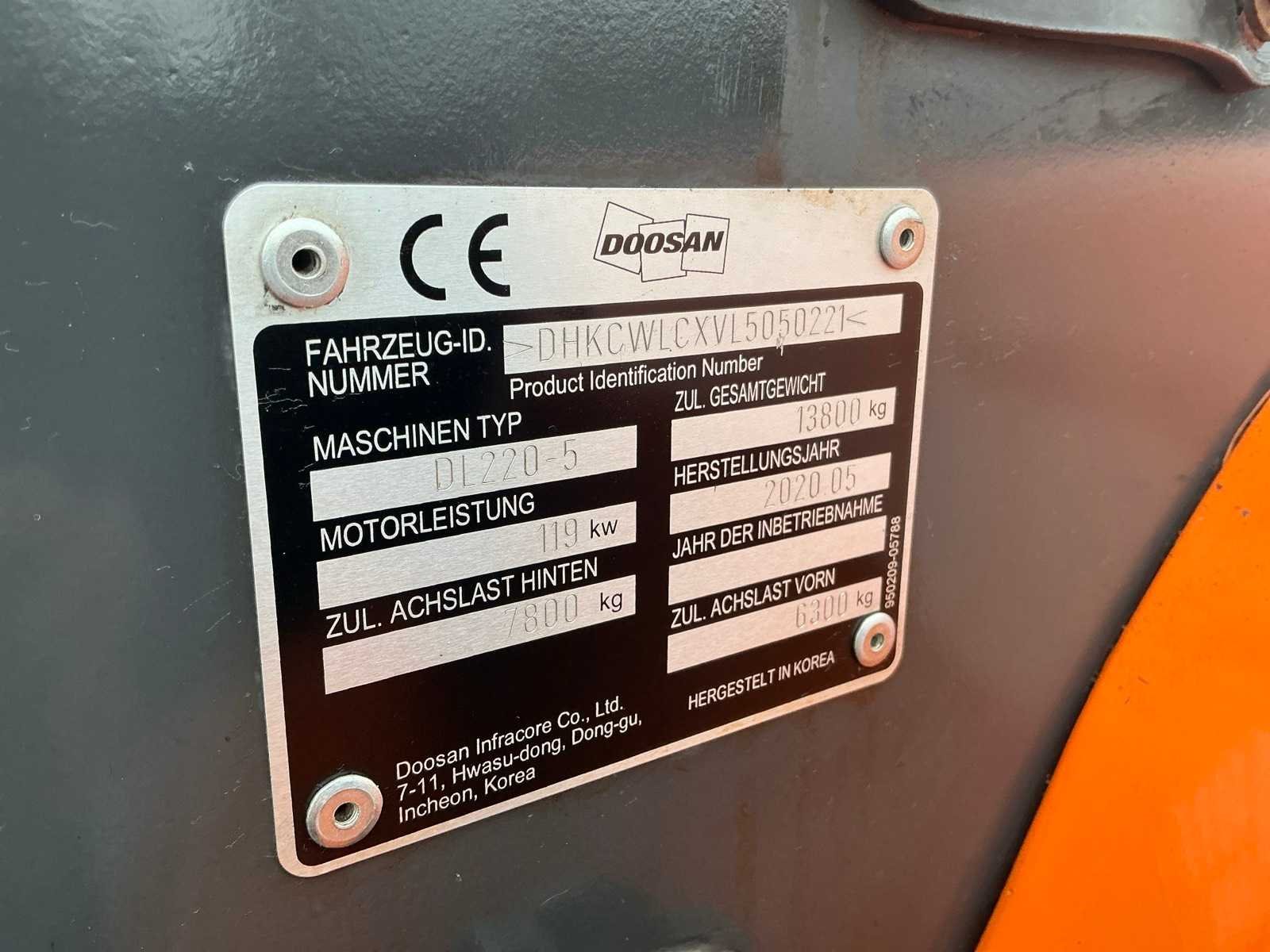 Snelwissel SW Volvo systeem, 3e functie, BSS, 40km snelheid, centrale smering, airco, camera, lucht geveerde verwarmde stoel. Verwarmde spiegels, banden 95%, compleet vol opties. Nee Merk: Doosan Type: DL220-5 Bouwjaar: 2020 Serienummer: DHKCWLCXVL5050221 Merk motor: Doosan Motorvermogen (kW): 119kW Aantal cilinders: 6 Brandstof: Diesel Bedrijfsgewicht: 13800kg Bandenmaat: 20.5R25 Cabine: true Afgelezen urenstand: 5536 Eigen gewicht: 13800kg Totale afmeting L: 6300mm Totale afmeting Breedte: 2480mm Totale afmeting Hoogte: 3300mm