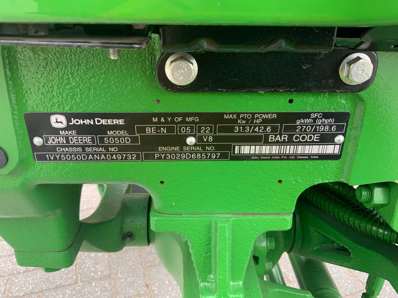 Ongebruikt, slechts 4 uur. PTO 540-540E, voorzien van John Deere 45pk 3 cilinder motor. Euro-3 Nee Merk: John Deere Type: 5050D Bouwjaar: 2022 Motorvermogen (kW): 31.3kW Afgelezen urenstand: 4 Bandenmaat voor: Good Year 8-18 Bandenmaat achter: Good Year 14.9-28 Eigen gewicht: 1975kg Totale afmeting L: 3200mm Totale afmeting Breedte: 1860mm Totale afmeting Hoogte: 1700mm Chassisnummer: 1VY5050DANA049732