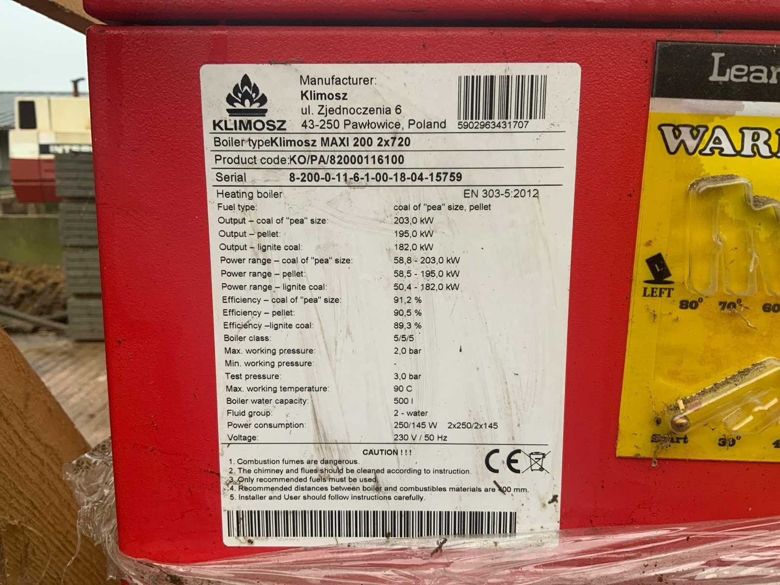 Installatie staat op 3 pallets en losse bunker. Betreft ongebruikte kachel. Voorzien van extra 4 weg esbe klep. No Merk: Klimosz Type: Maxi 200 2x720 Bouwjaar: 2018 Serienummer: 820000116100 Verwarmingscapaciteit: 203.00kW