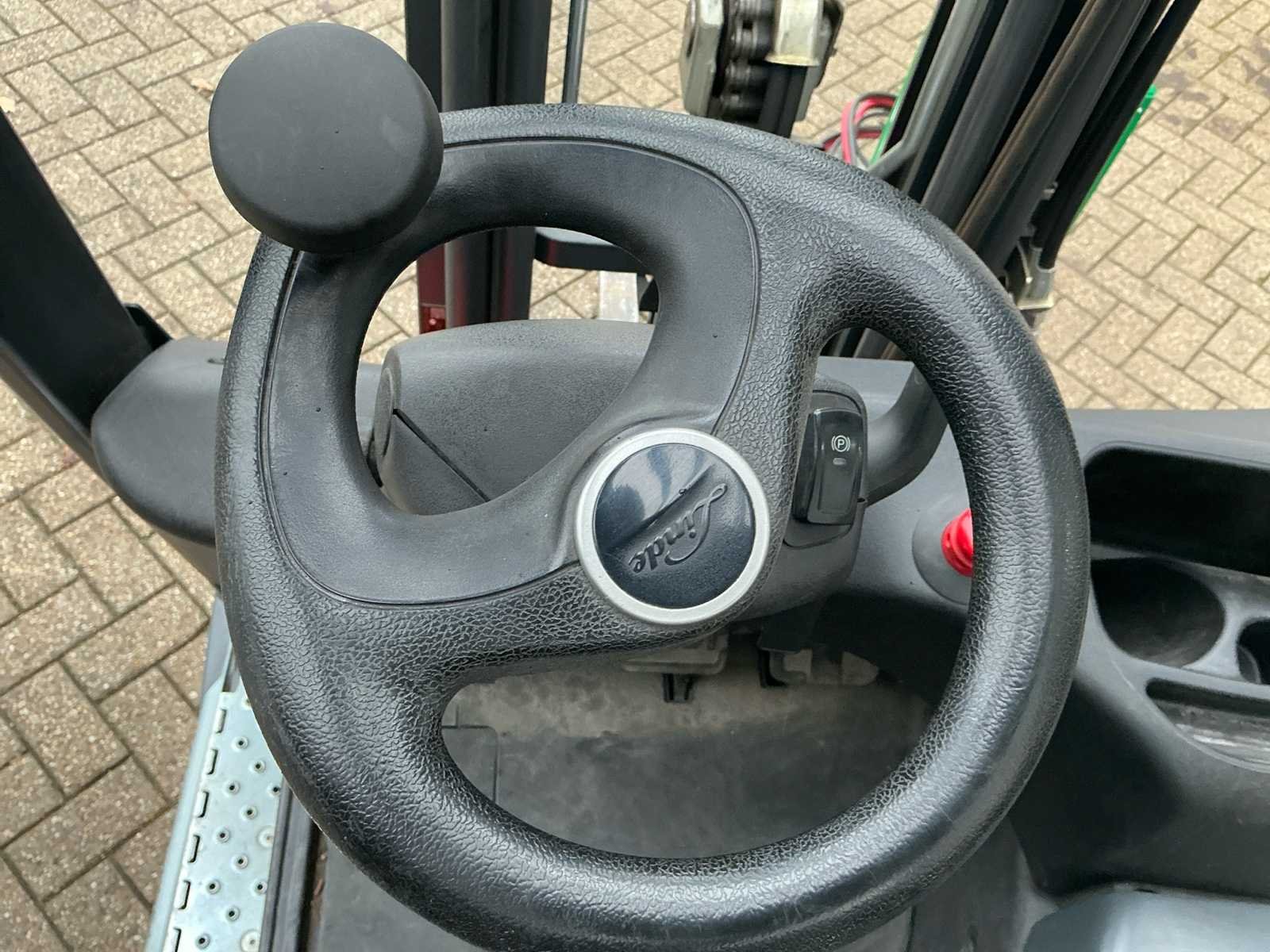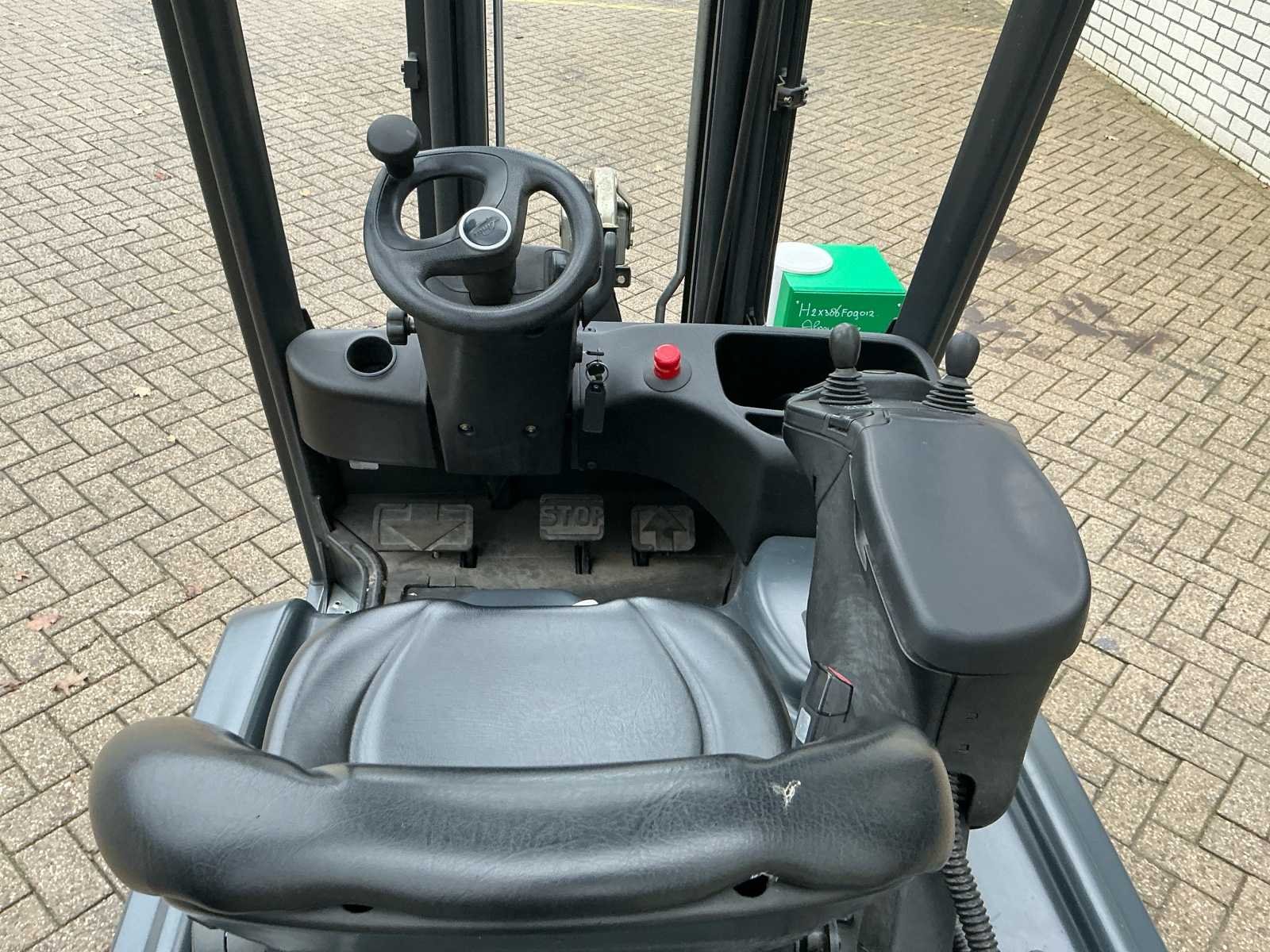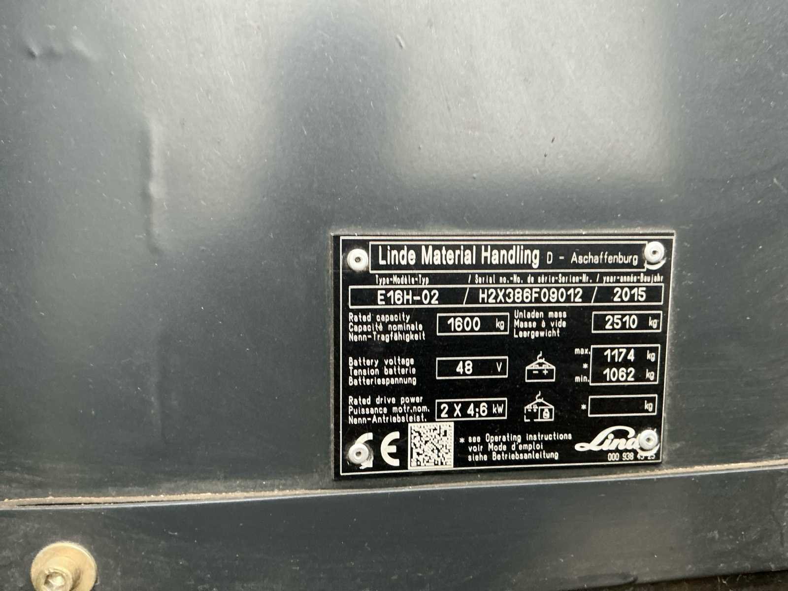 Werkend No Merk: Linde Type: E16H-02 Evo Bouwjaar: 2015 Brandstof: Elektrisch Mast: Triple Soort band: Vol rubber Aantal wielen: 4 Afgelezen urenstand: 13024 Accu lader: true Free-lift: true Side-shift: true Eigen gewicht: 3680kg Hefvermogen: 1600kg Lepellengte: 1200mm Max. hefhoogte: 4650mm Vol rubber banden: true Minimale doorrijhoogte: 2150mm Totale afmeting L: 2200mm Totale afmeting Breedte: 110mm Totale afmeting Hoogte: 2150mm