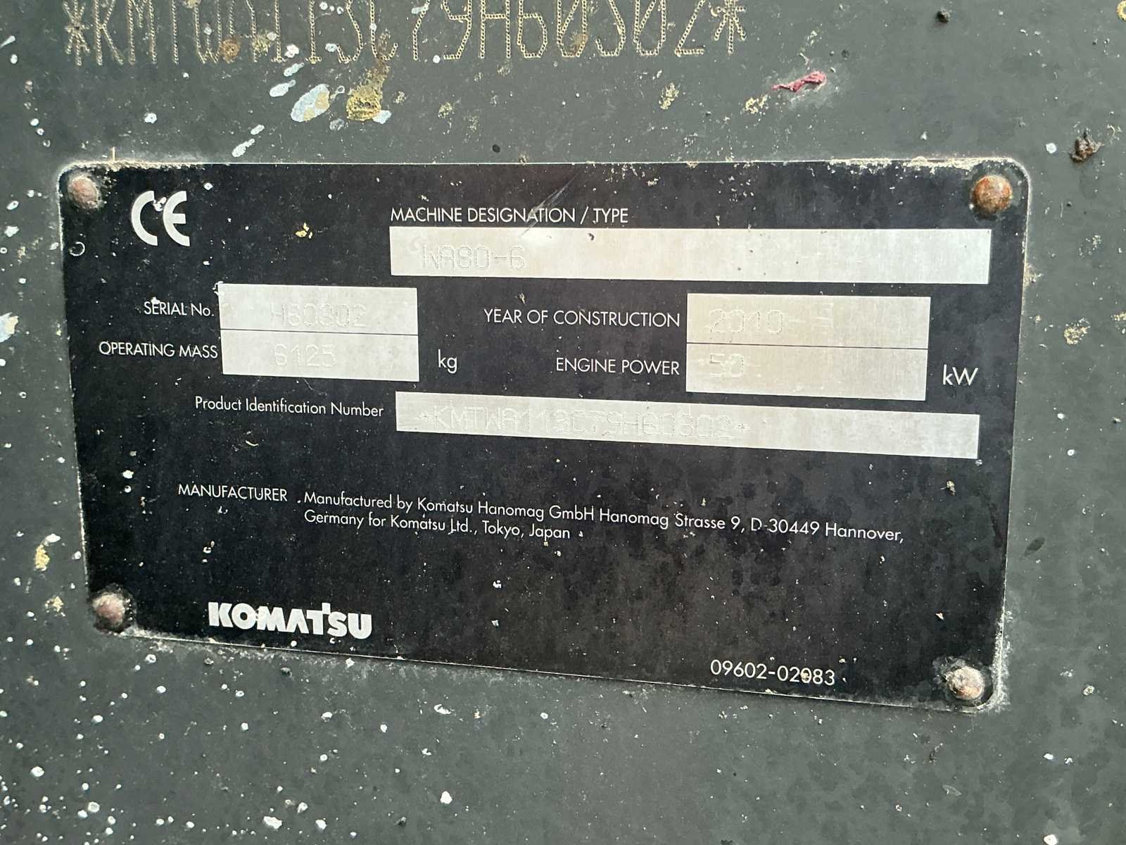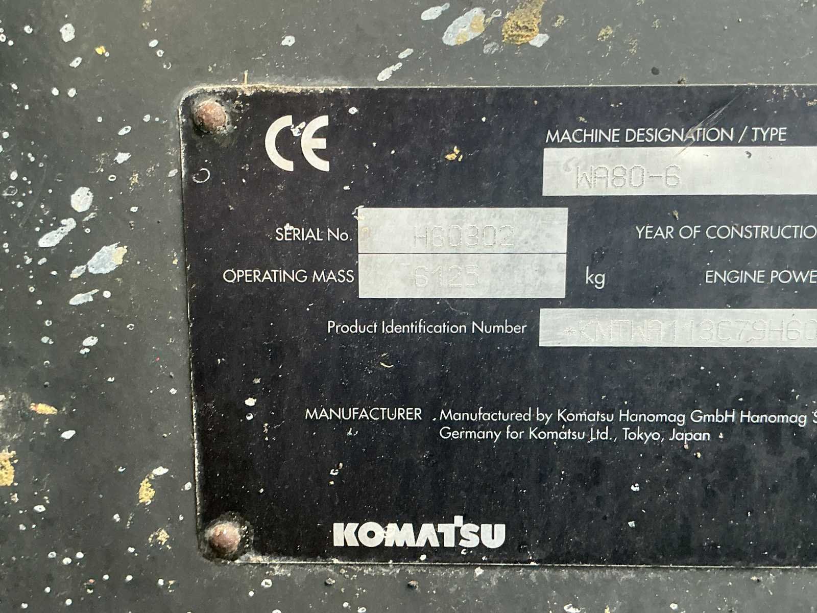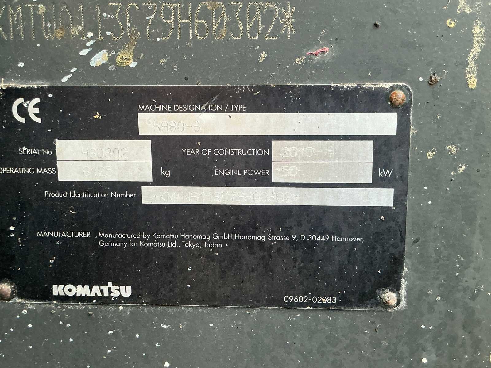 Nee Merk: Komatsu Type: WA80-6 Bouwjaar: 2010 Serienummer: H60302 Merk motor: Komatsu Motorvermogen (kW): 50kW Aantal cilinders: 4 Brandstof: Diesel Graafbak afm. b: 2000mm Bandenmaat: 405/70R20 Cabine: true Afgelezen urenstand: 14367 Eigen gewicht: 6125kg Totale afmeting L: 5900mm Totale afmeting Breedte: 2000mm Totale afmeting Hoogte: 2650mm