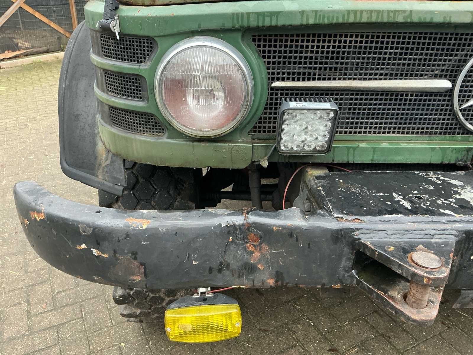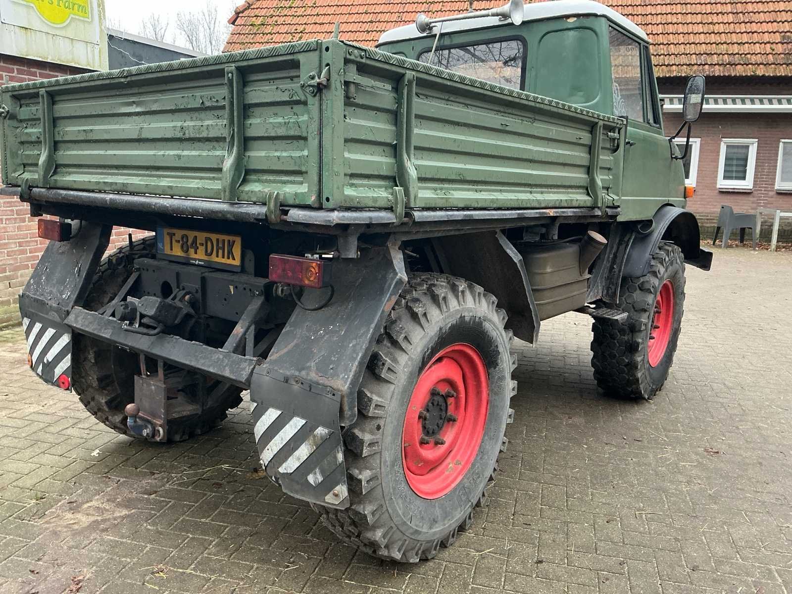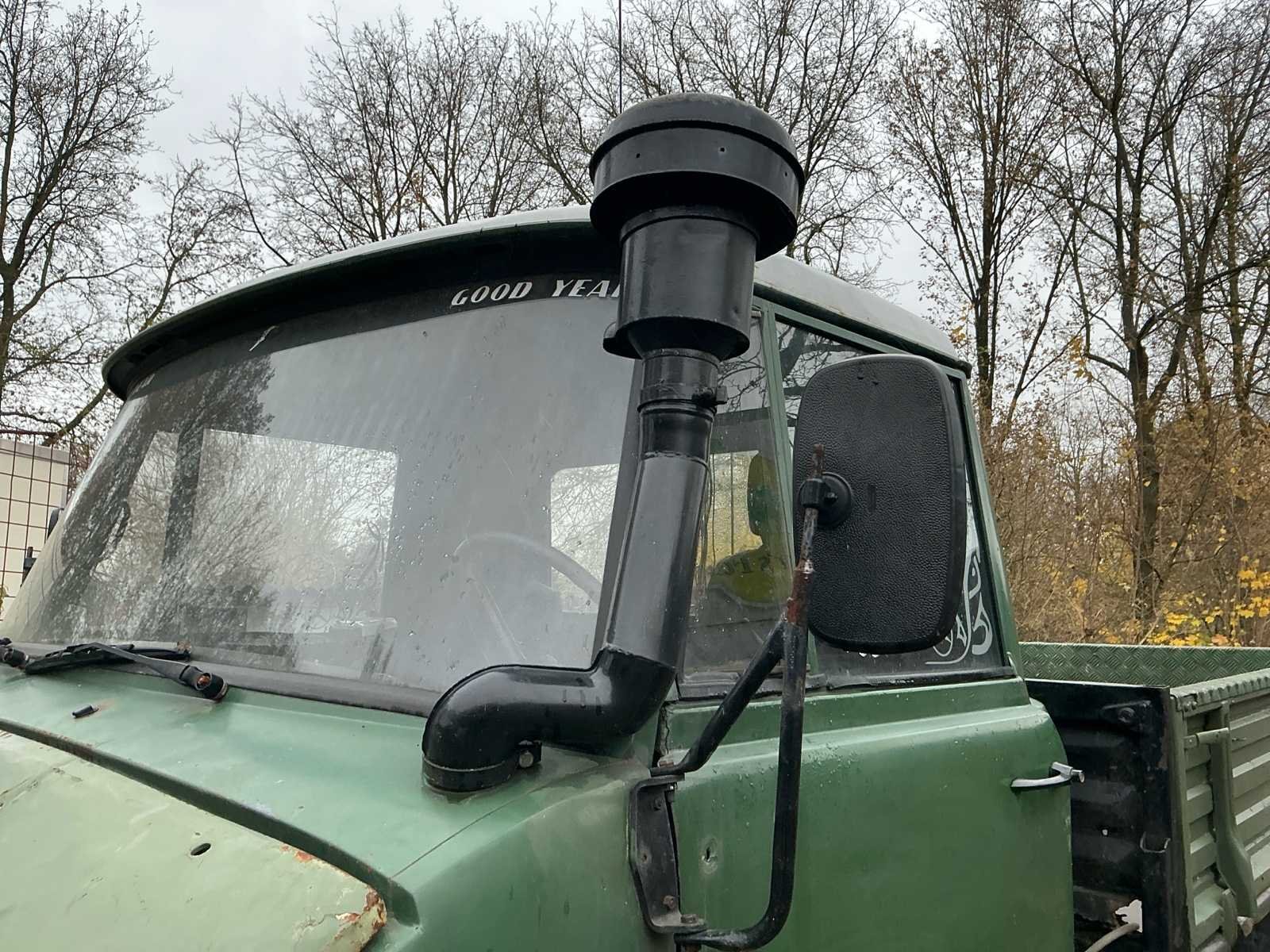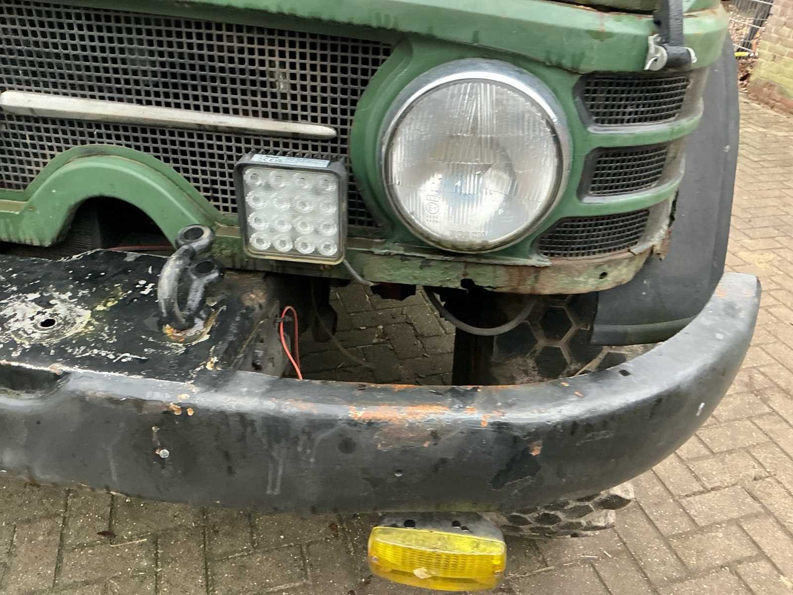 Voorzien van: trekhaak, vangmuil, werkverlichting, luchthoorn, laadbak met zijschotten, trekhaak voor, Accu's zijn zwak Nee Merk: Mercedes-Benz Type: Unimog 406 Bouwjaar: 1972 Serienummer: 121 Bouwjaar: 1972 Kenteken: T-84-DHK Type motor: Mercedes-Benz Brandstof: Diesel Eigen gewicht: 5000kg Afgelezen urenstand: 16506hr Totale afmeting L: 4000mm Totale afmeting Breedte: 2050mm Totale afmeting Hoogte: 2400mm
