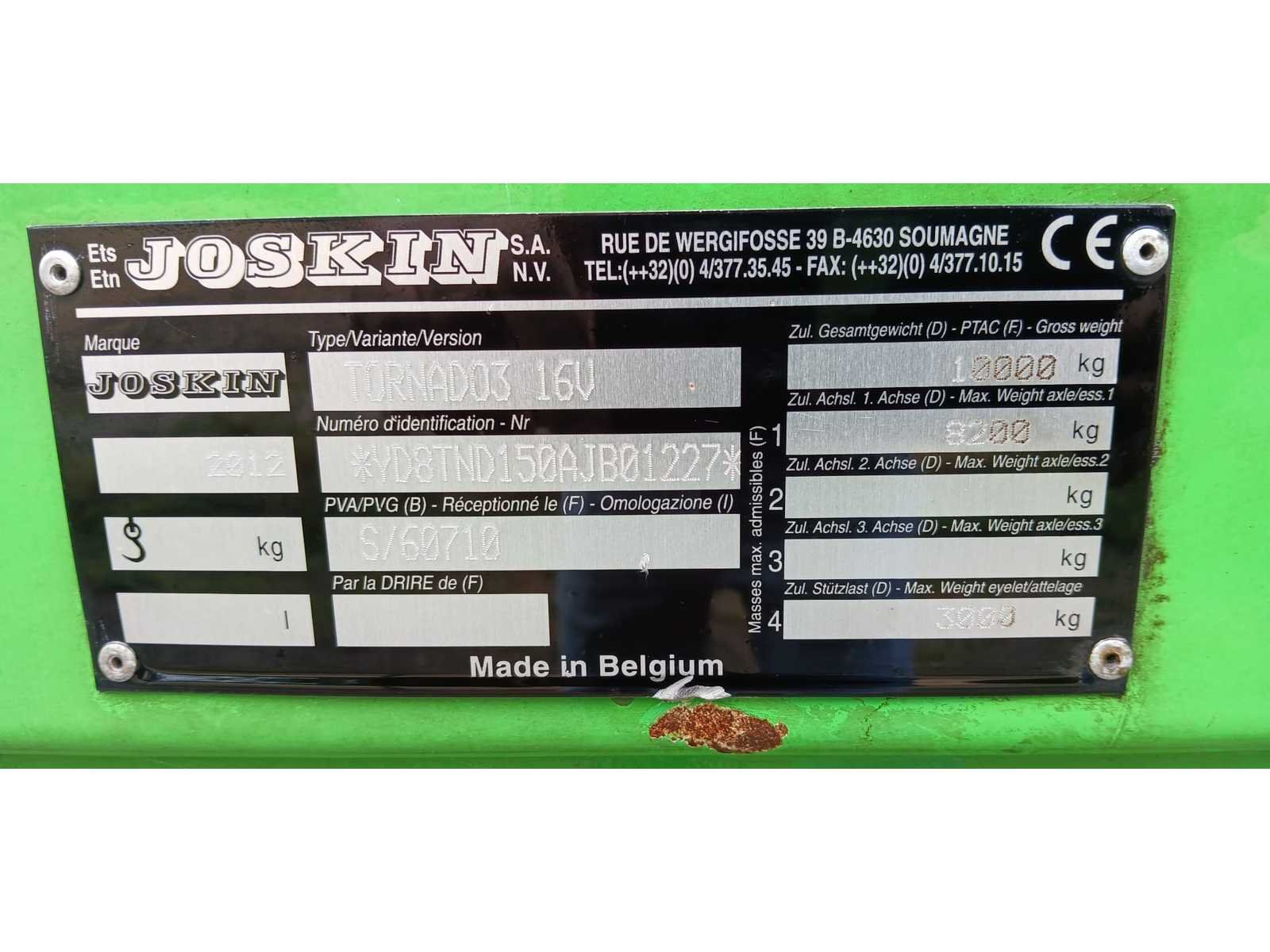 Voorzien van: verlichting, aftakas, hydrauliekaansluitingen, hydraulische steunpoot, hydraulische doseerklep achterzijde, verticale verspreidingswalsen, horizontale verspreidingswalsen. No Merk: Joskin Type: Tornado3 5516/15V Bouwjaar: 2012 Kenteken: LNR-13-J Serienummer: YD8TND150AJB01227 Totale afmeting L: 8000mm Totale afmeting Breedte: 2800mm Totale afmeting Hoogte: 3100mm