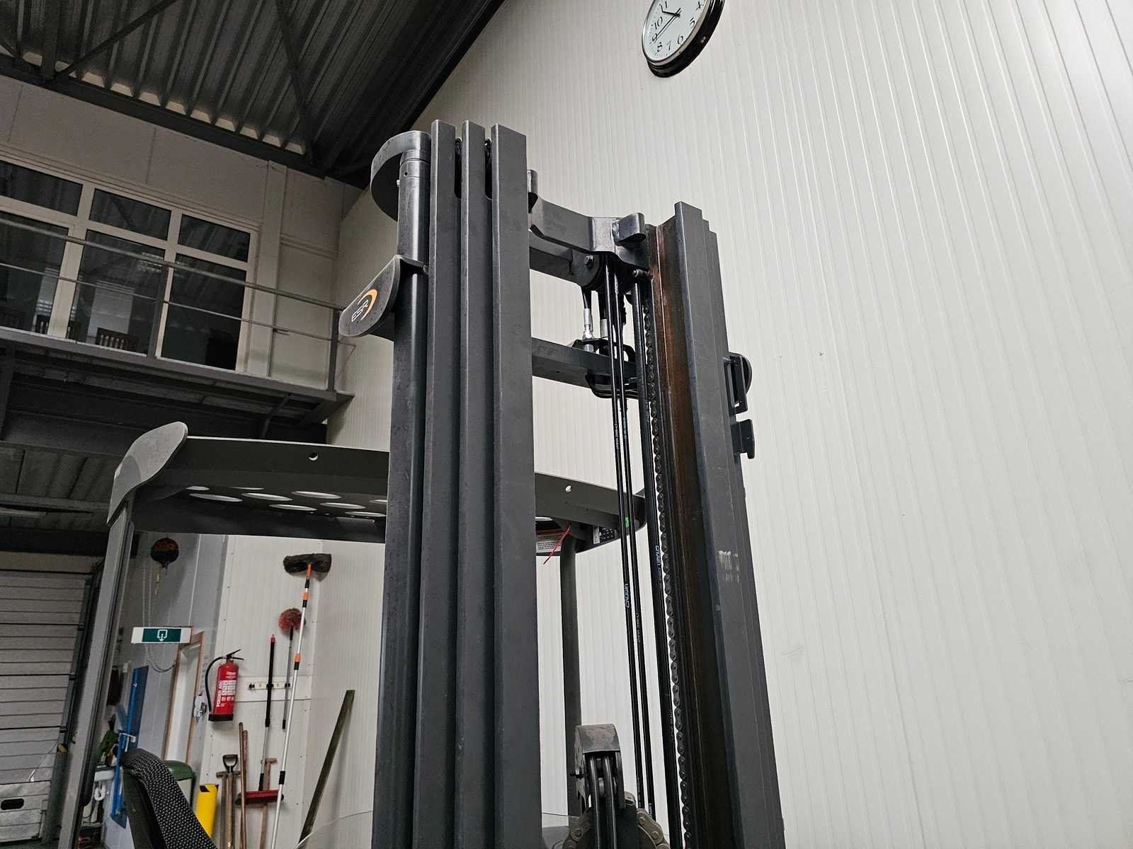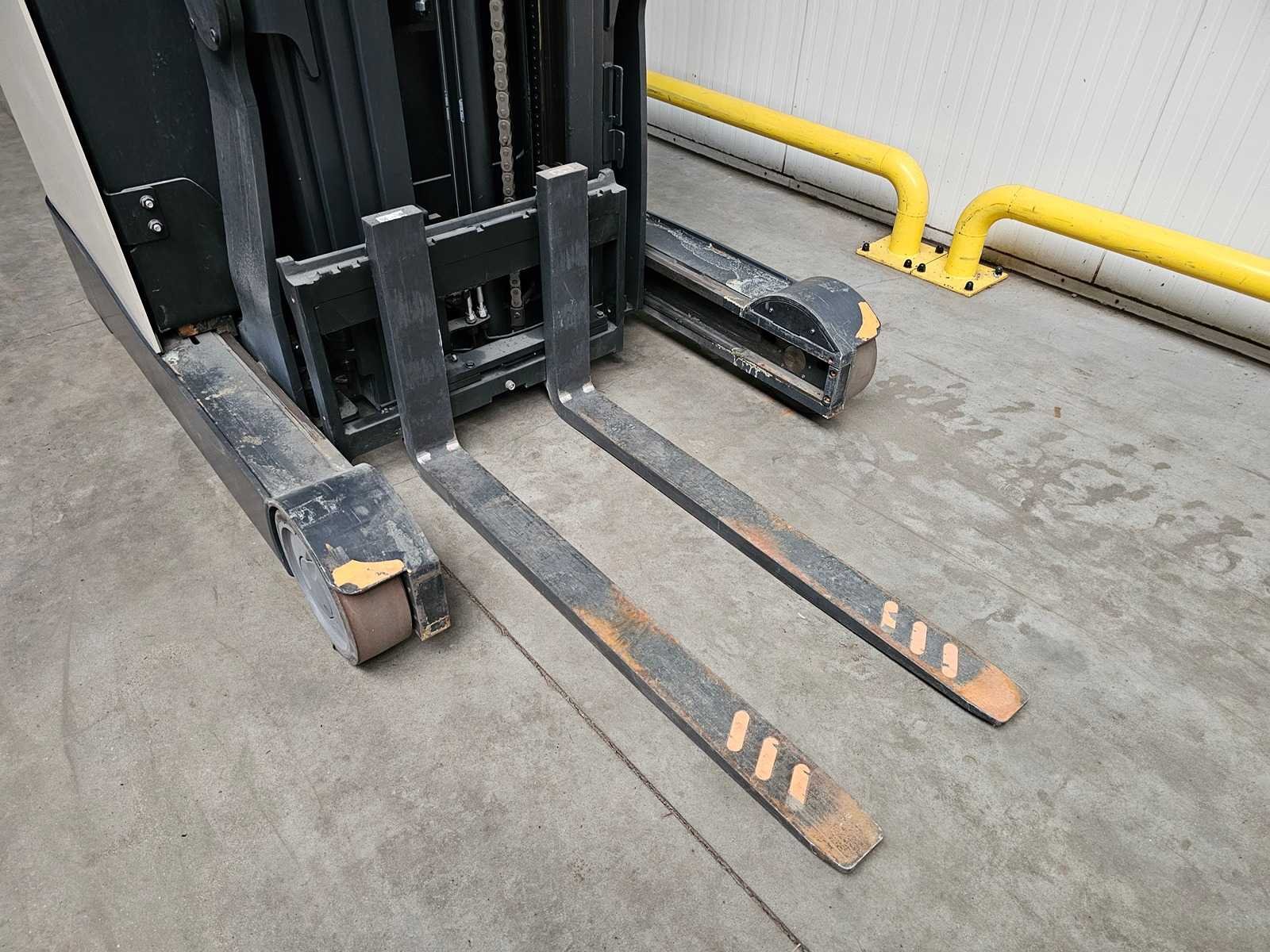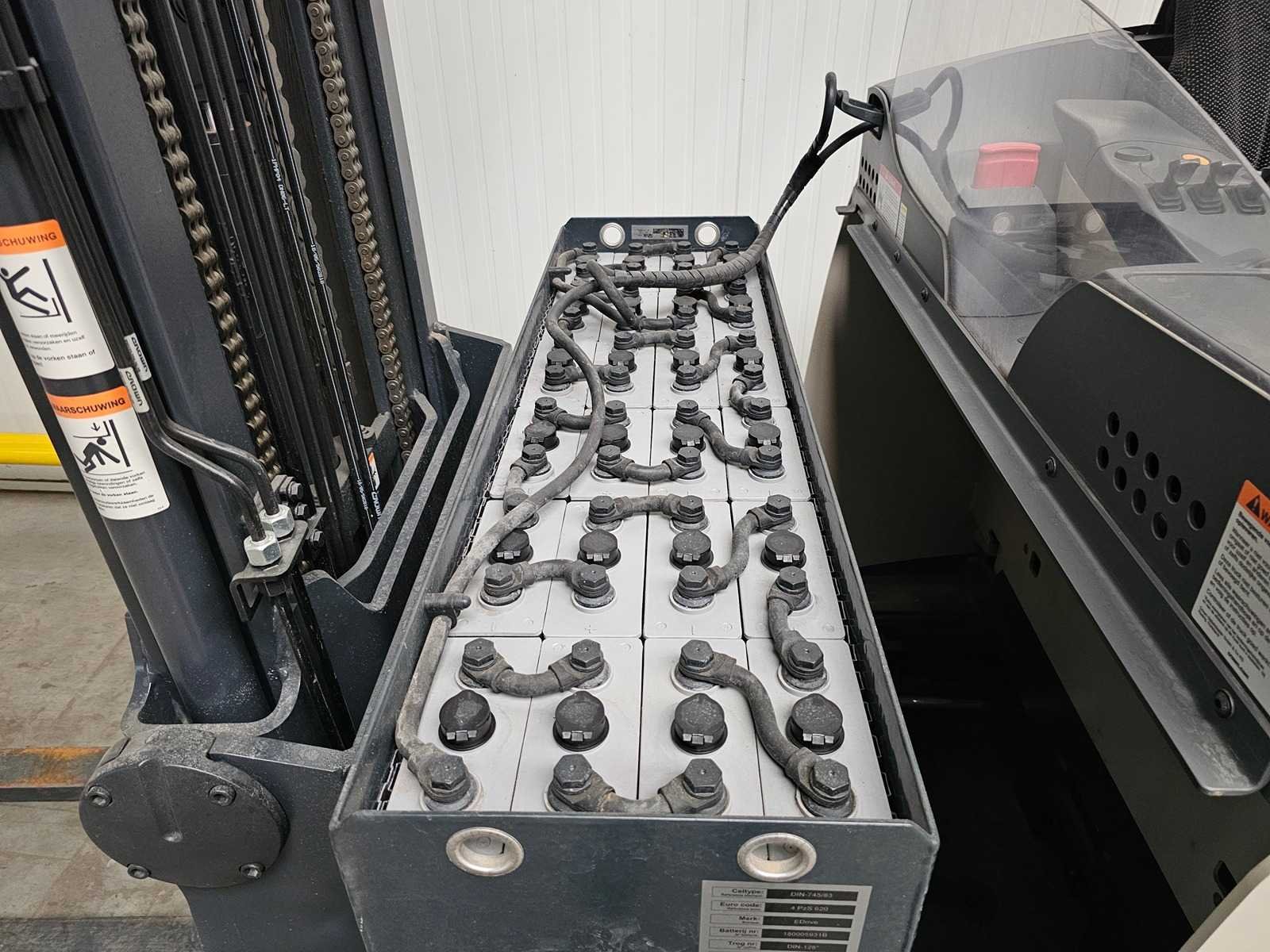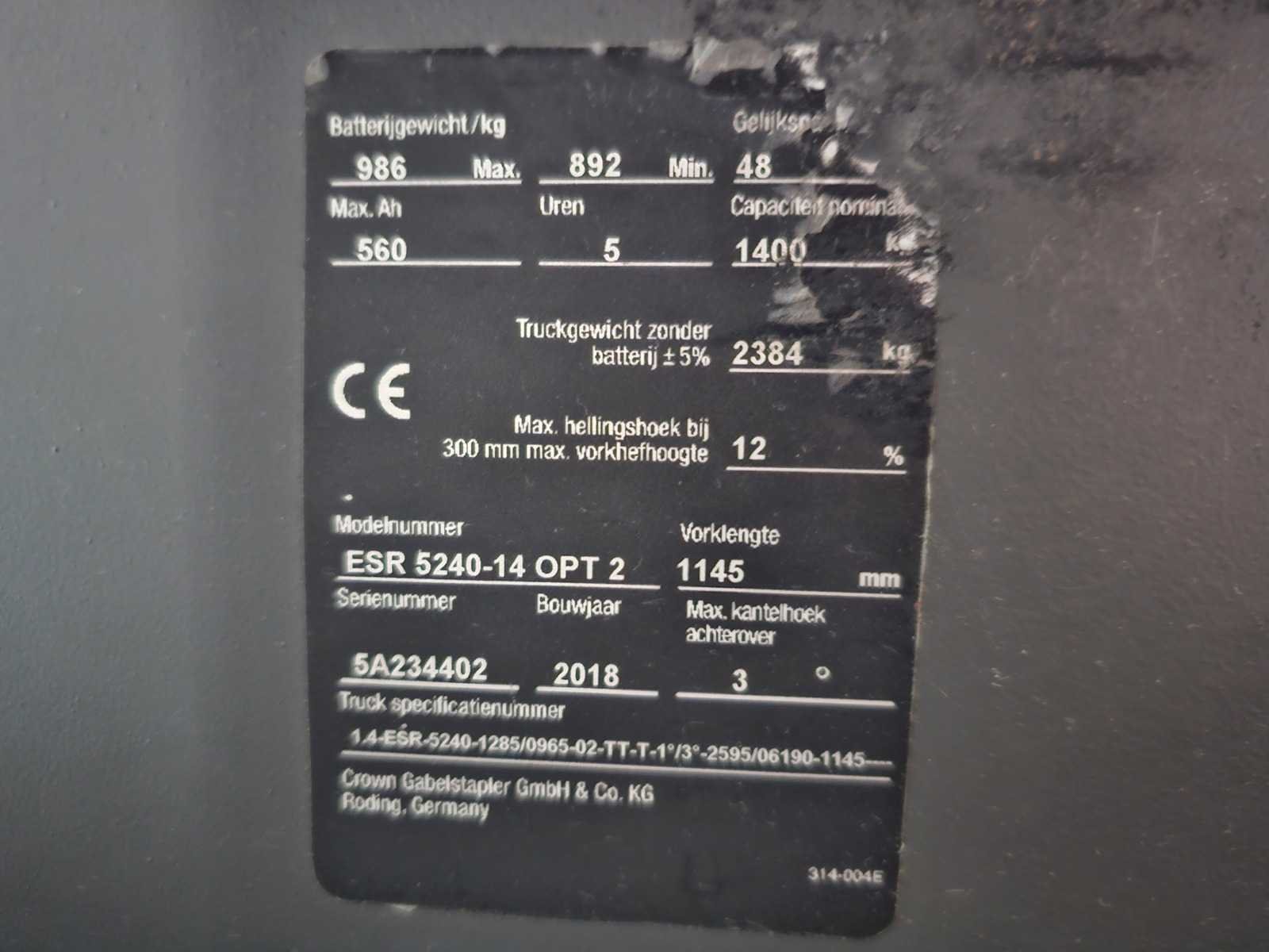 Voorzien van: Side shift, Triplo Mast, Acculader met 380V aansluiting. Nee Merk: Crown Type: ESR 5240-14 Bouwjaar: 2018 Serienummer: 5A234402 Brandstof: Electrisch Mast: Triplo Soort band: Vol rubber Aantal wielen: 3 Afgelezen urenstand: 1631 Accu lader: true Free-lift: true Side-shift: true Triple mast: true Eigen gewicht: 3370kg Hefvermogen: 1400kg Lepellengte: 1145mm Hefhoogte: 6190mm Totale afmeting L: 2400mm Totale afmeting Breedte: 1300mm Totale afmeting Hoogte: 2600mm Elektrisch: true Vol rubber banden: true Leveringsvoorwaarden: Geladen op vrachtwagen