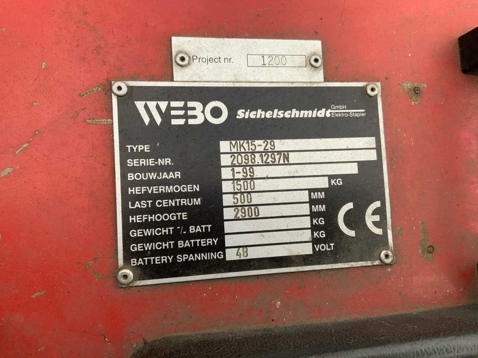 Zonder lader Nee Merk: Webo Type: MK15-29 Bouwjaar: 1999 Serienummer: 2098.1297N Brandstof: Elektrisch Aantal wielen: 3 Afgelezen urenstand: 18746 Side-shift: true Hefvermogen: 1500kg Lepellengte: 1050mm Max. hefhoogte: 2900mm Vol rubber banden: true Minimale doorrijhoogte: 2000mm Totale afmeting L: 2900mm Totale afmeting Breedte: 950mm Leveringsvoorwaarden: Niet gefundeerd - onverpakt